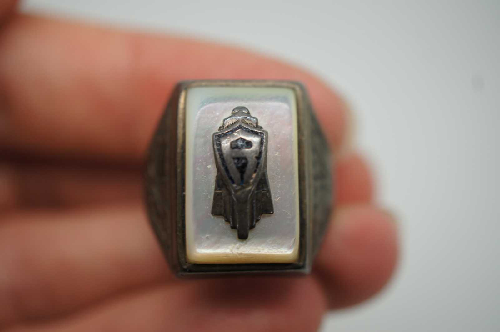 Antique art deco sterling silver 925 signet ring with the initial R on a deco banner, mounted on a mother of pearl setting. Includes green celluloid ring box.