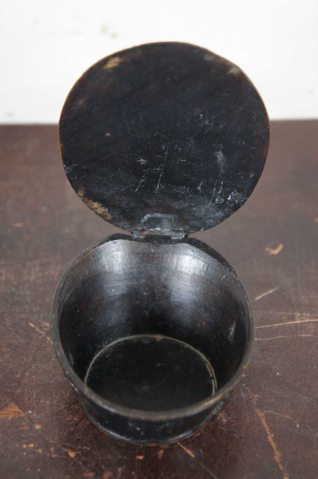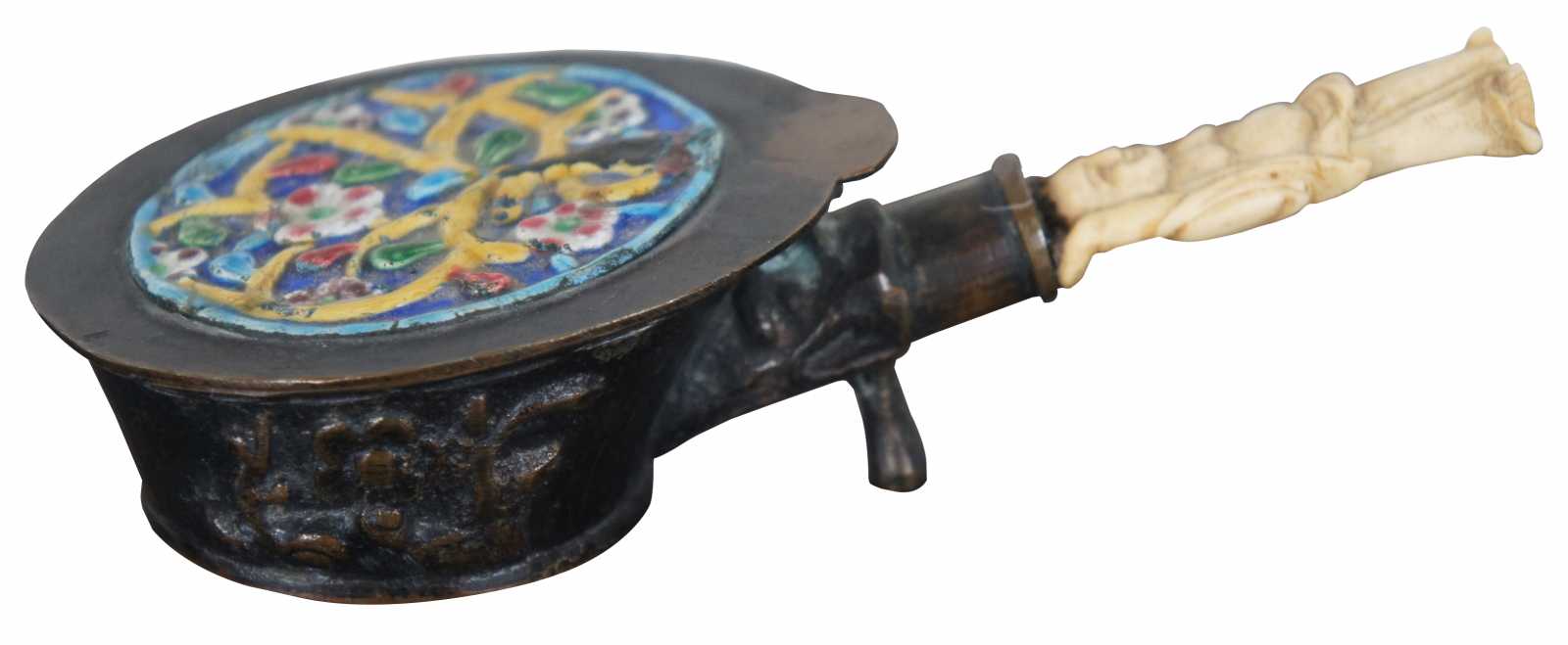 Antique Chinese lidded silk iron in stamped bronze with enamel accents on the lid and carved figural buddha handle.