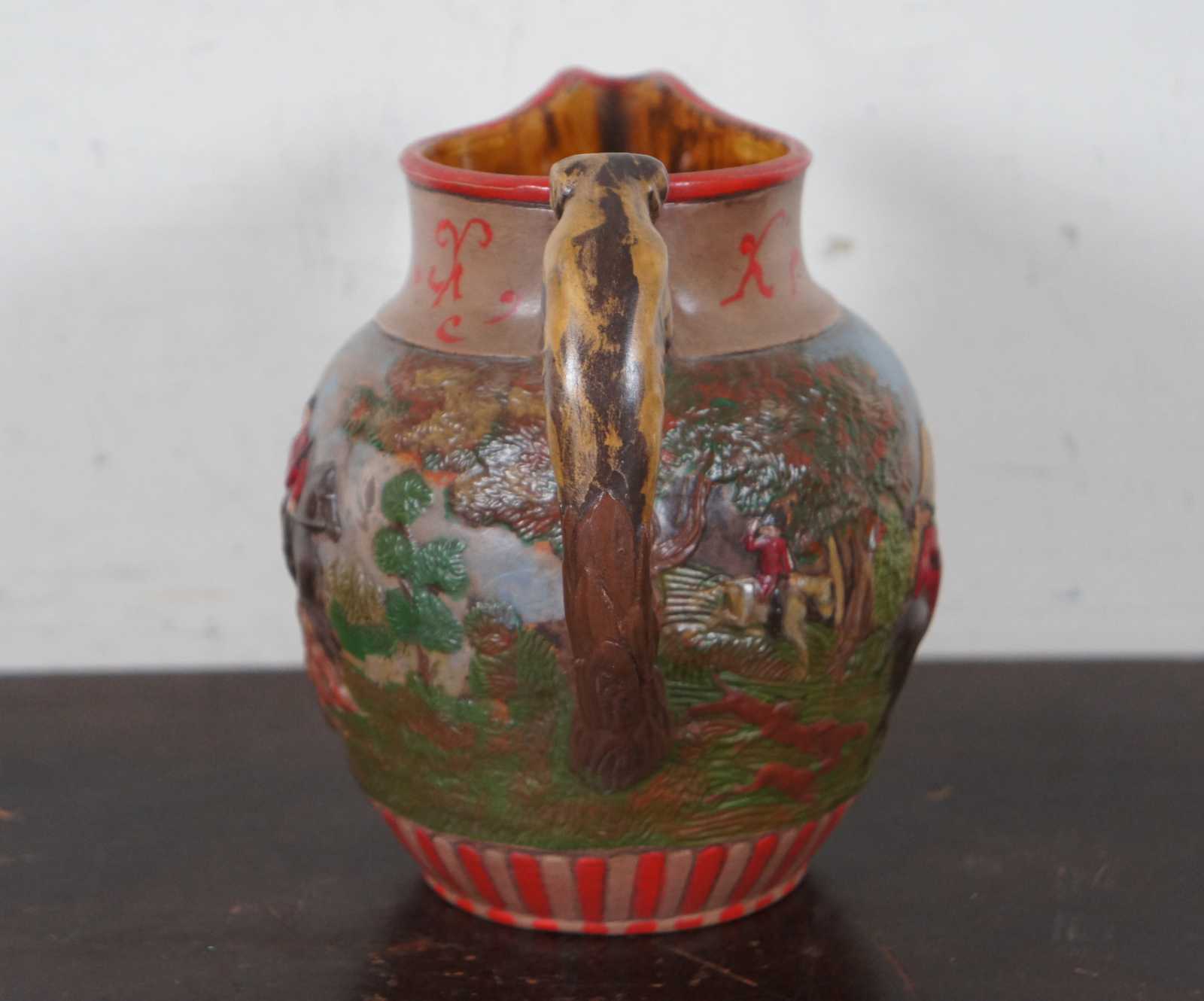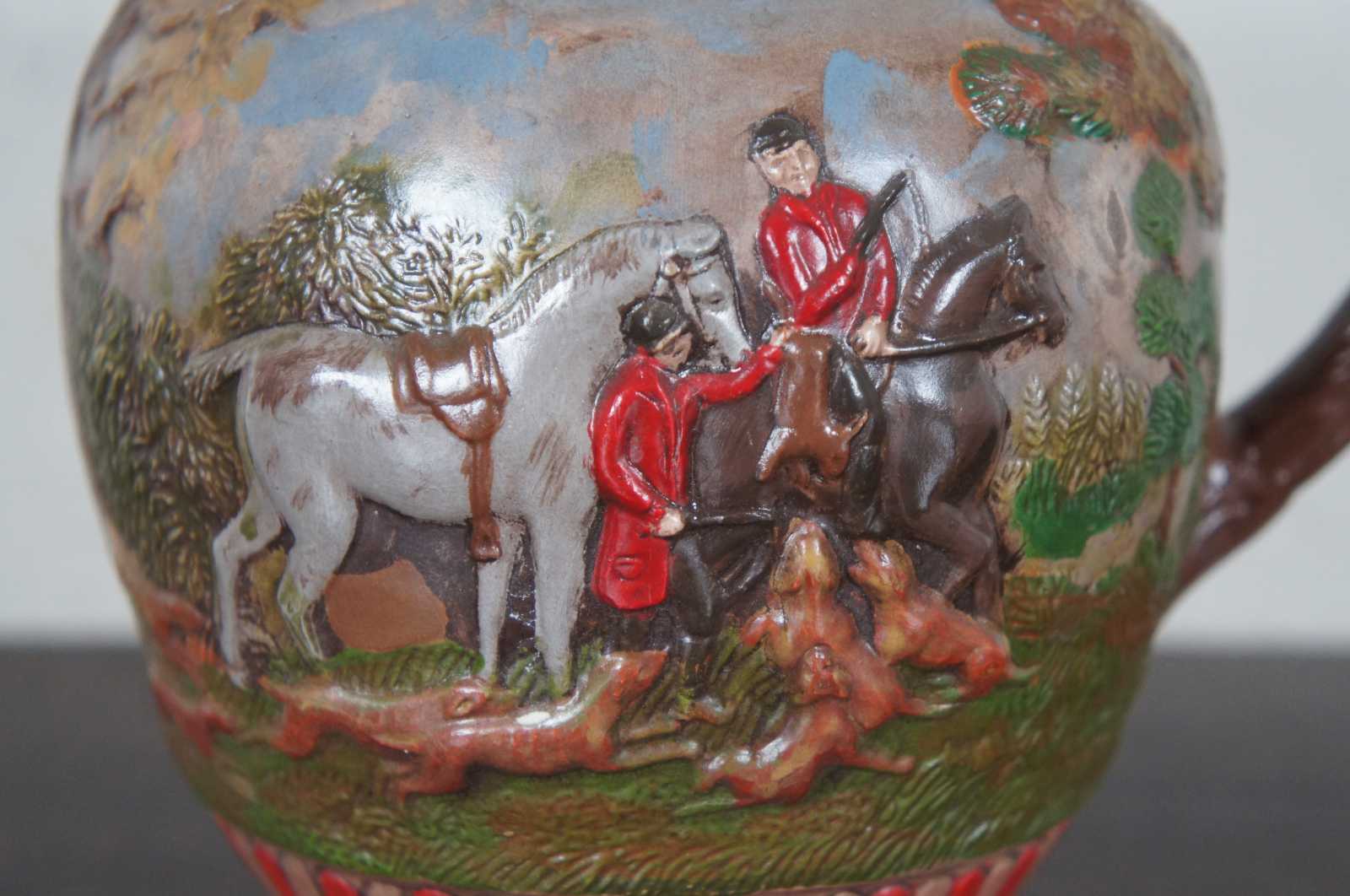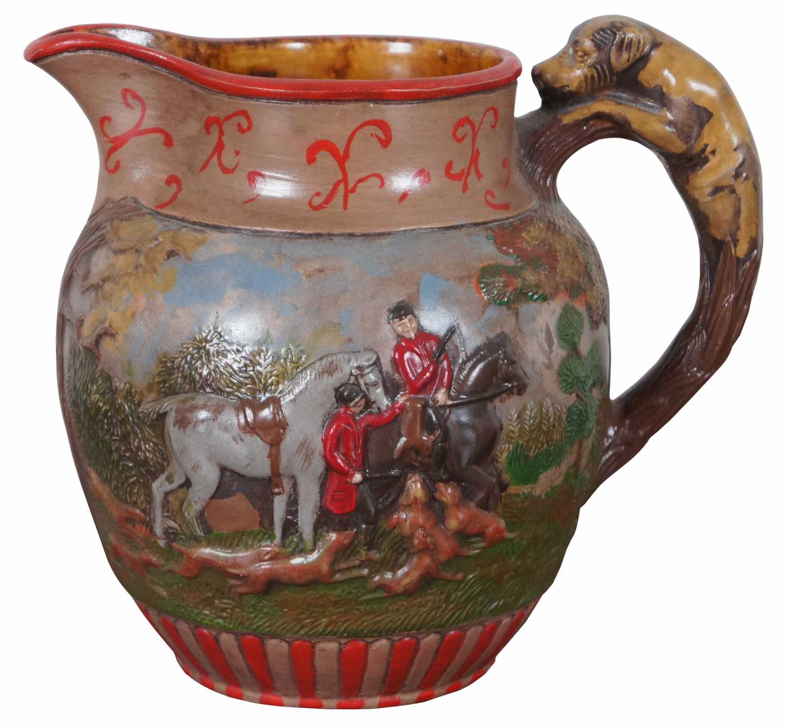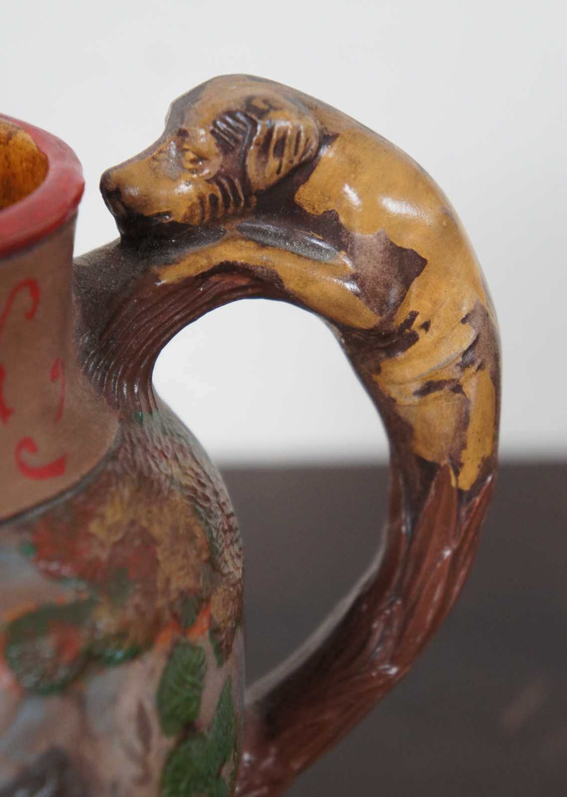 Vintage ceramic jug showing a hand painted British fox or rabbit hunting scene with a hound dog handle, marked LD 1985 on the base.