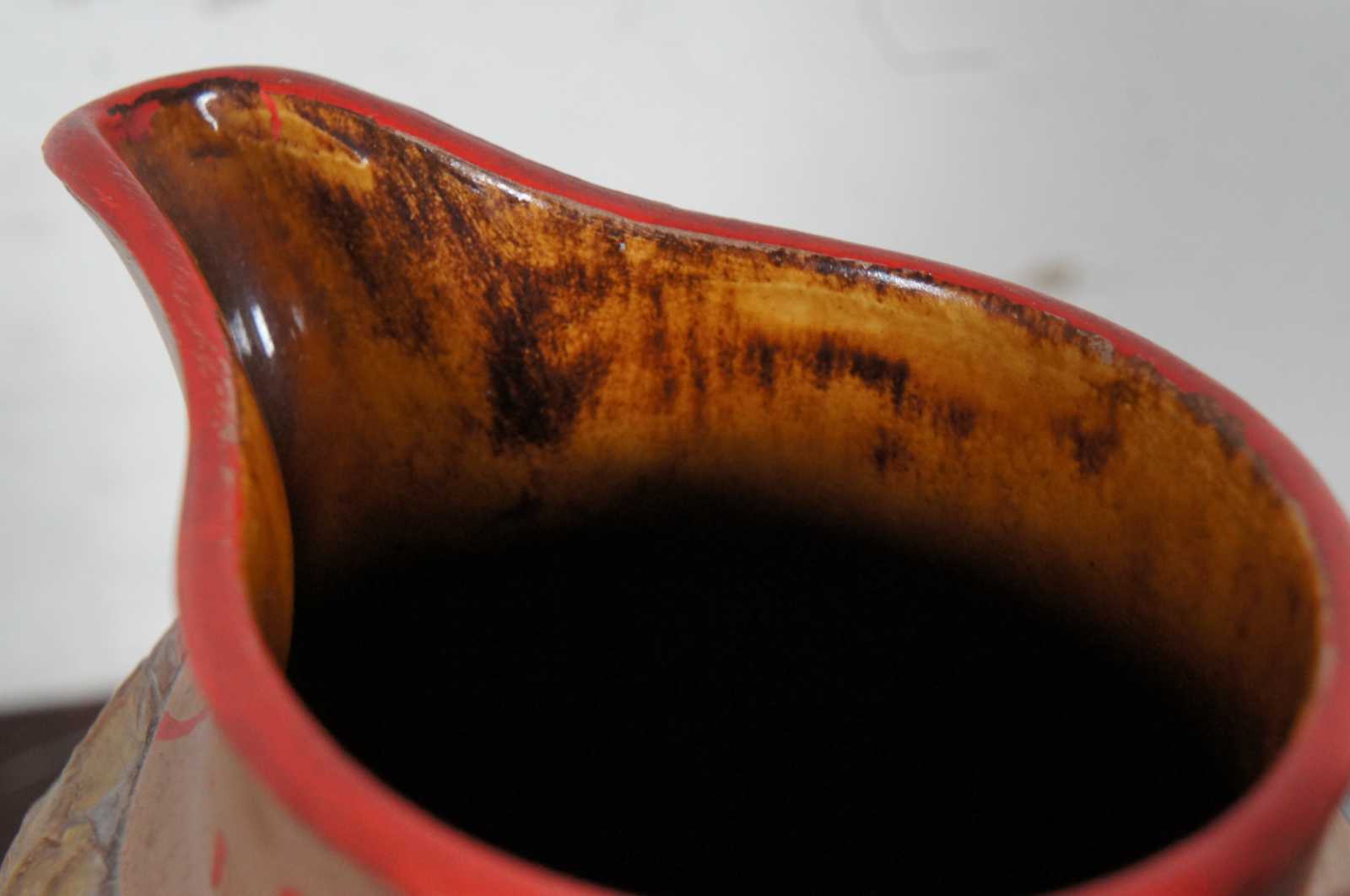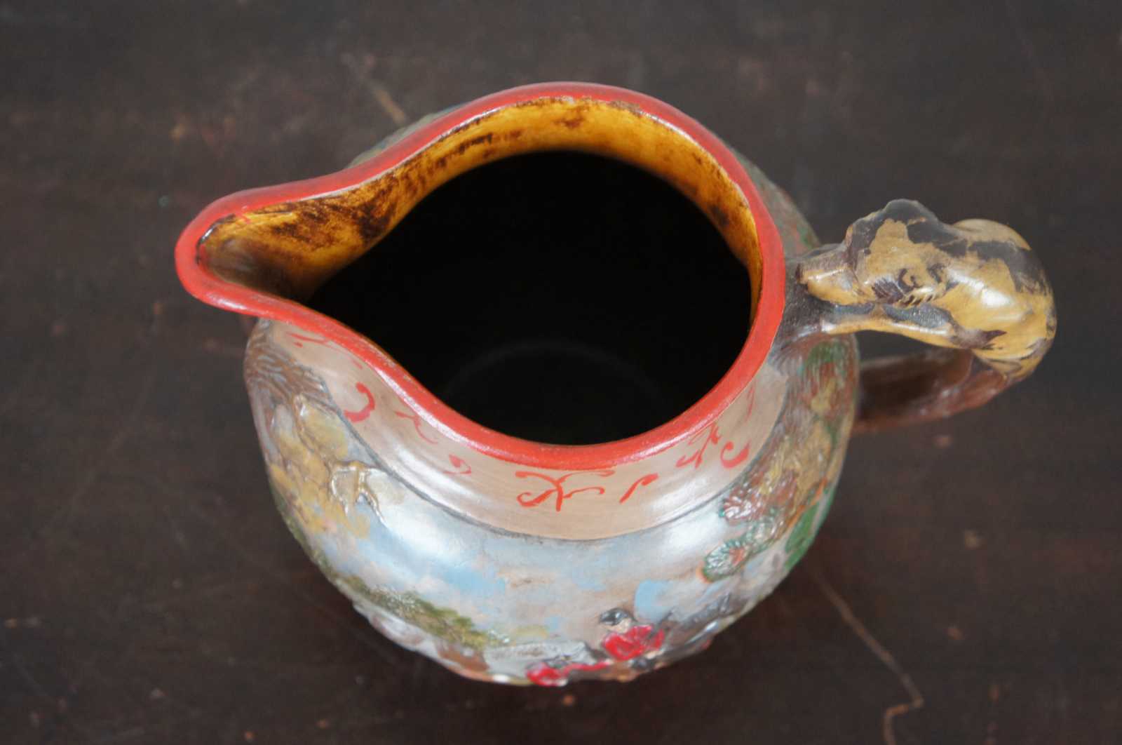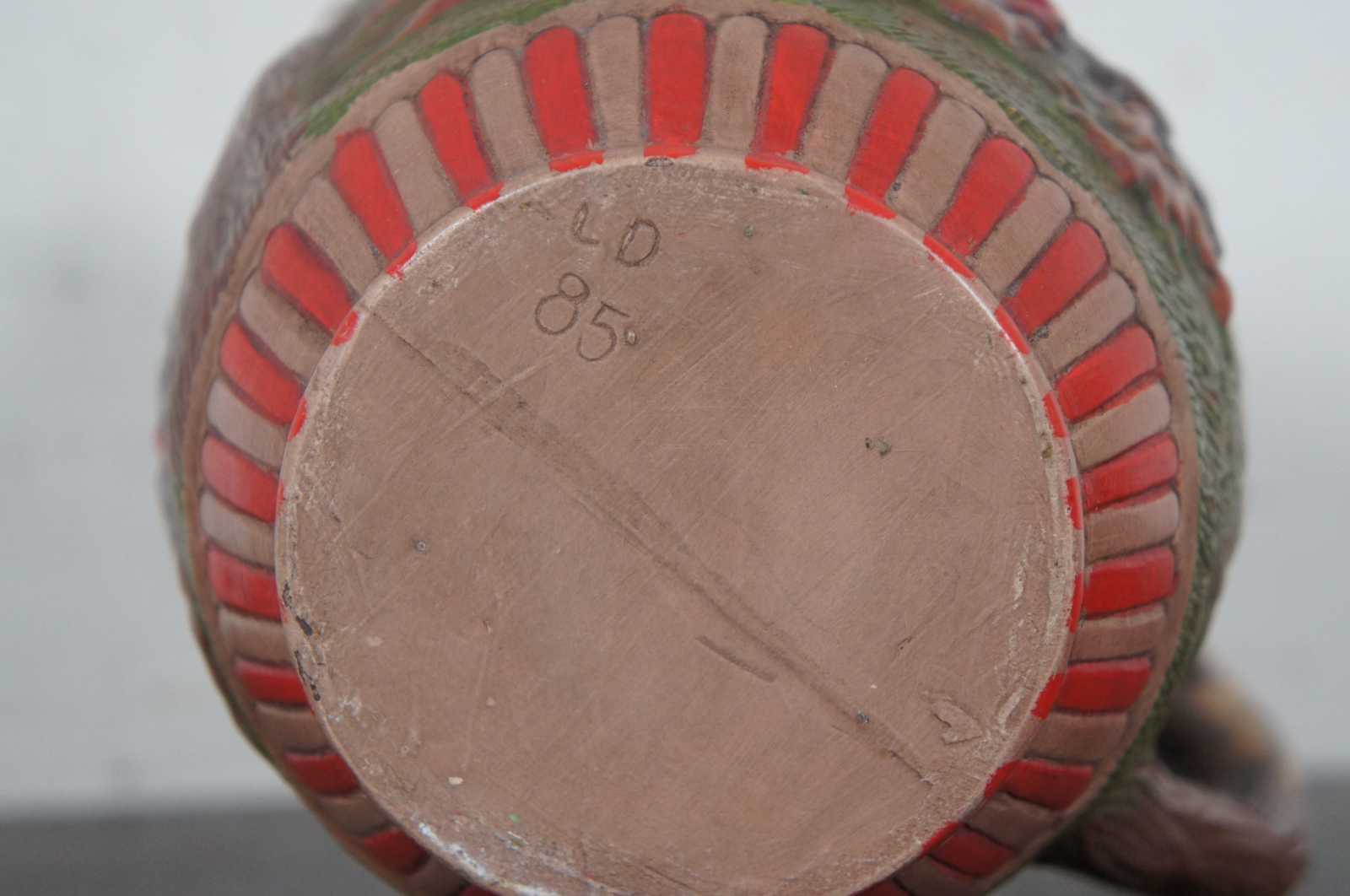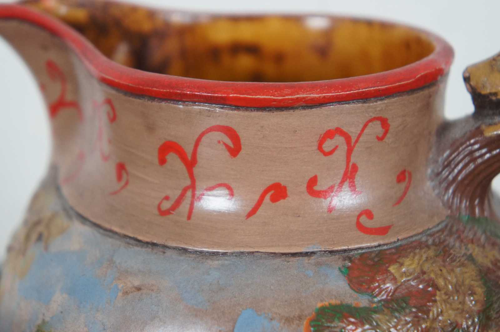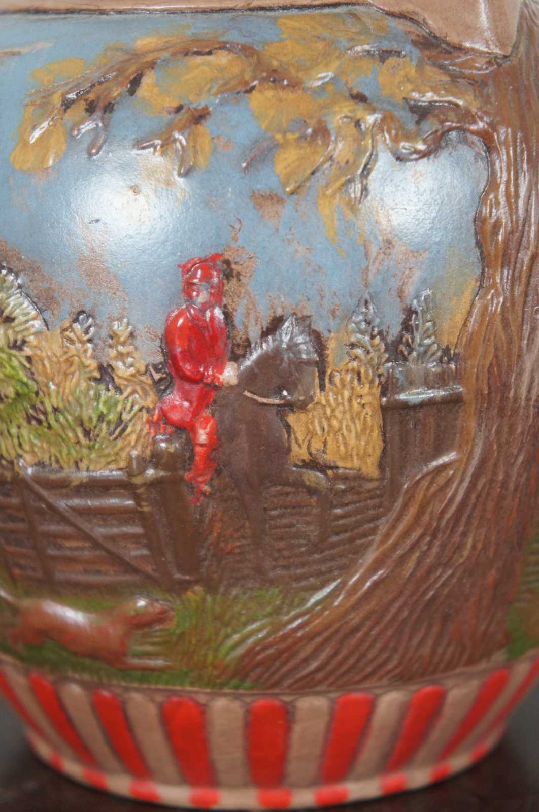 Vintage ceramic jug showing a hand painted British fox or rabbit hunting scene with a hound dog handle, marked LD 1985 on the base.
