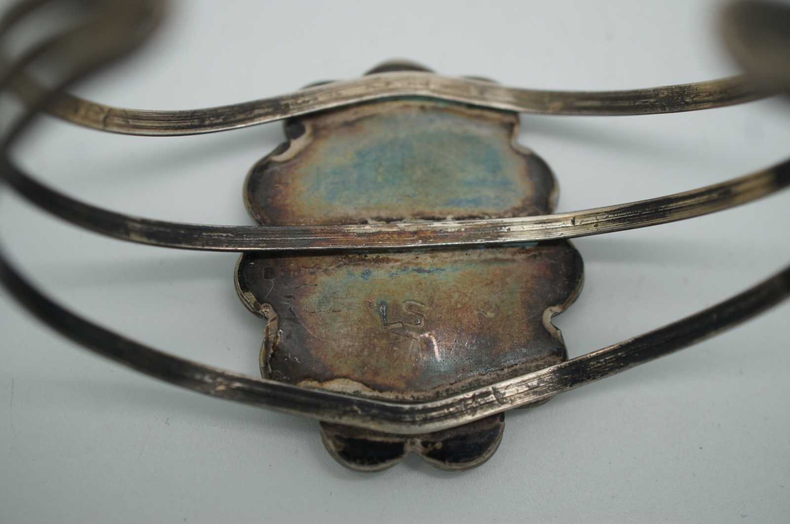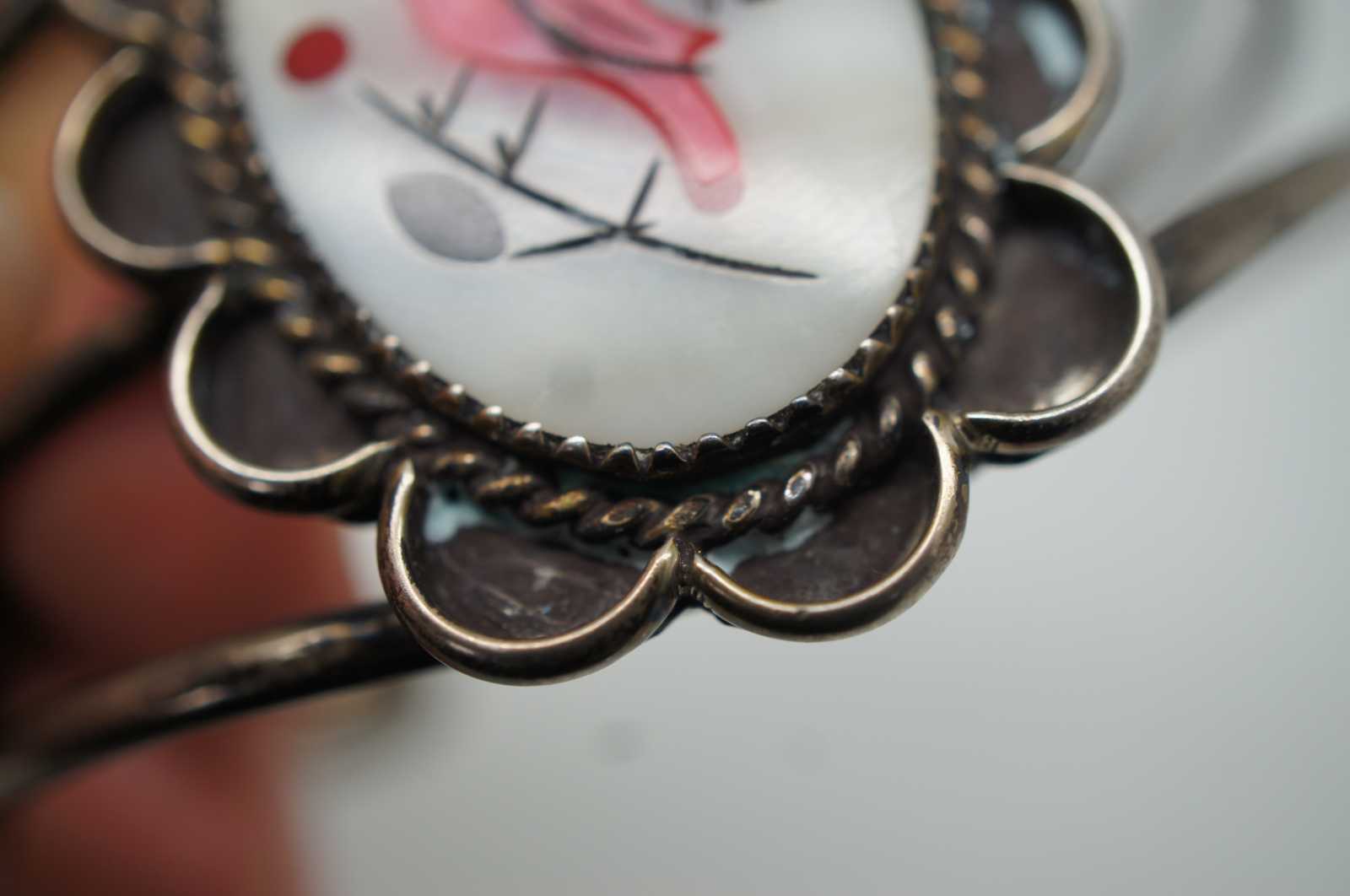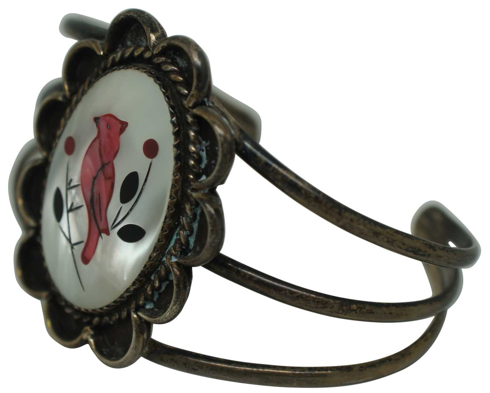 Vintage Zuni Native American / Navajo sterling silver cuff bracelet with inlaid mother of pearl medallion carved and painted with a coral cardinal and branches. Initialed LS on bottom.