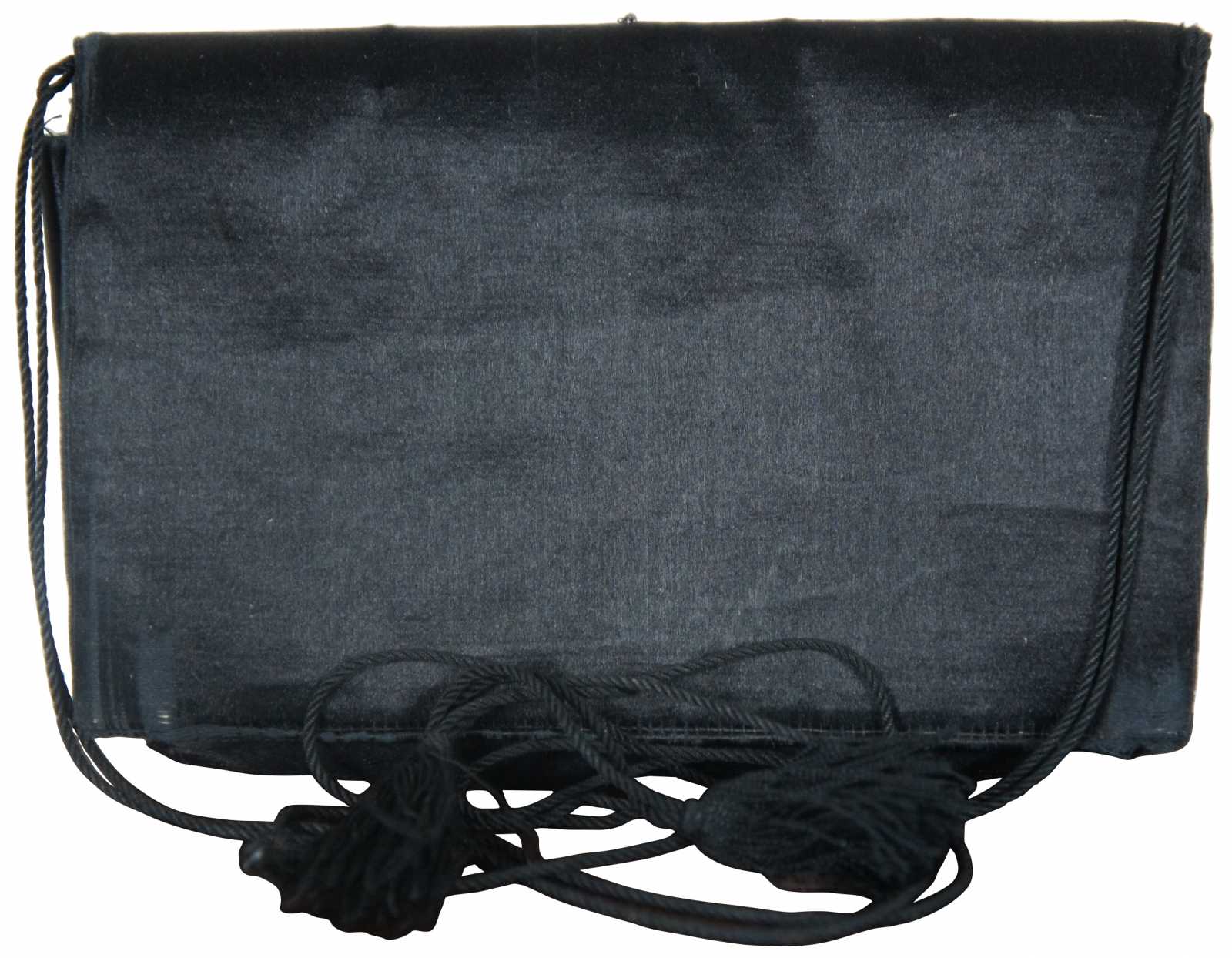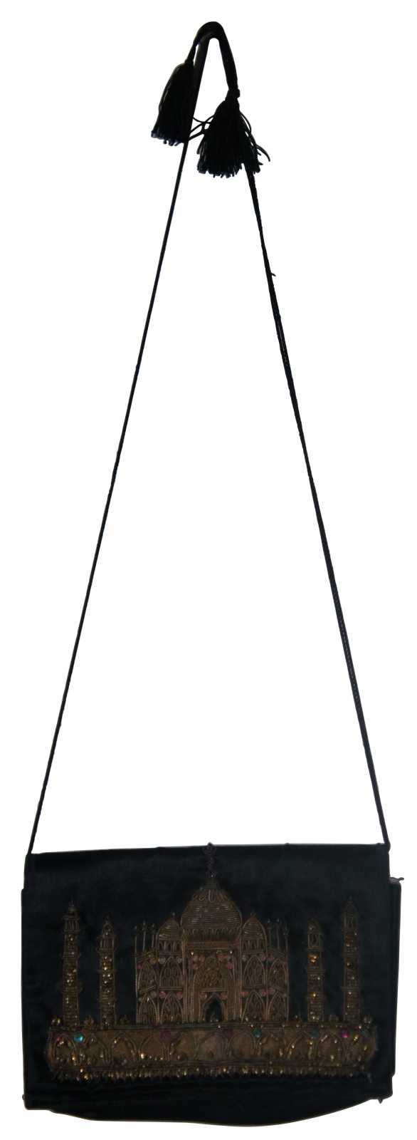 Vintage black silk clutch purse with the Taj Mahal embroidered in gold and sequins on the front.
