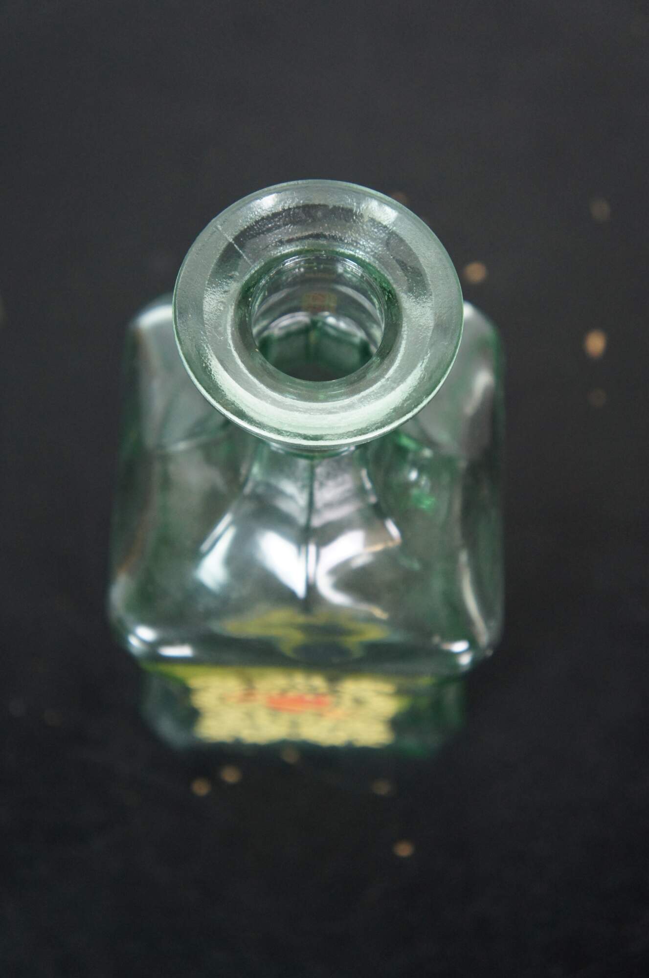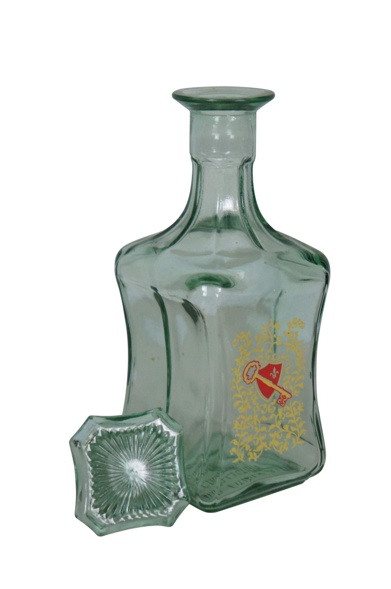 Vintage 20th century Old Fitzgerald Collection Liquor Bottle / decanter, produced by Owens-Illinois Glass Company. Pale green glass, rectangular form with pinched waist and faceted corners and cut stopper; front printed with golden foliate vines surrounding a key crossed over a red shield sporting a fleur de lis.