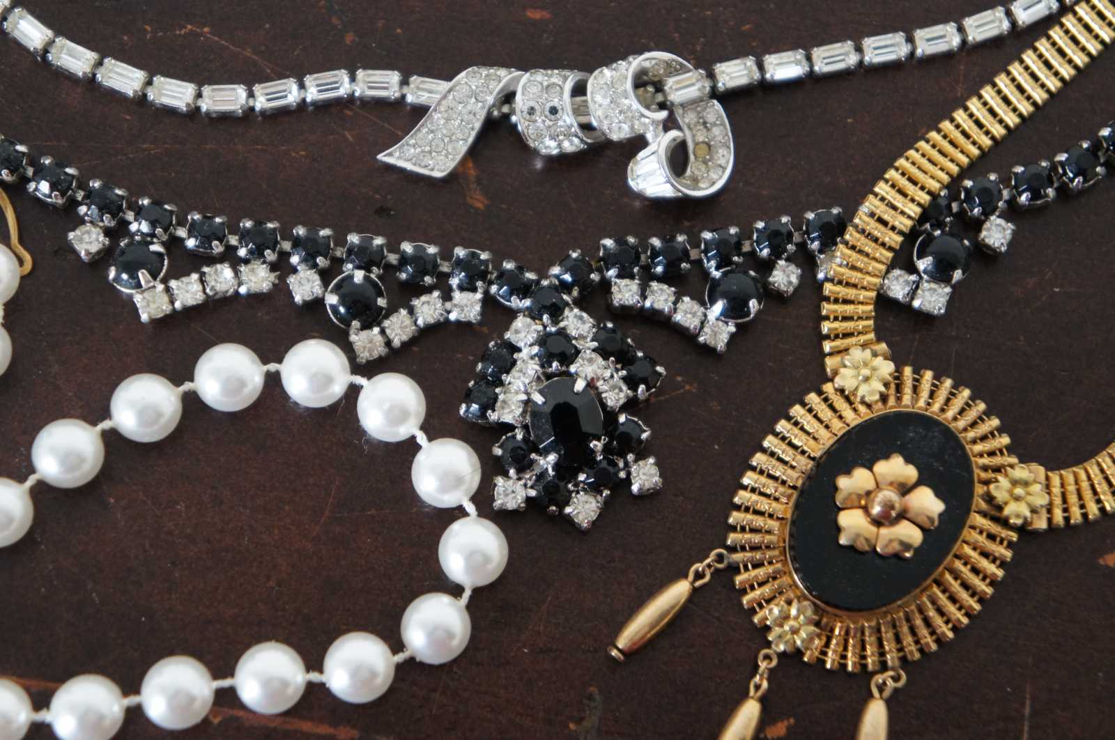 Lot of 21 vintage beaded and rhinestone costume jewelry necklaces and pendants.