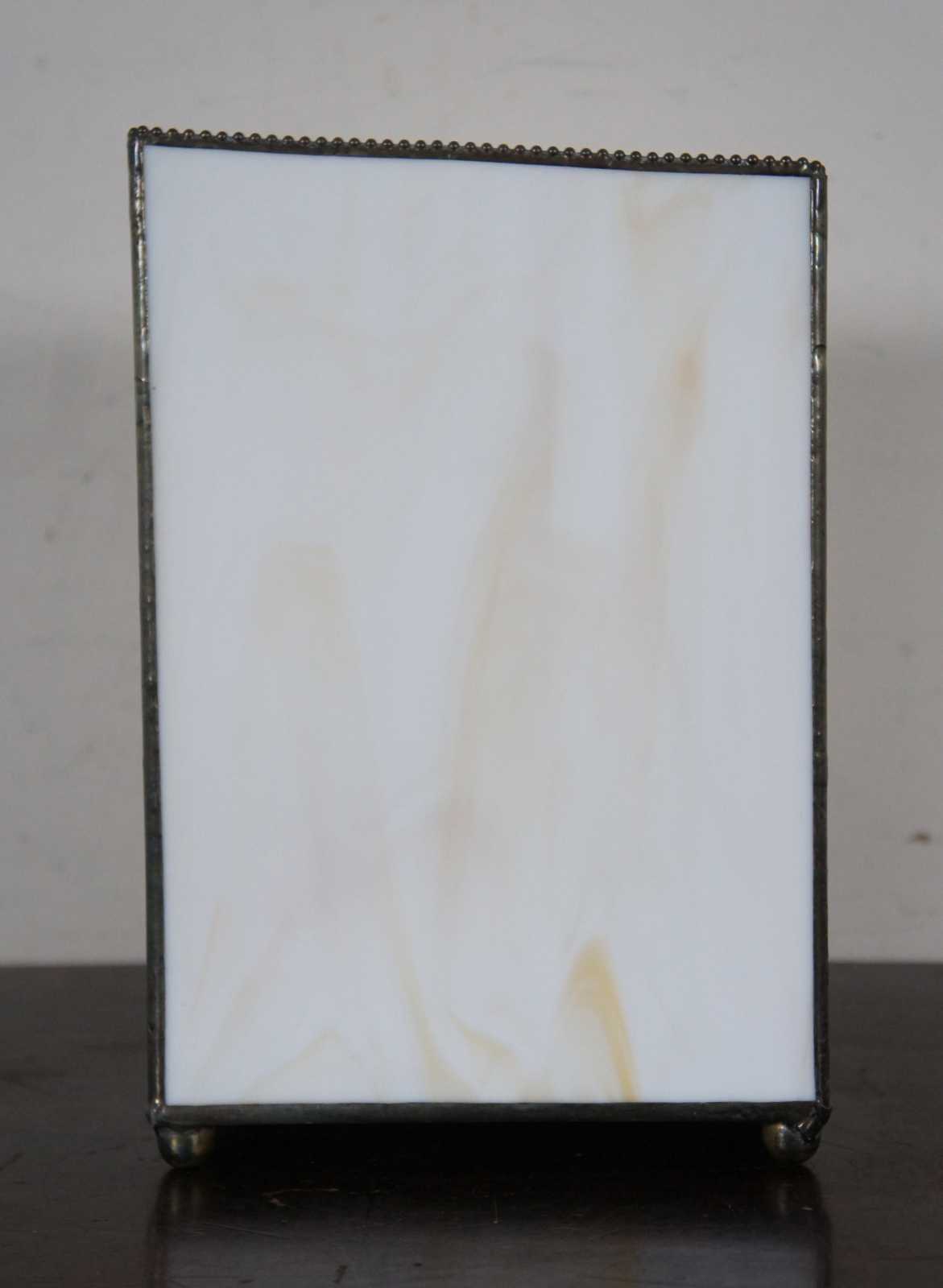 Asymmetrical square waste basket with alternating sides of slag glass and floral prints with a mirrored interior; made by Willan F. Willant, marked on the base.