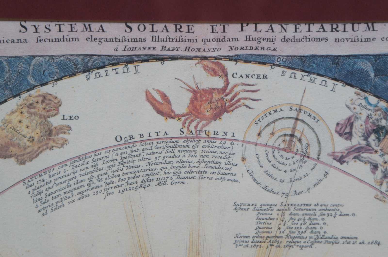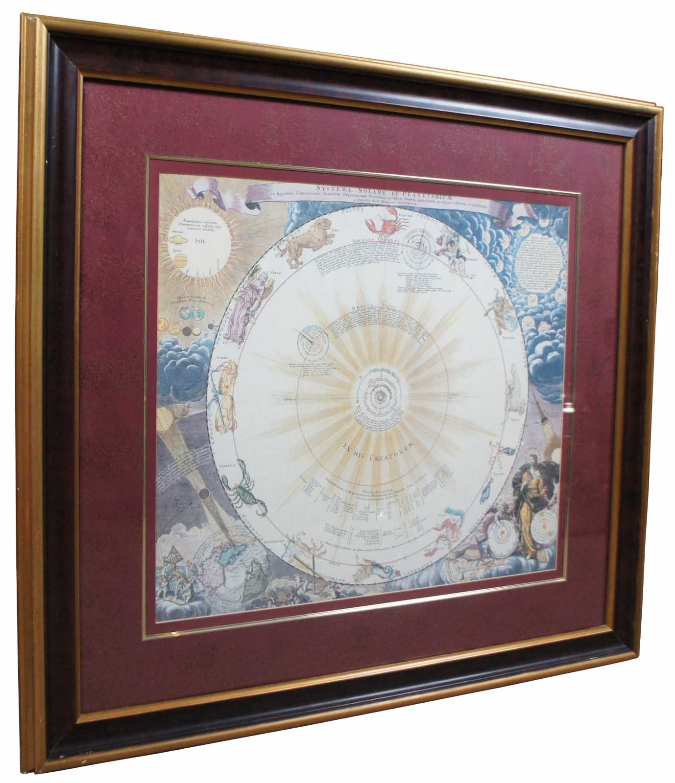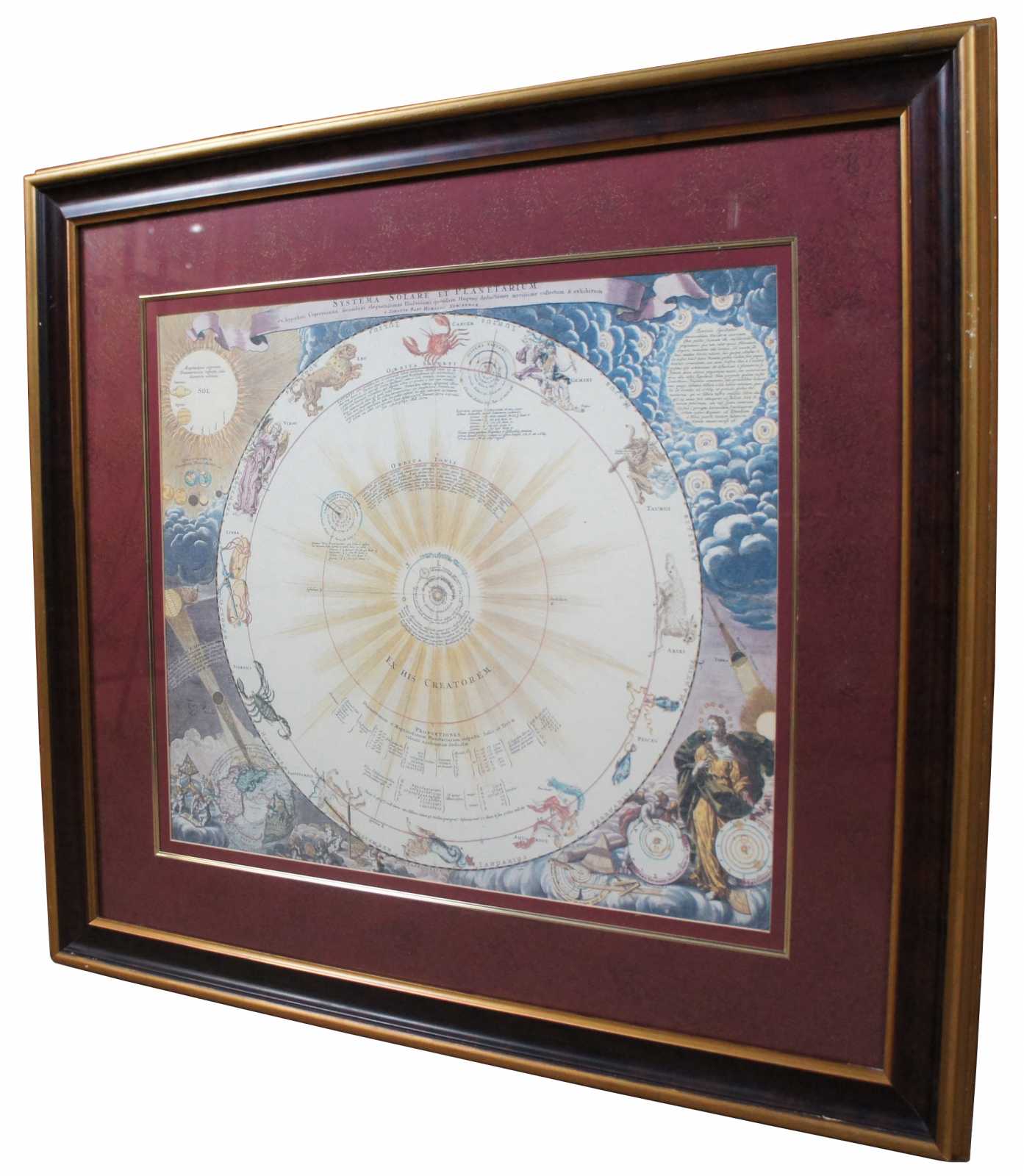 Celestial atlas colored reproduction print of the “Systema Solare et Planetarium” originally designed by Johann Baptist Homann (1663-1724) in 1716. This beautifully colored and framed contemporary reproduction was produced by the Bombay Company.