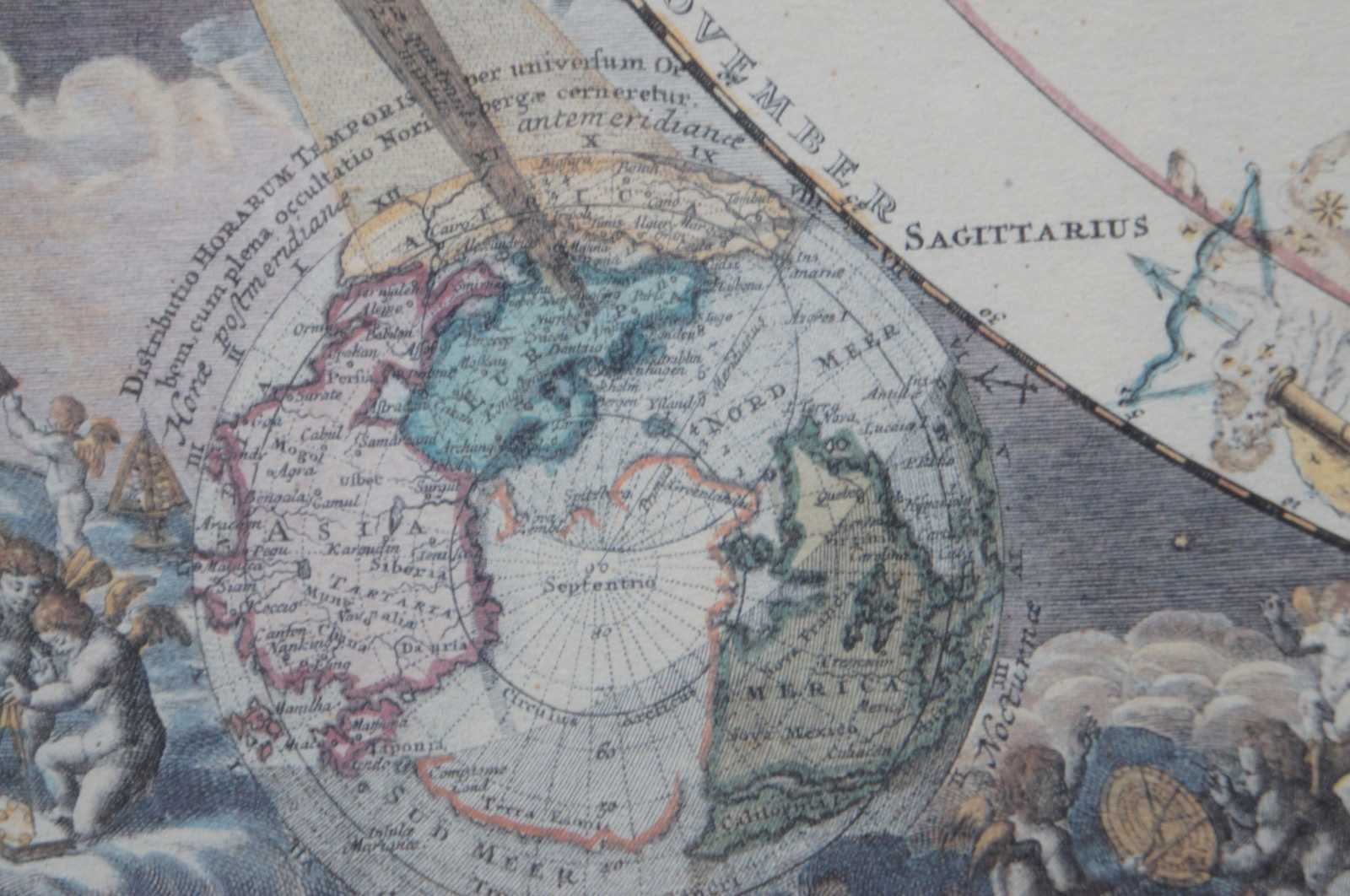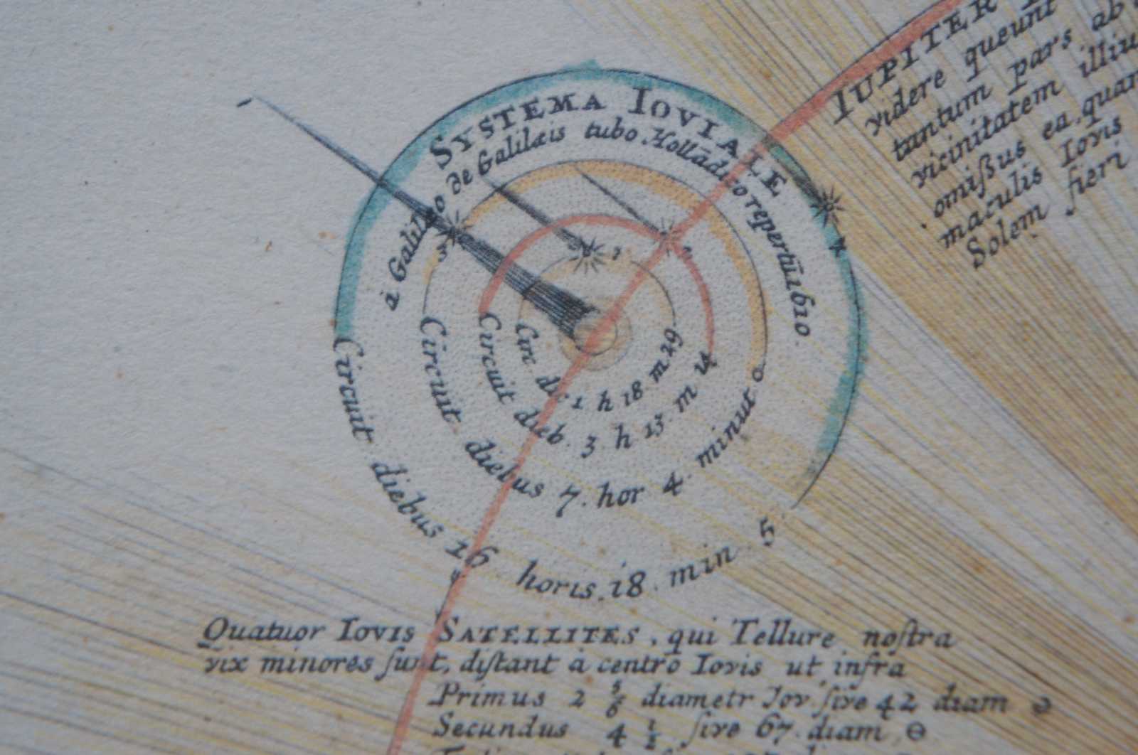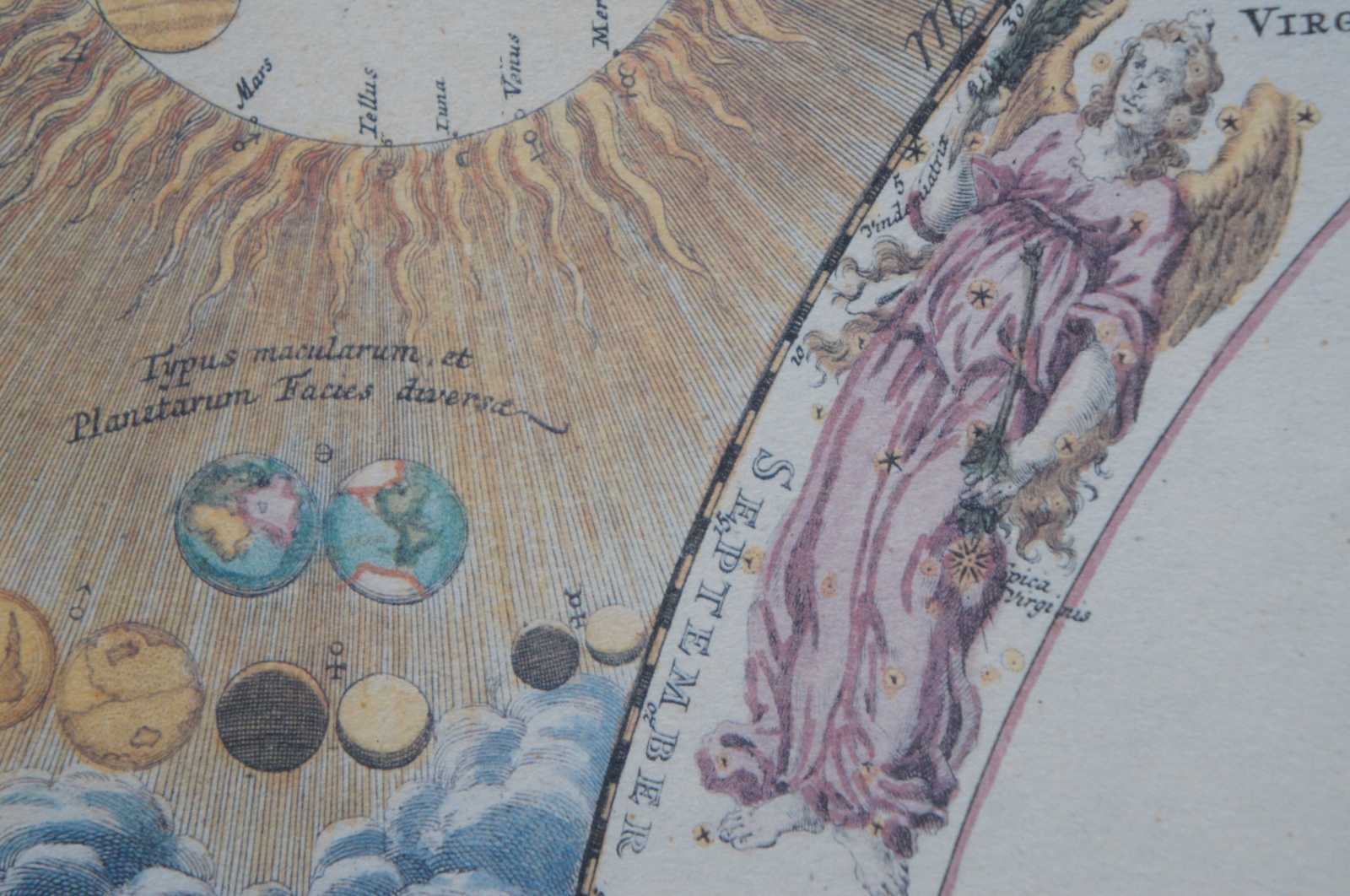 Celestial atlas colored reproduction print of the “Systema Solare et Planetarium” originally designed by Johann Baptist Homann (1663-1724) in 1716. This beautifully colored and framed contemporary reproduction was produced by the Bombay Company.