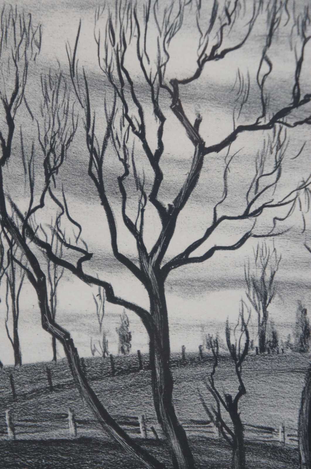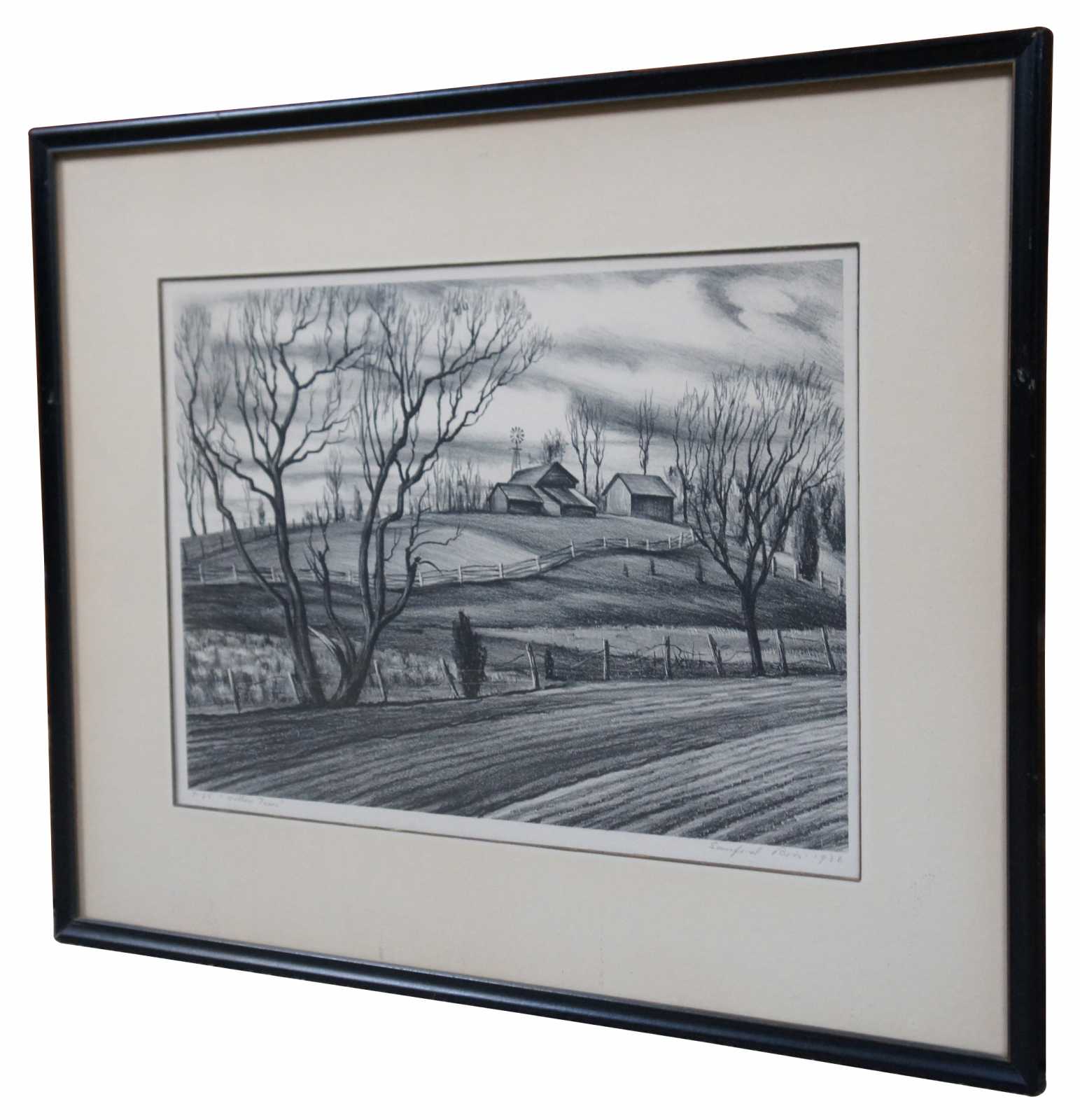 Antique country landscape print by Sanford Ross, 1936, pencil signed and numbered 7-25, titled “Willow Trees.” Sanford Ross (aka Pierre Sanford Ross - January 25, 1907 – March 1, 1954) was an American realist painter and printmaker. His urban and rural scenes of the 1930s bore the influence of Charles Burchfield and Edward Hopper. His later work focused on the landscape and rural life of Vermont where he lived at the time of his death.