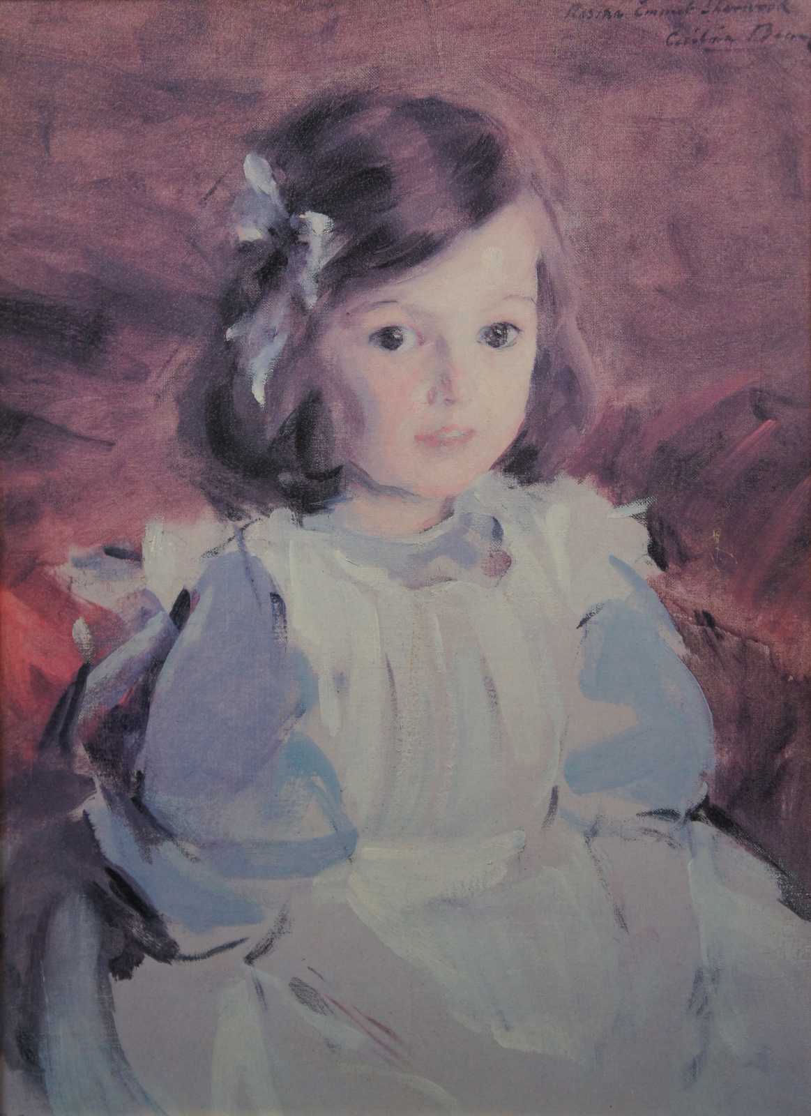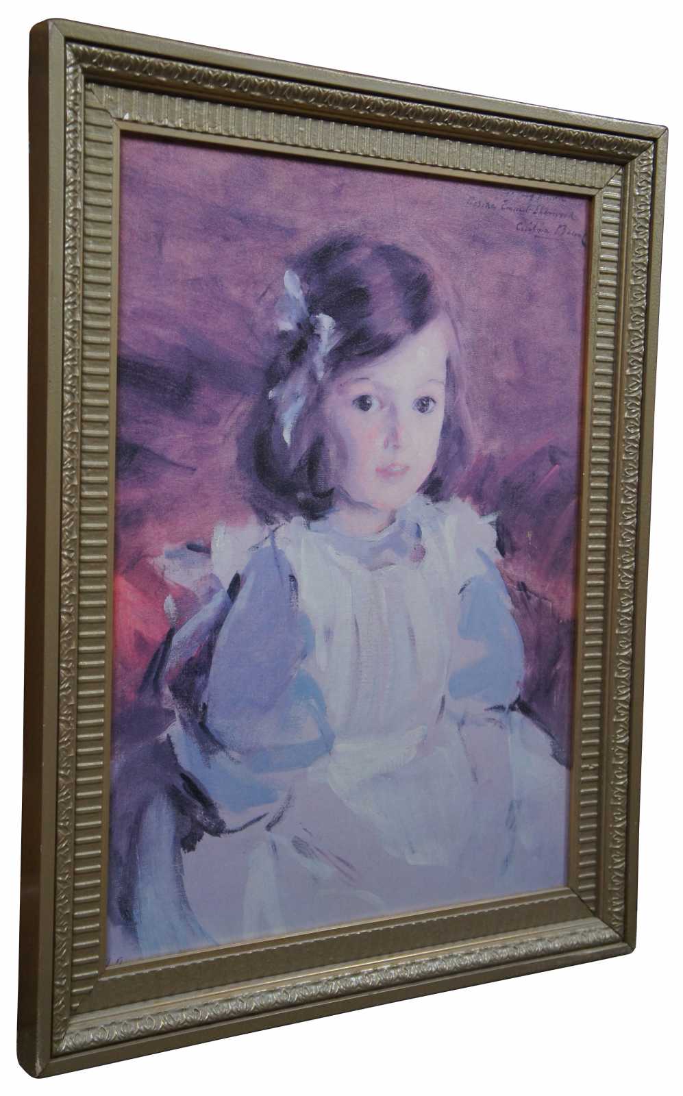 Vintage print on stretched linen showing a semi-impressionist portrait of a young girl dressed in blue and white.