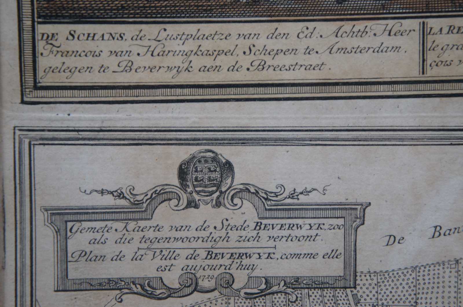 Pair of 19th cenutyr colored engravings showing scenes and ground plans for the Mansion and Gardens of Waterlant and the Villa de Beverwyk, labeled in French and German.