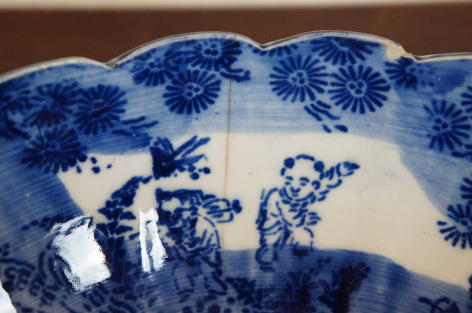 Antique turn of the century flow blue Chinese porcelain bowl with scalloped edge, decorated with figures in a forest around a phoenix center.