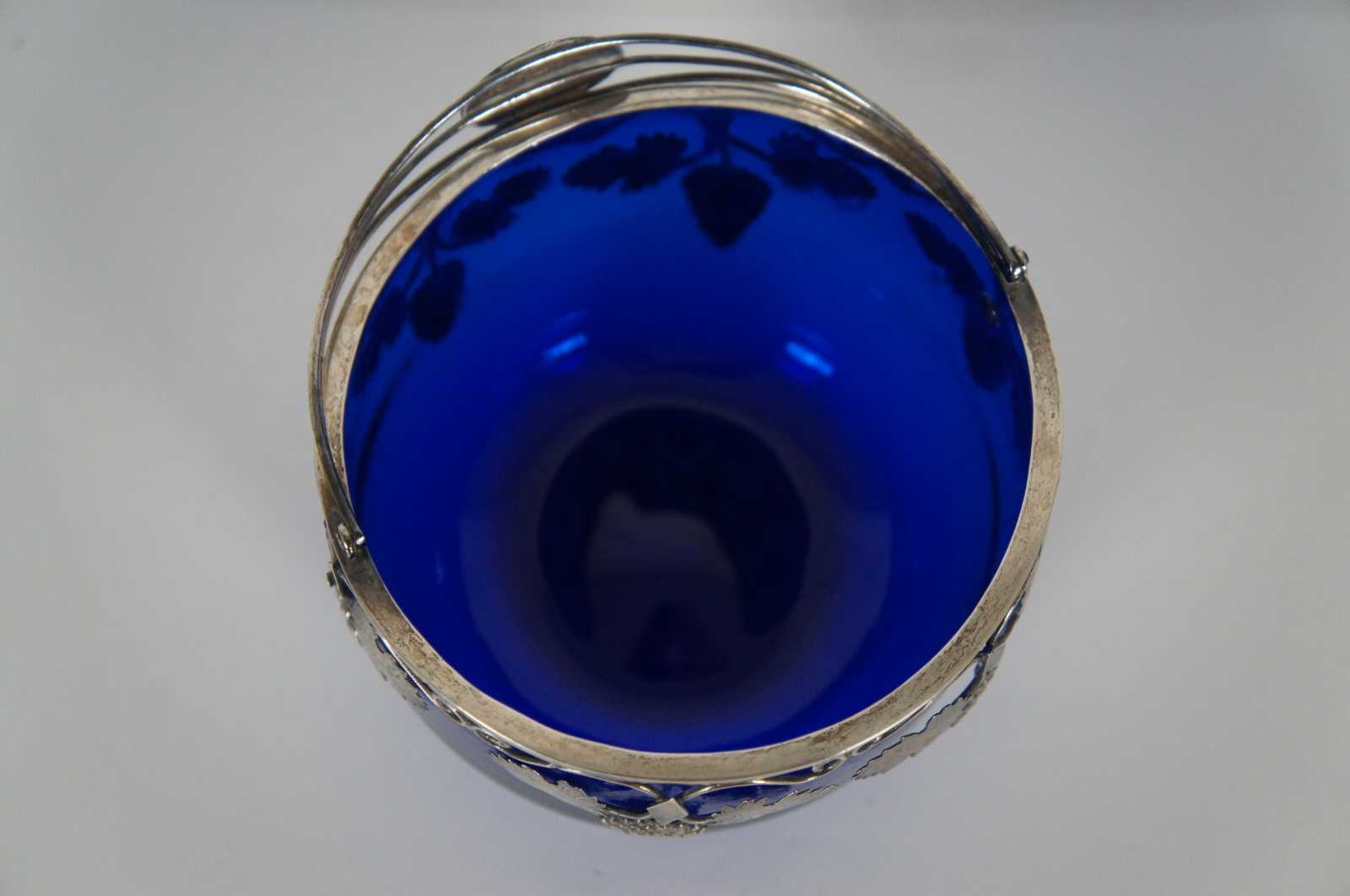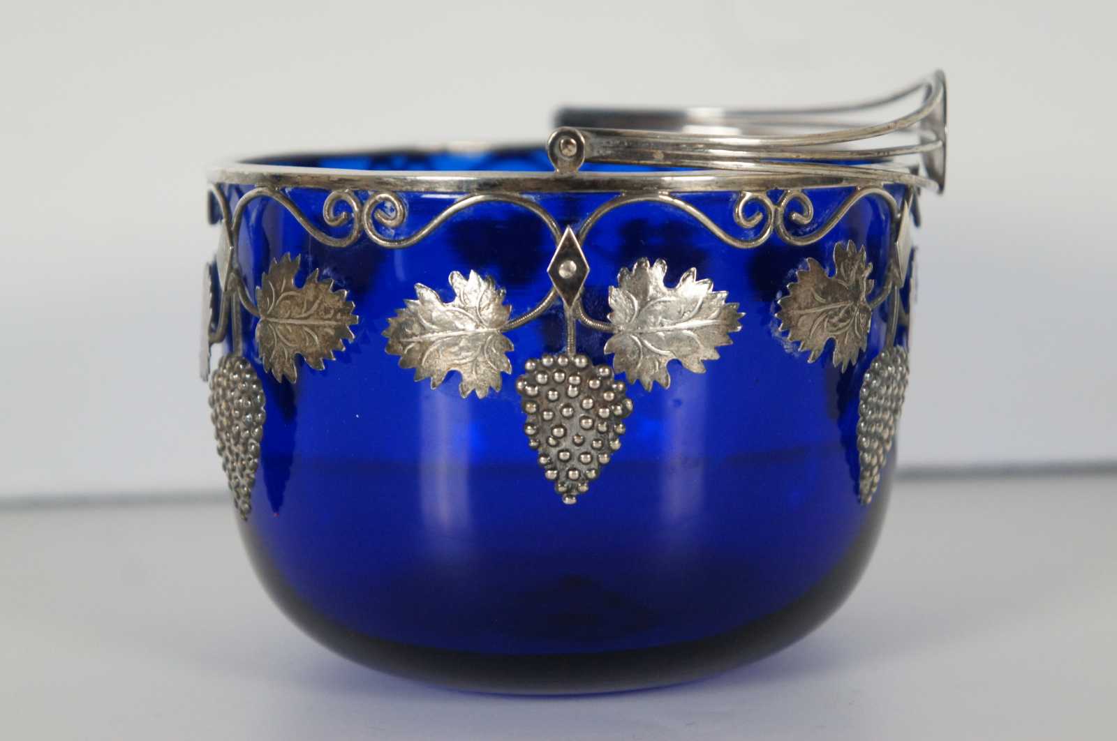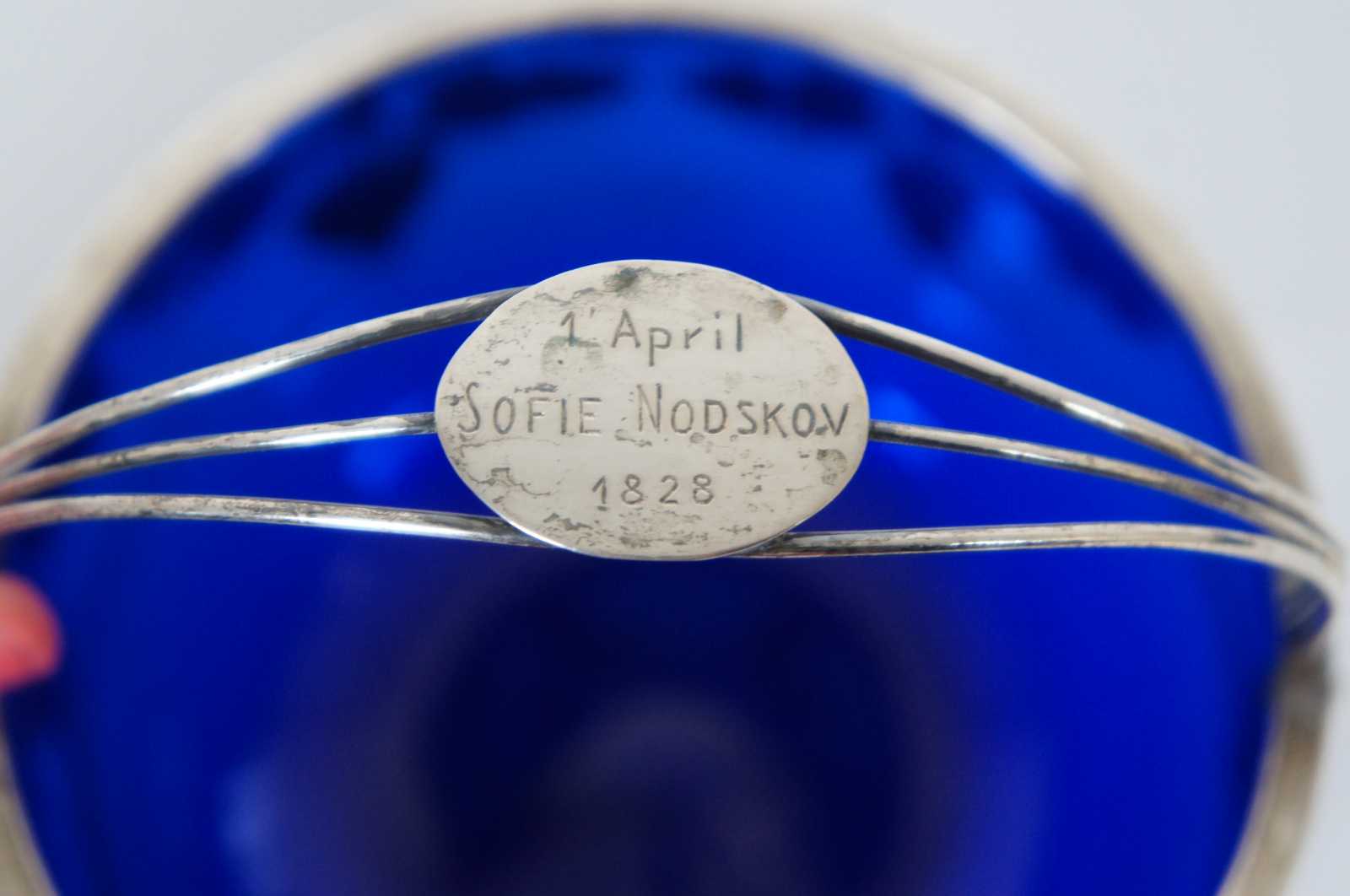 Antique European hand blown Georgian / Edwardian cobalt blue glass candy basket or sugar bowl with sterling silver 925 handle and strawberry leaf design, engraved with “Sophie Nodskov 1 April 1828.”