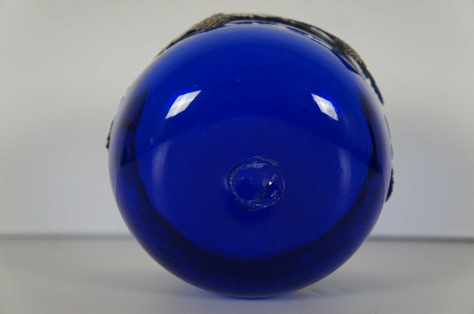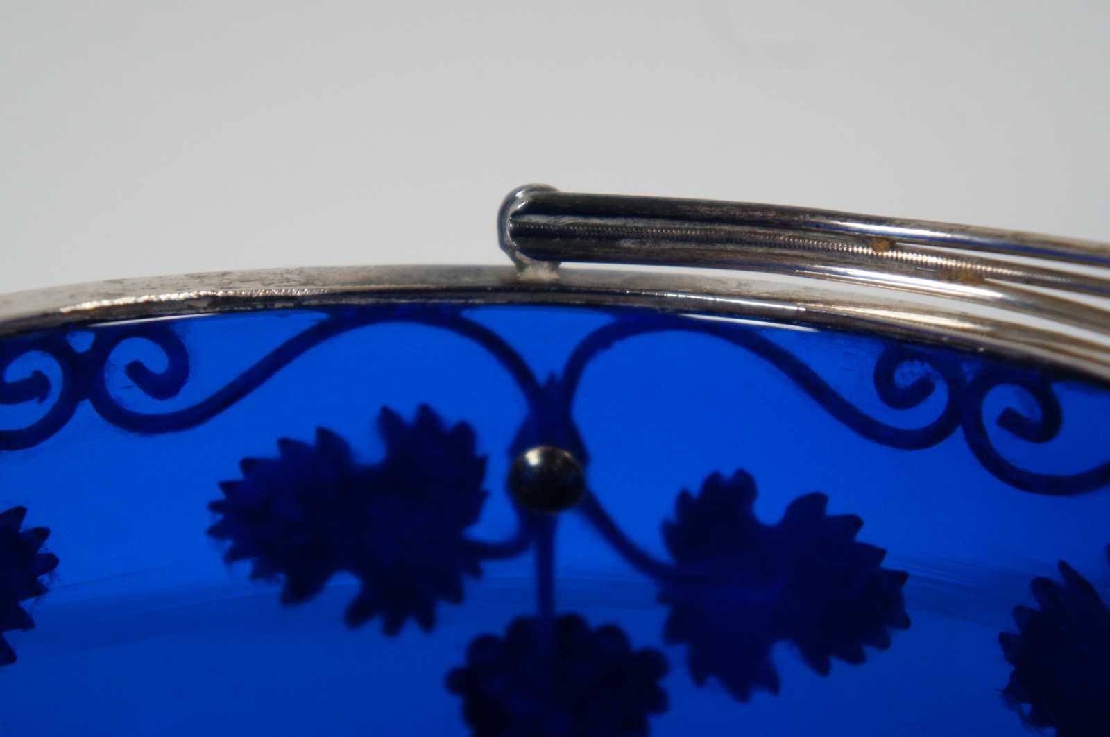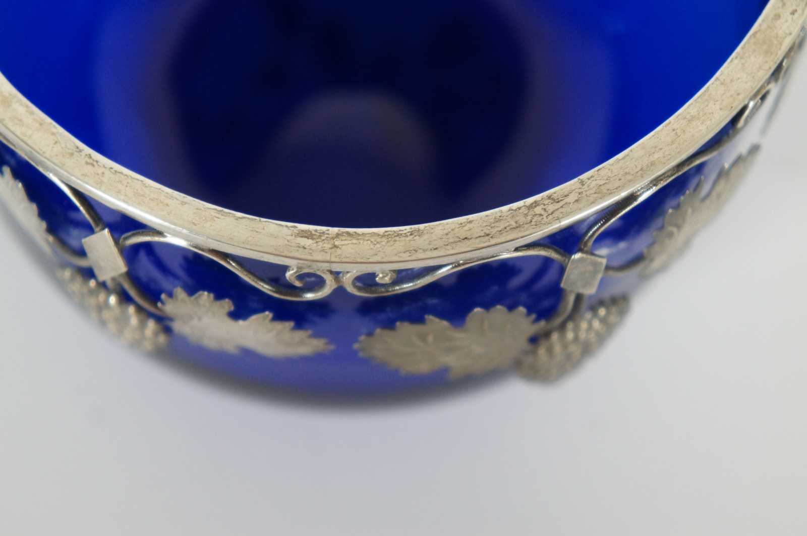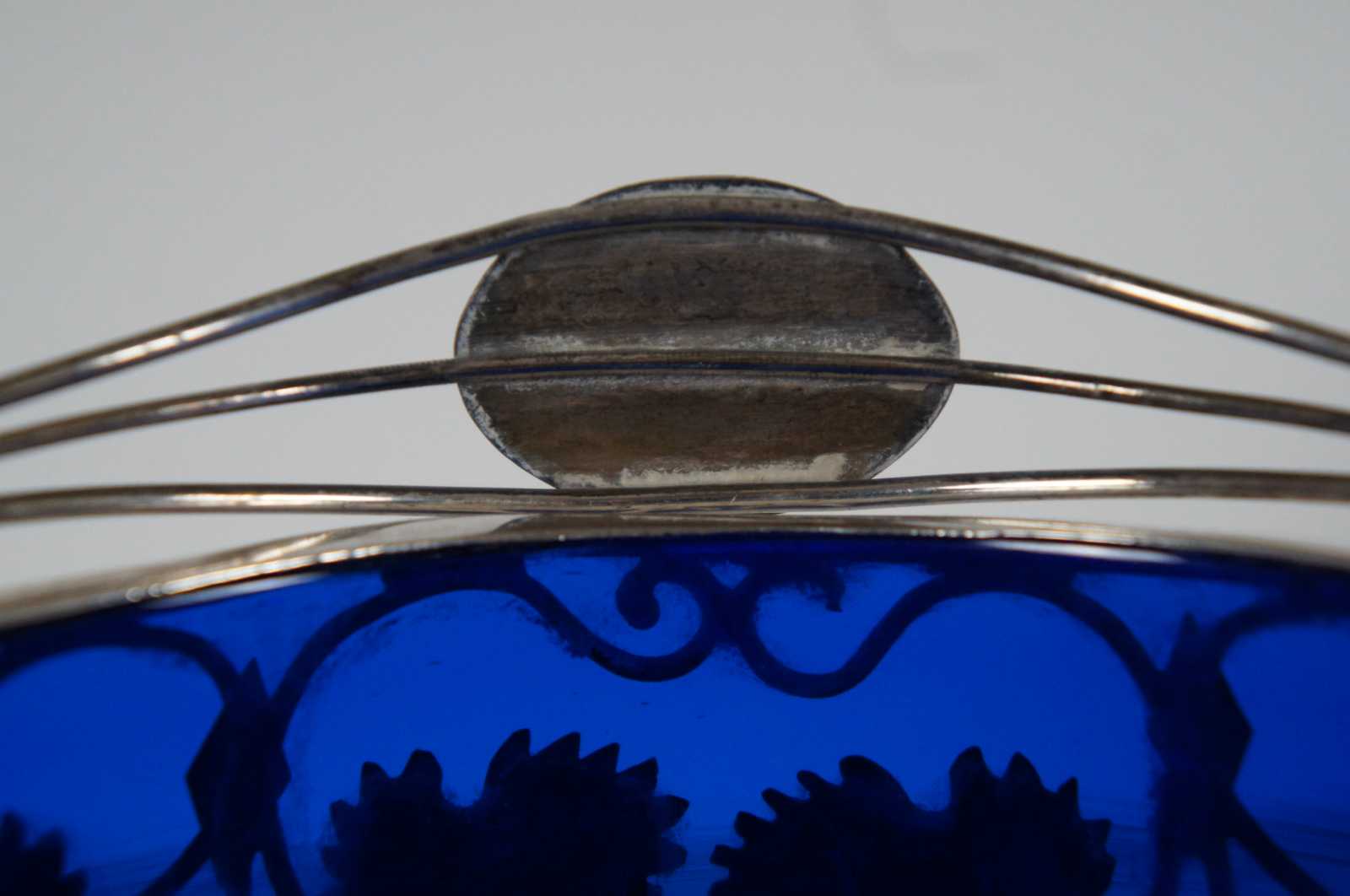 Antique European hand blown Georgian / Edwardian cobalt blue glass candy basket or sugar bowl with sterling silver 925 handle and strawberry leaf design, engraved with “Sophie Nodskov 1 April 1828.”