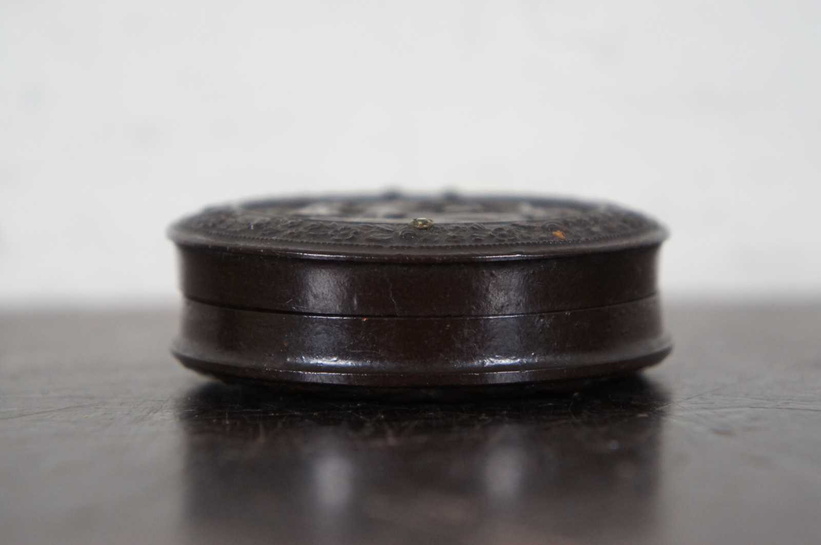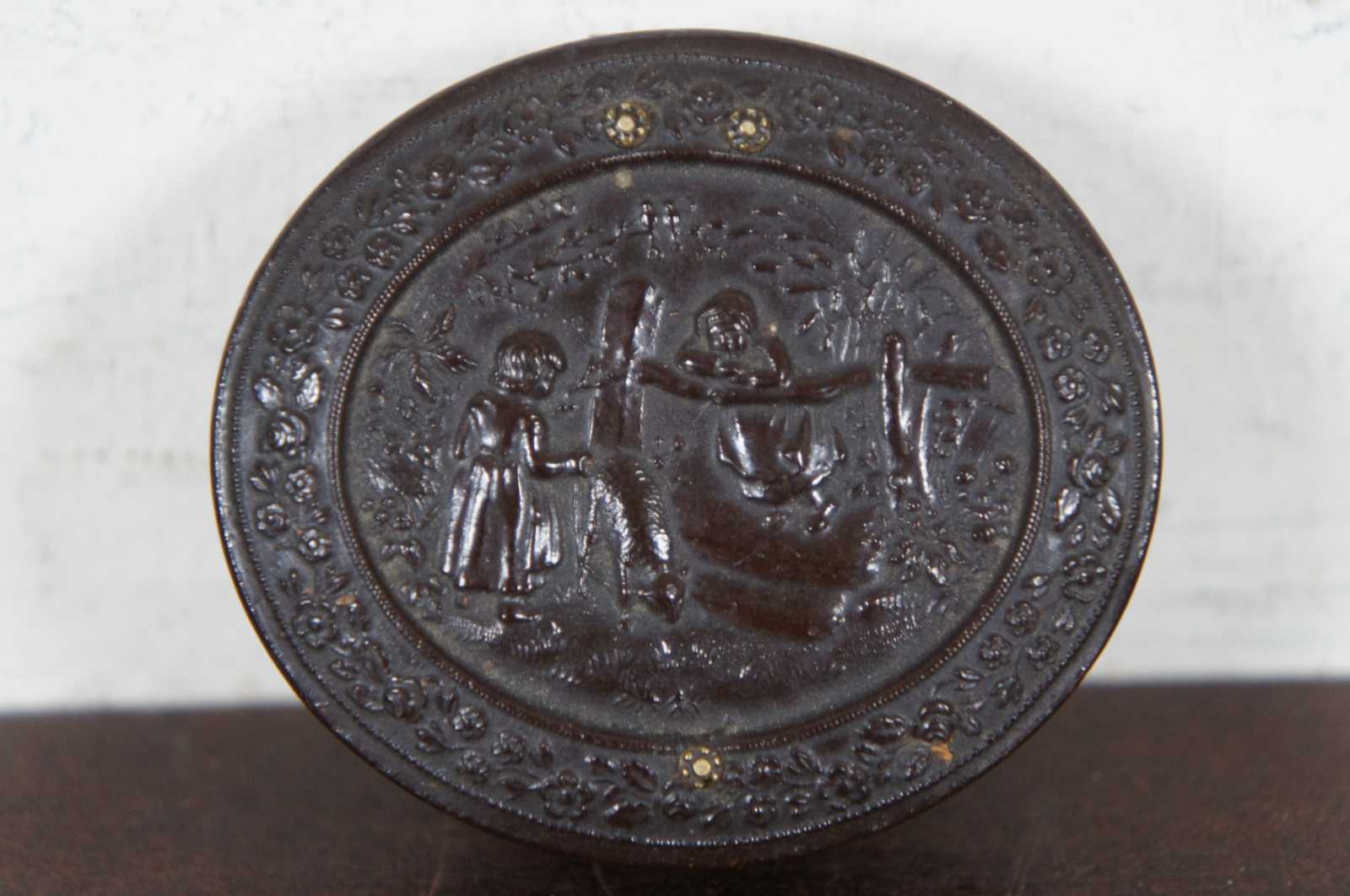 Antique Victorian tintype portrait of a young child, enclosed in a small thermoplastic dark brown case or locket, molded with a scene of children playing on one side and a nosegay of flowers on the other.