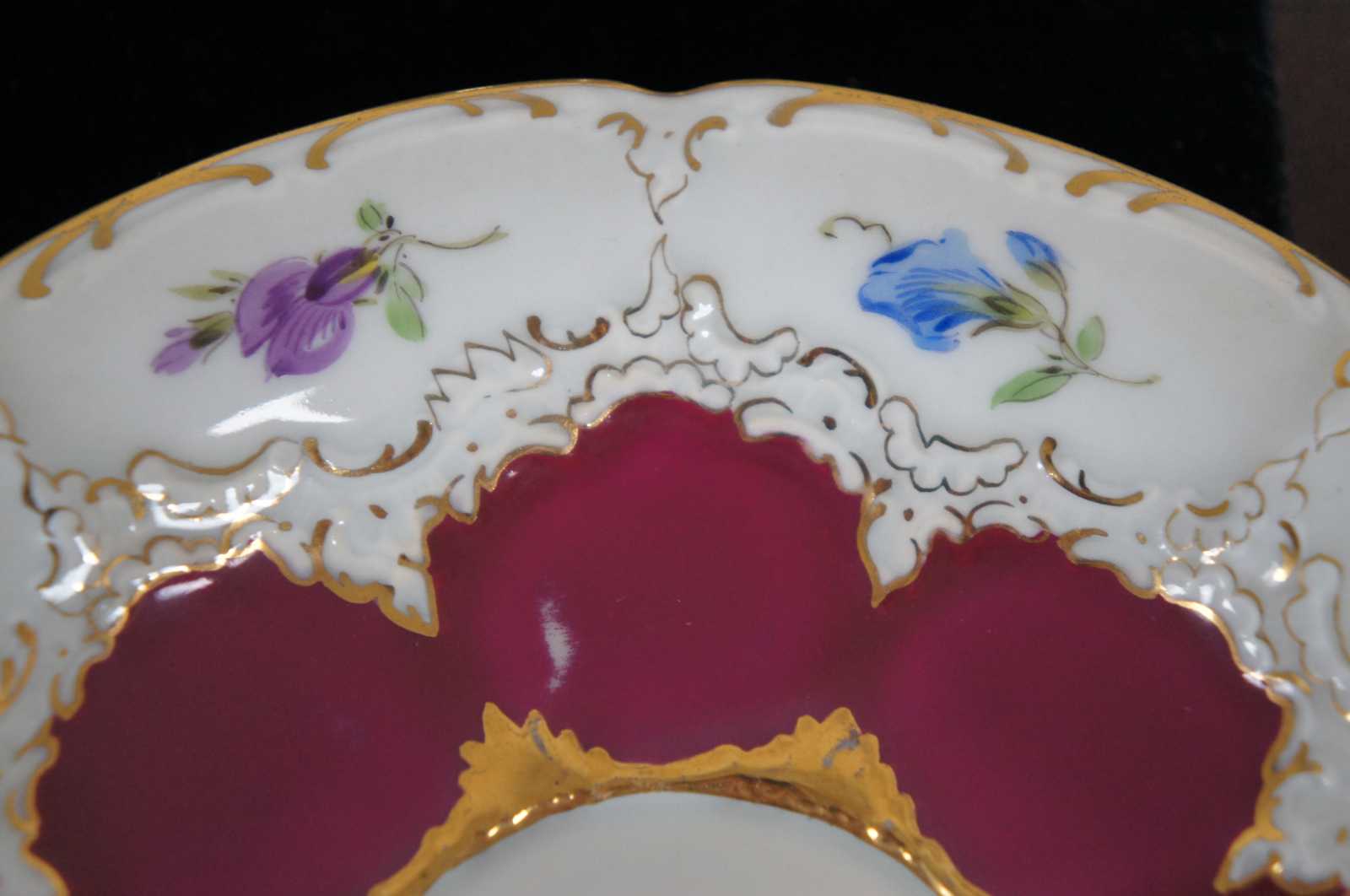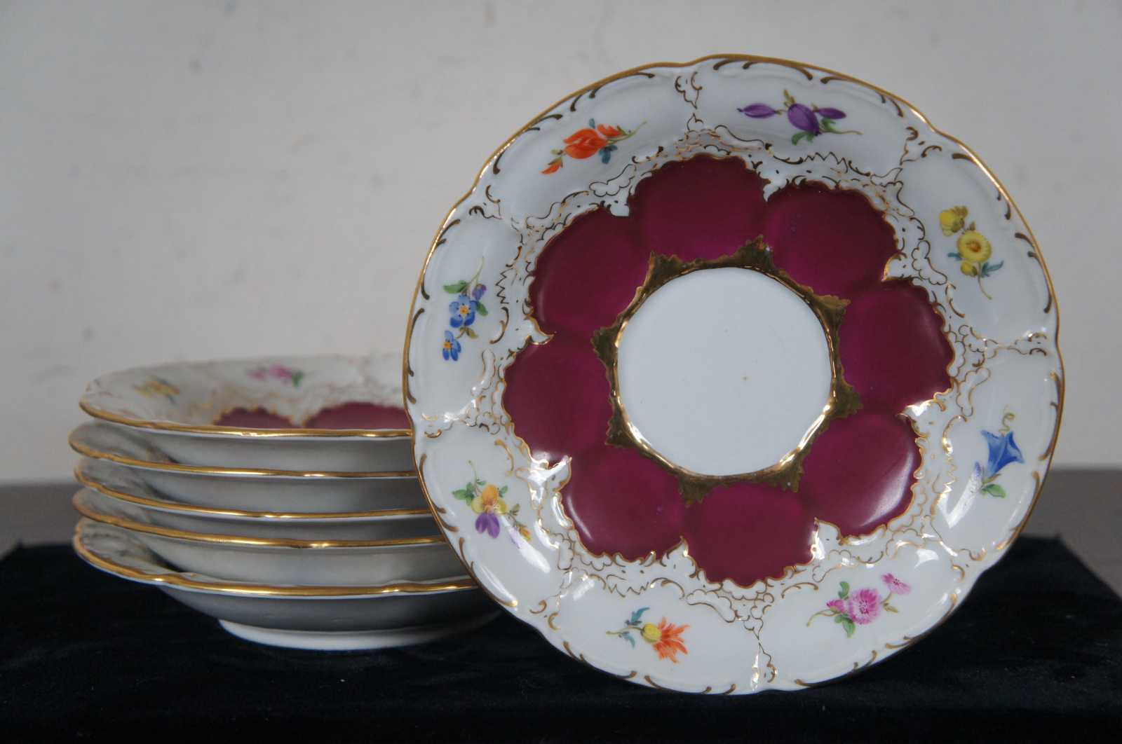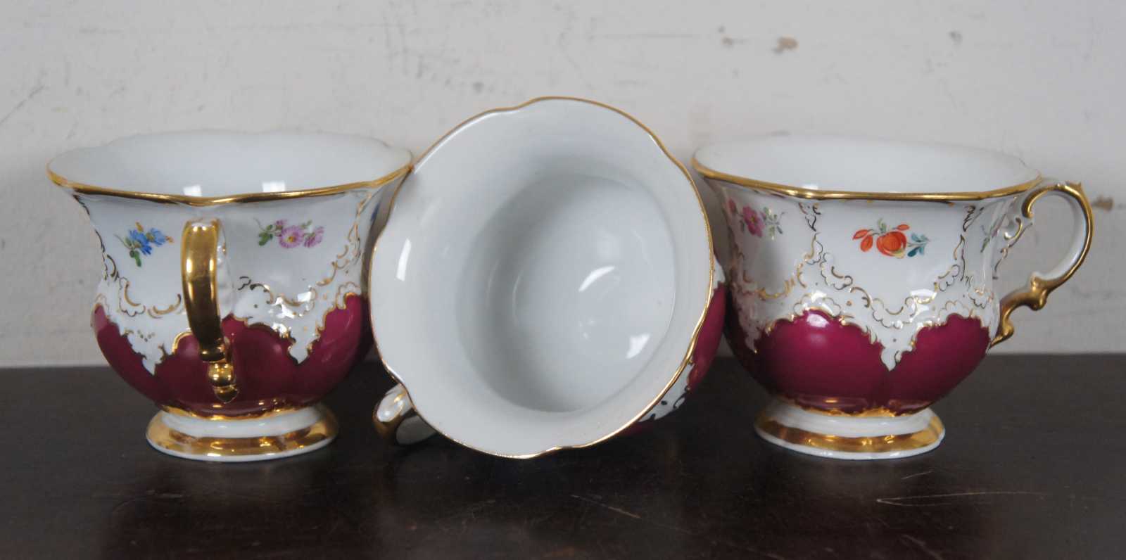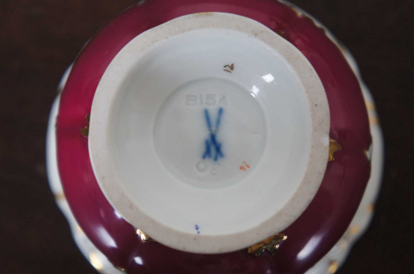 Twelve piece set of Antique Meissen china. Porcelain, blue swords marks 1st and 2nd choice, form number B-154, B-form purple with scattered flowers