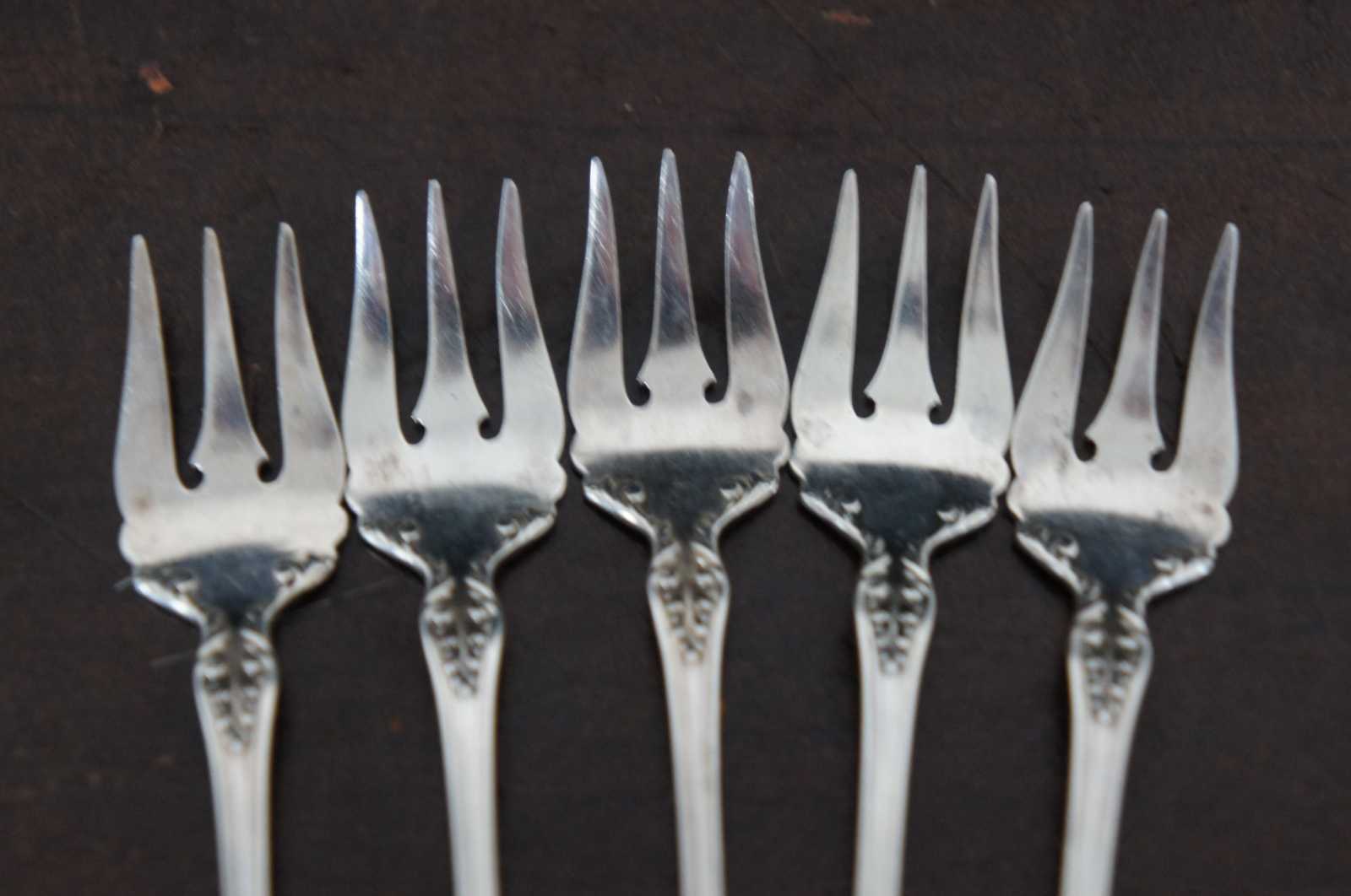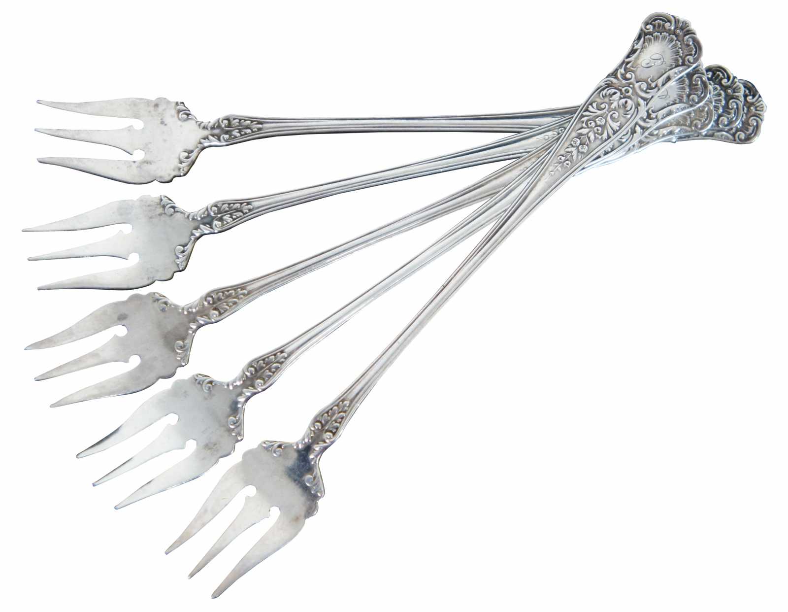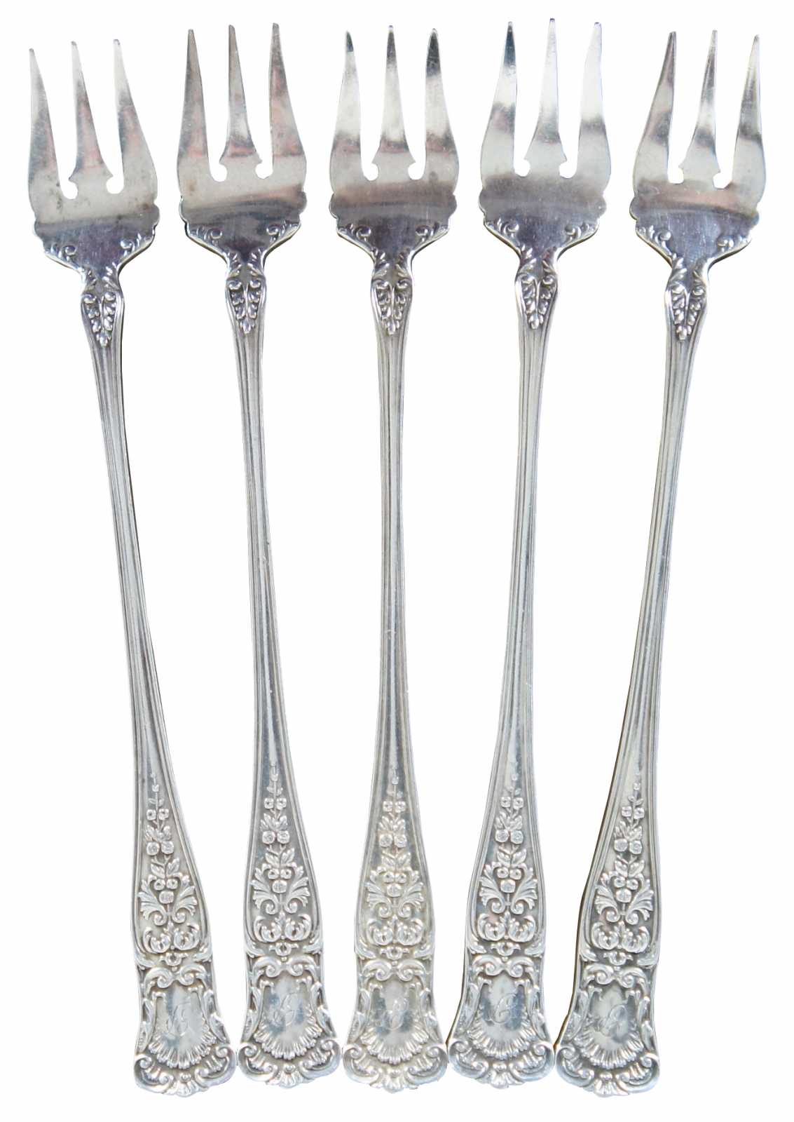Set of 5 antique Gorham sterling silver cocktail or fish forks with floral and scallop shell pattern, engraved with a monogram “P.”