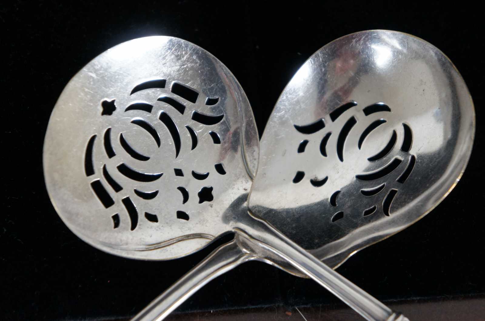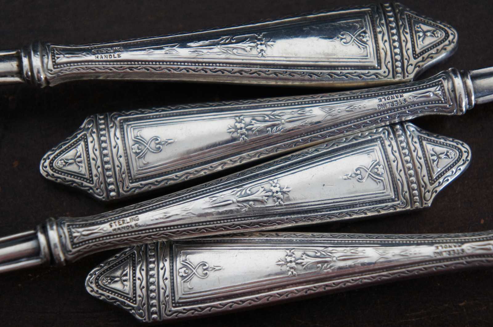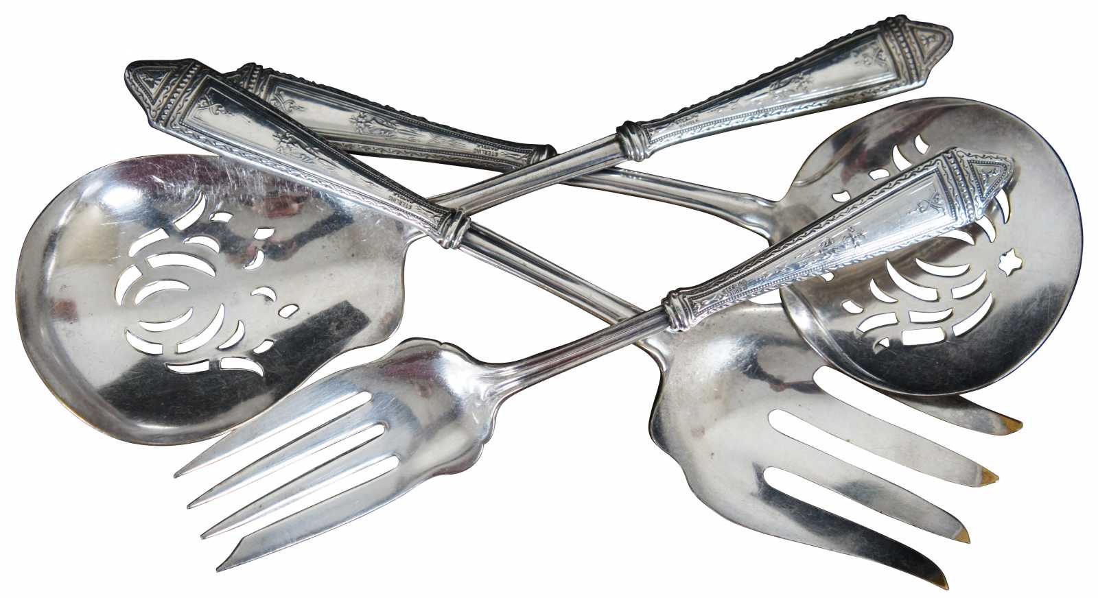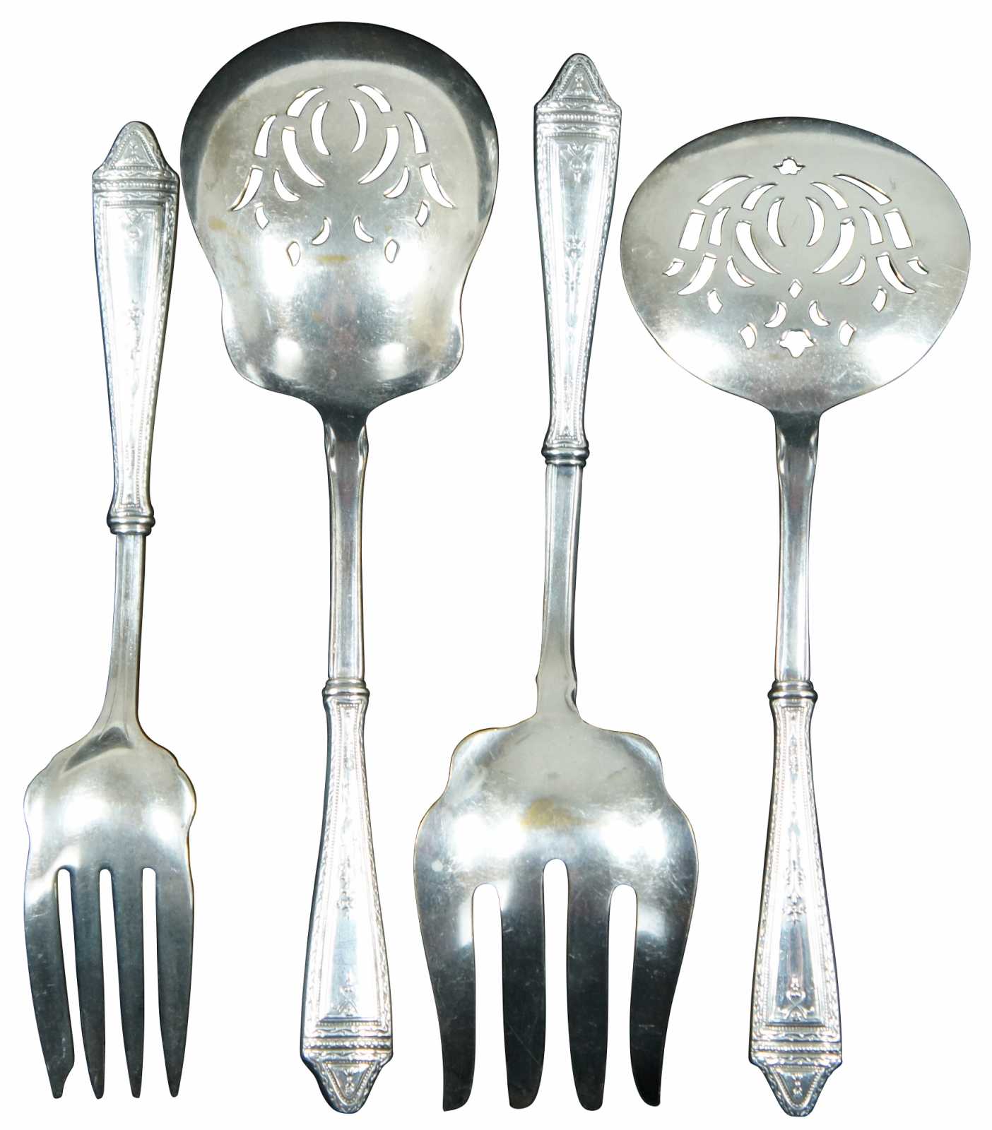 Set of four sterling silver handled serving pieces, two forks and two slotted spoons.