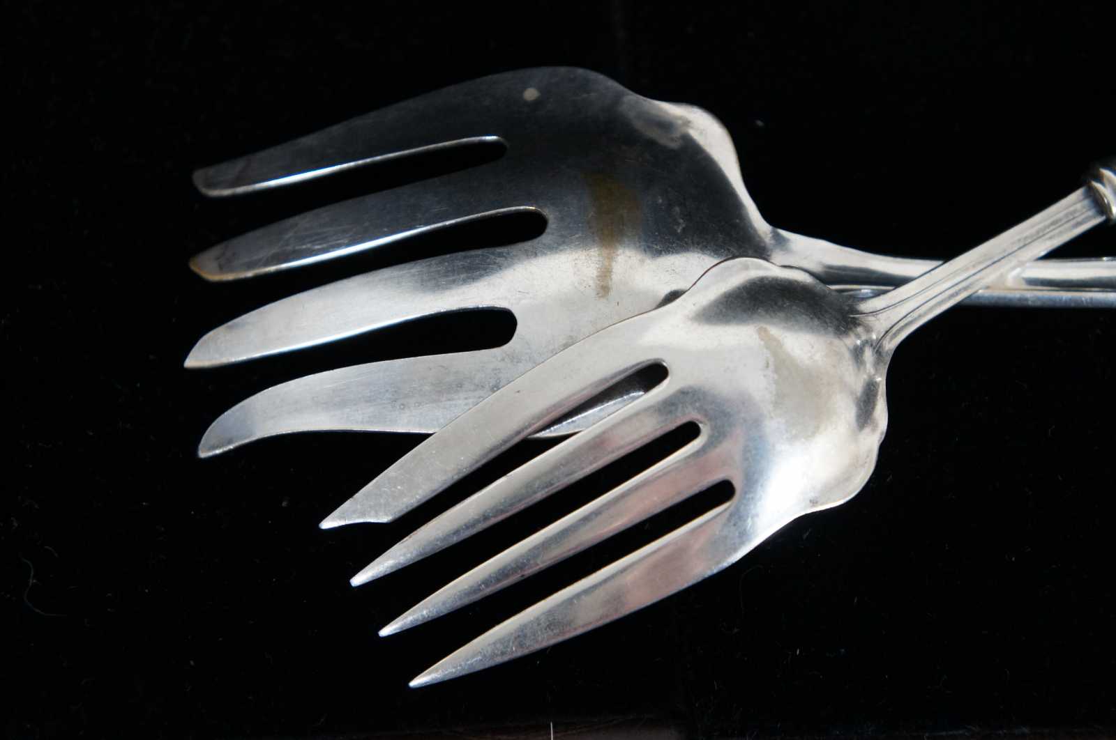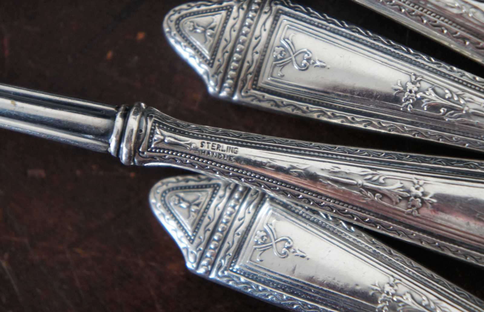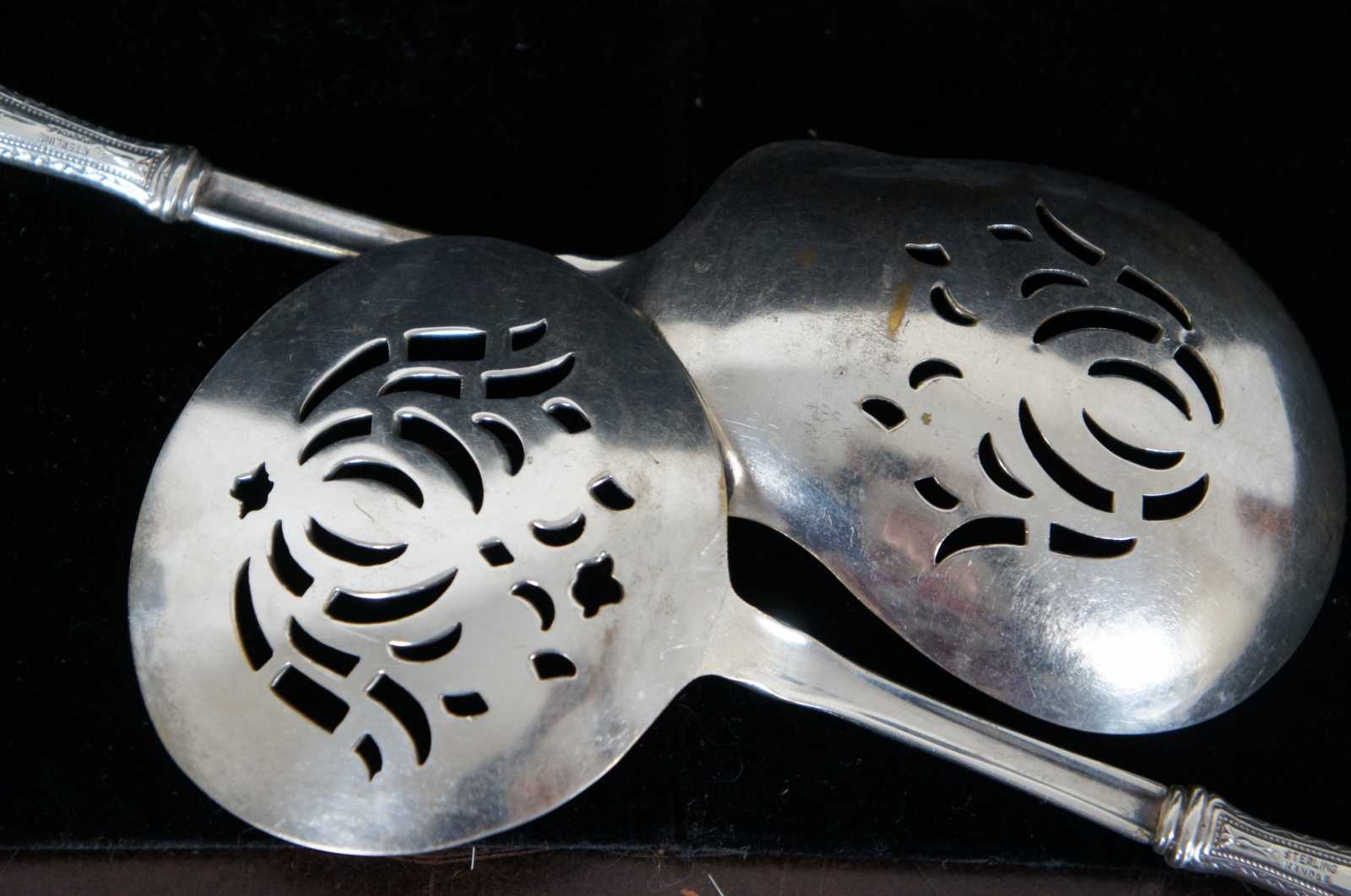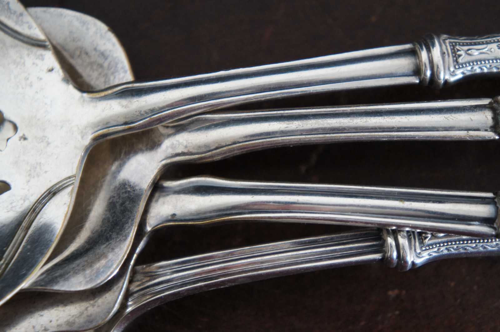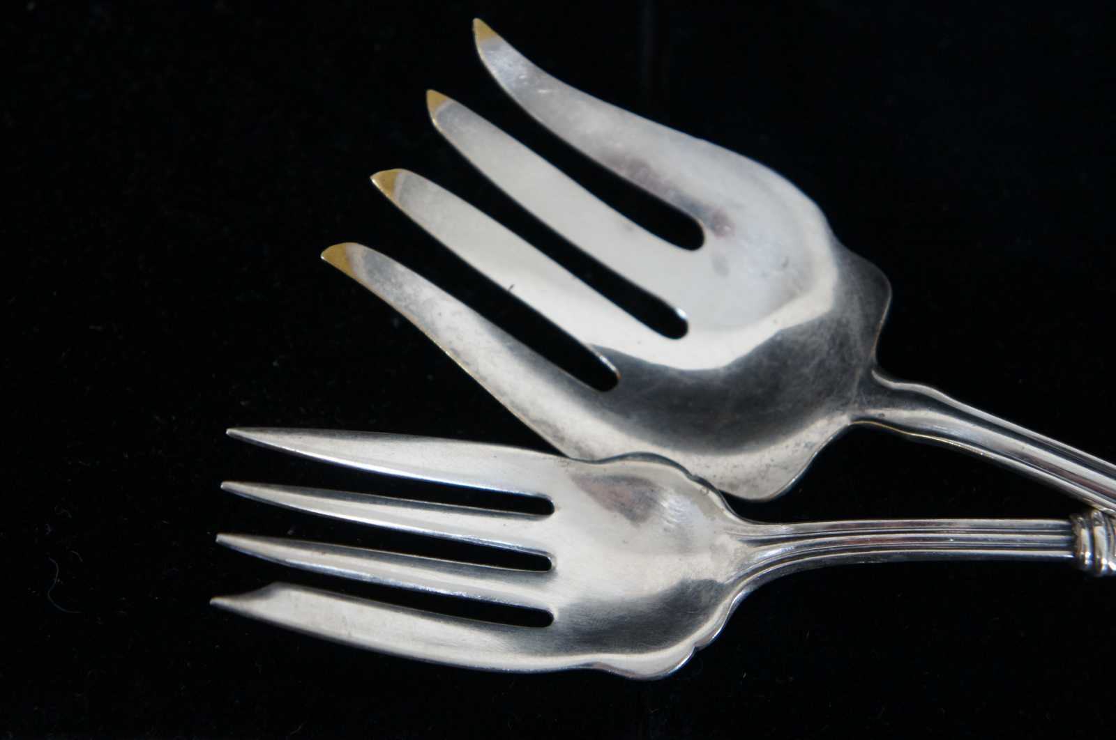Set of four sterling silver handled serving pieces, two forks and two slotted spoons.