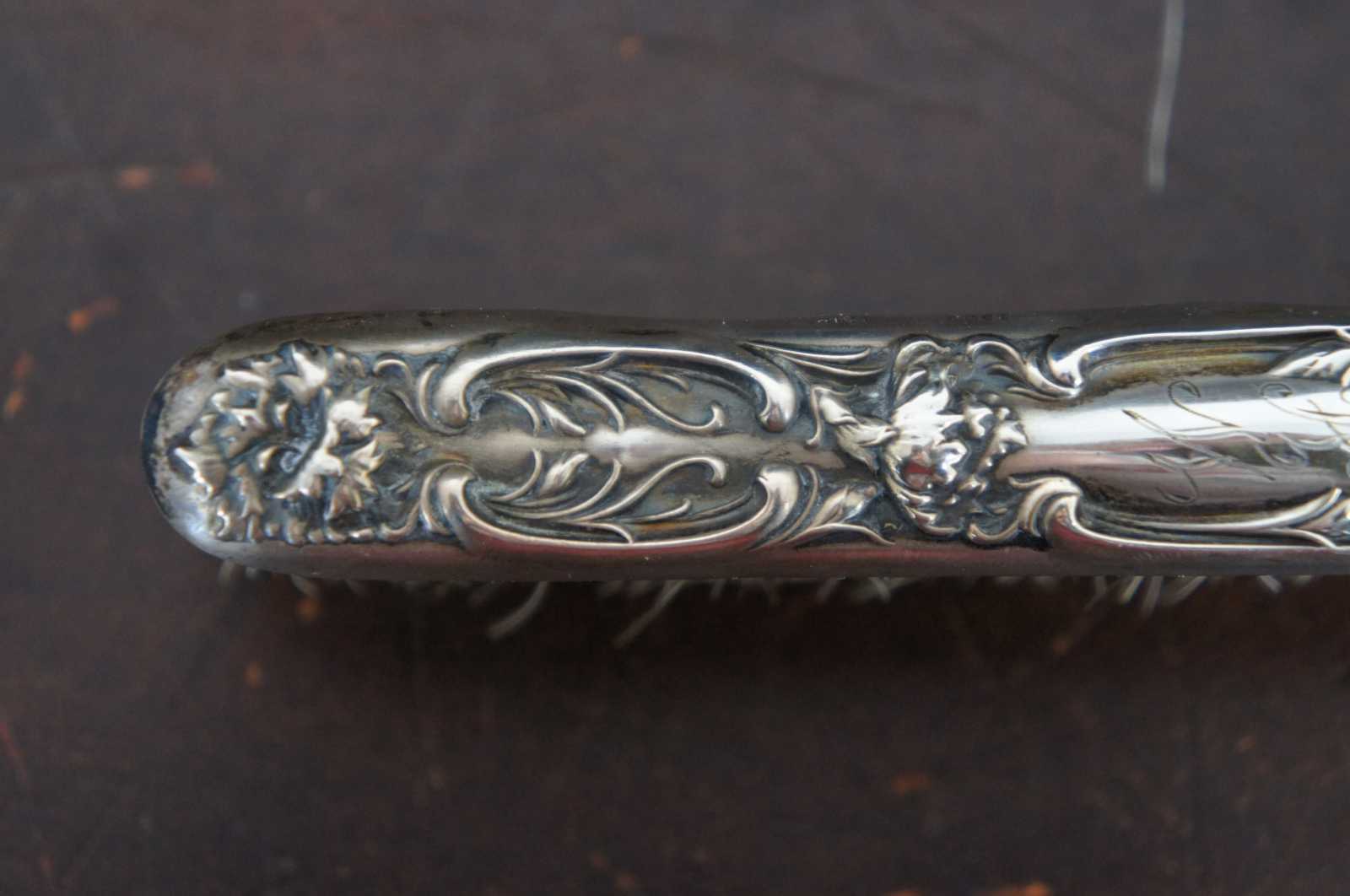 Antique Robert Wallace & Sons sterling silver Victorian vanity brush with bone base and horse hair bristles, engraved with the initials “WHK.”