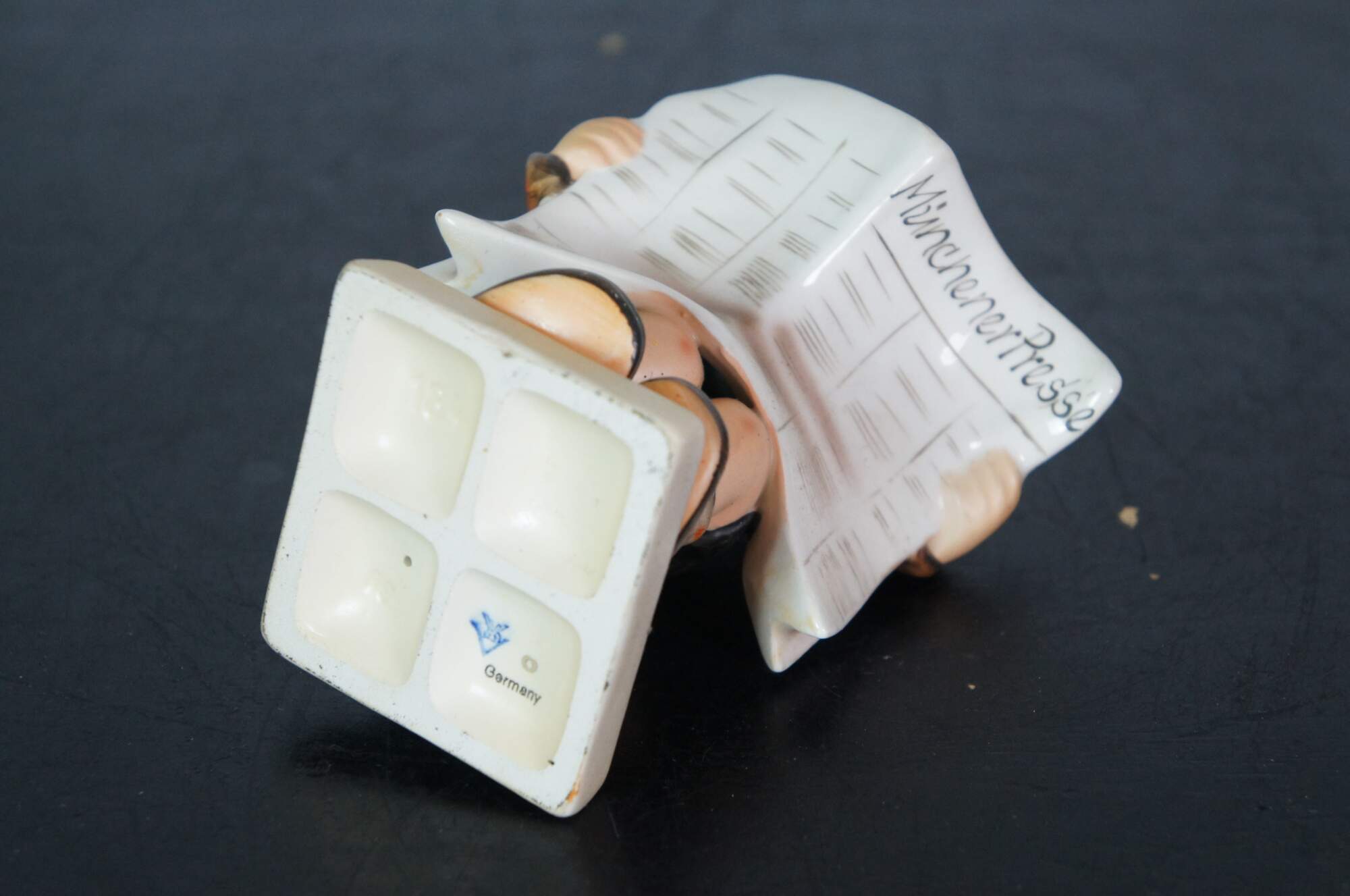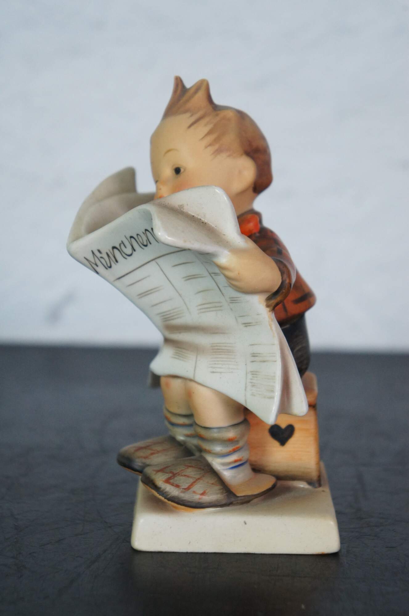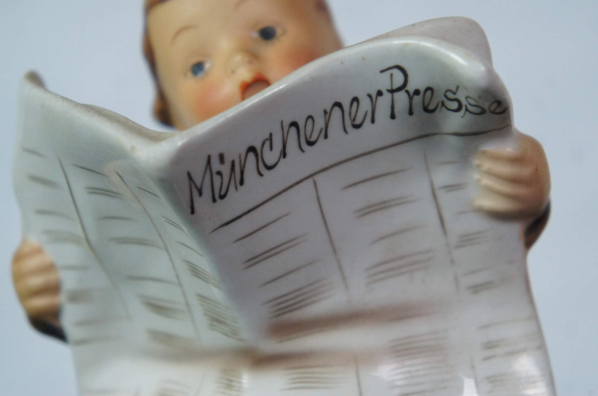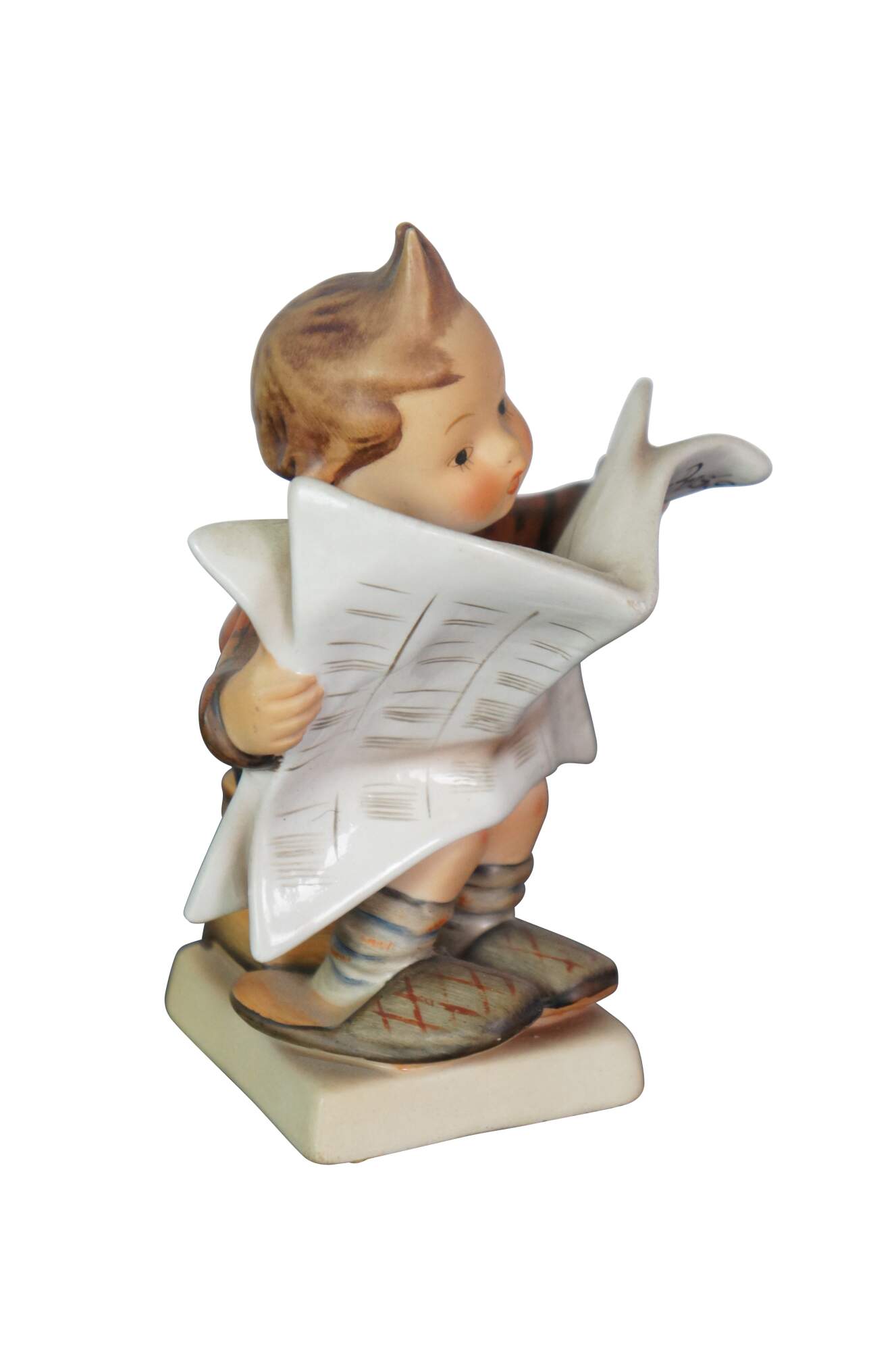 Mid 20th century Goebel / MI Hummel porcelain figurine 184 - Latest News, depicting a young boy seated on a wooden stool and reading the newspaper. Paper features the specialized title "Muchener Presse." TMK-2 Full Bee mark - Circa 1950-1955.
