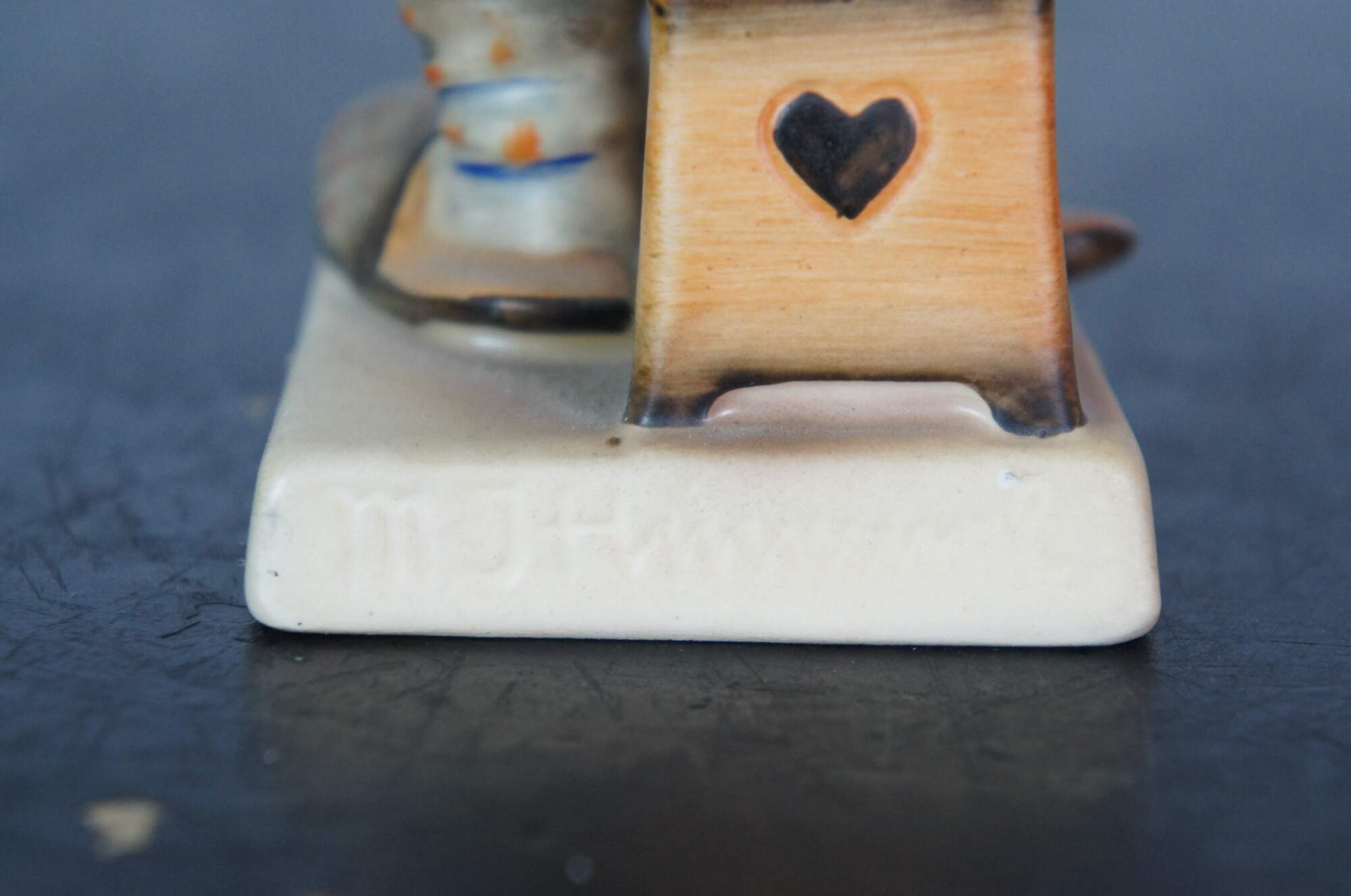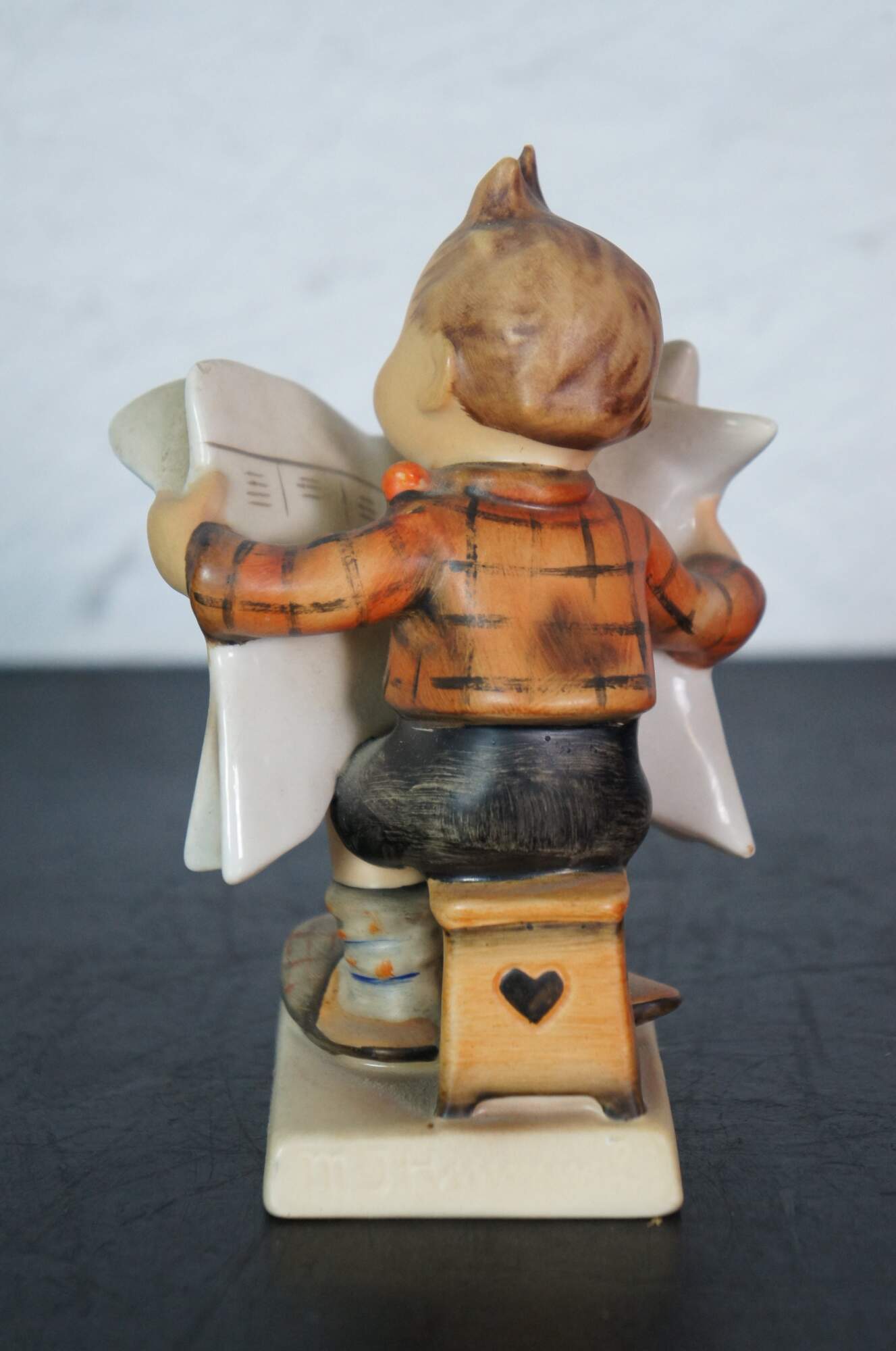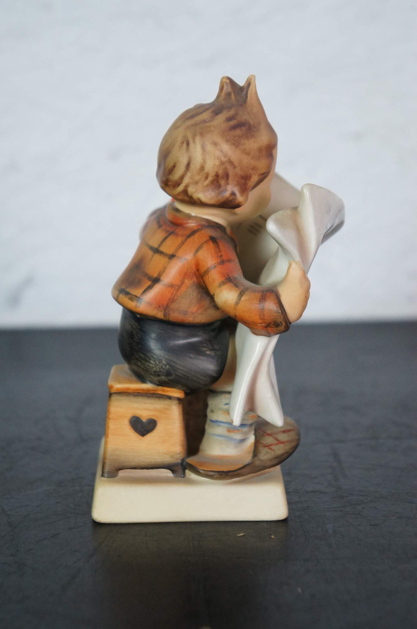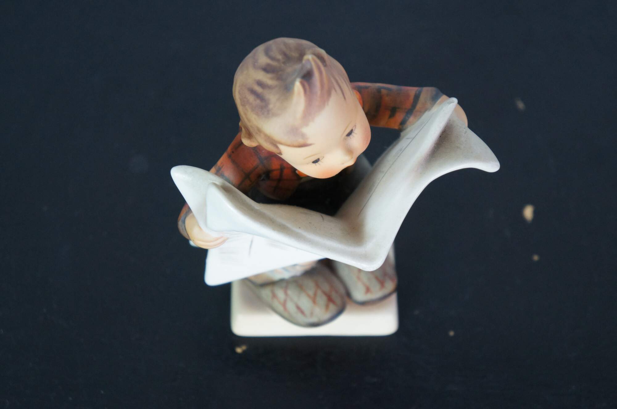 Mid 20th century Goebel / MI Hummel porcelain figurine 184 - Latest News, depicting a young boy seated on a wooden stool and reading the newspaper. Paper features the specialized title "Muchener Presse." TMK-2 Full Bee mark - Circa 1950-1955.