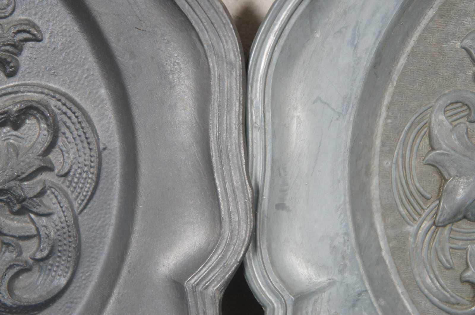 Pair of vintage Gesetzlich Geshützt German pewter plates with beveled scalloped edges. Features a coat of arms with Phoenix and lion over ornate detail.