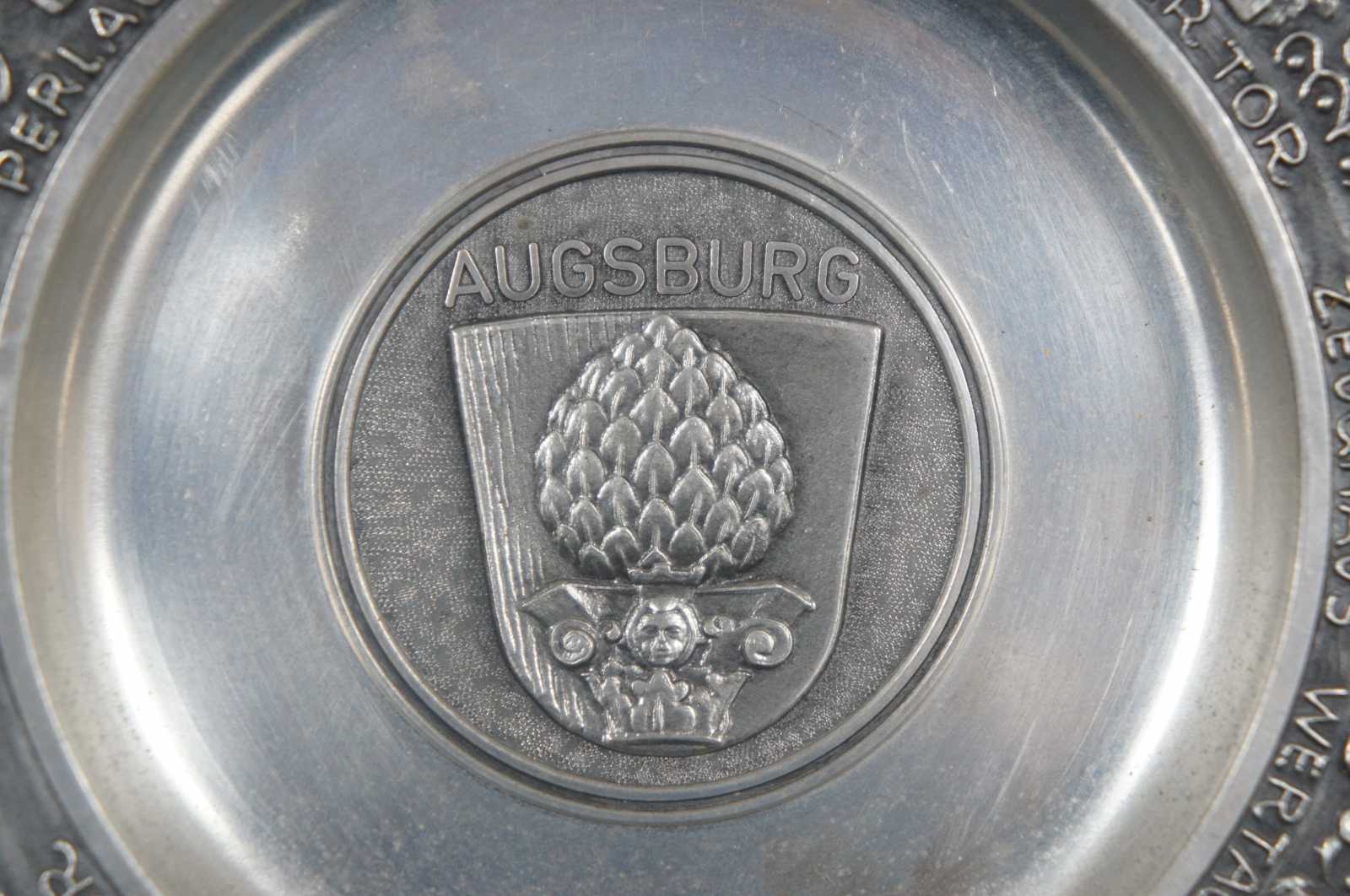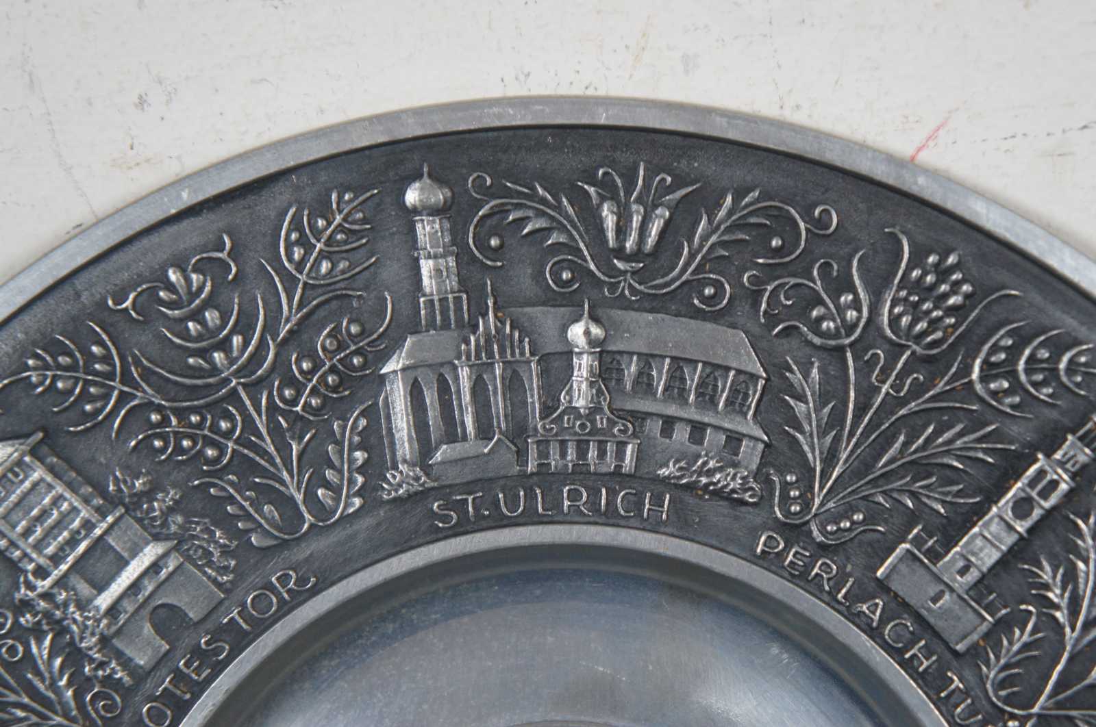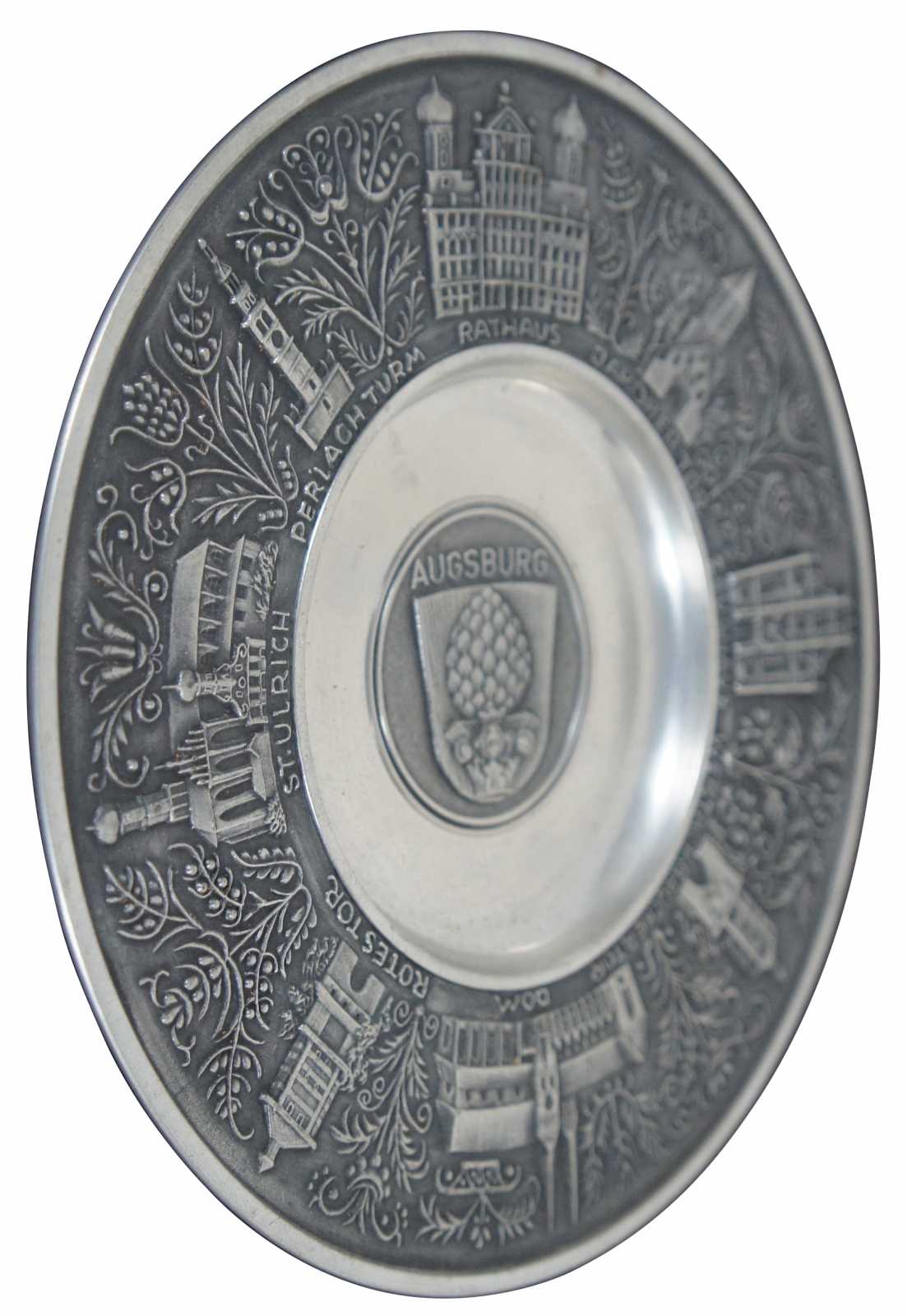 Vintage German souvenir pewter plate for the city of Augsburg made by Anton Schreiner Nabburg.