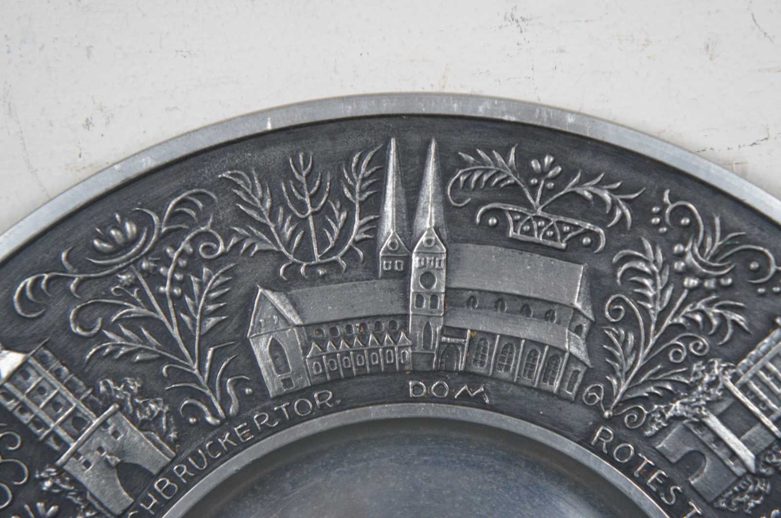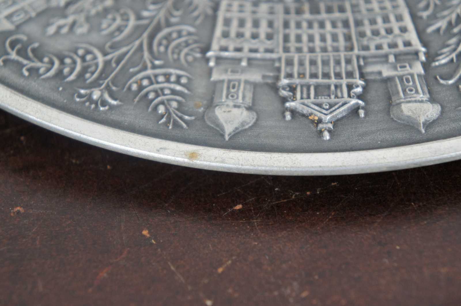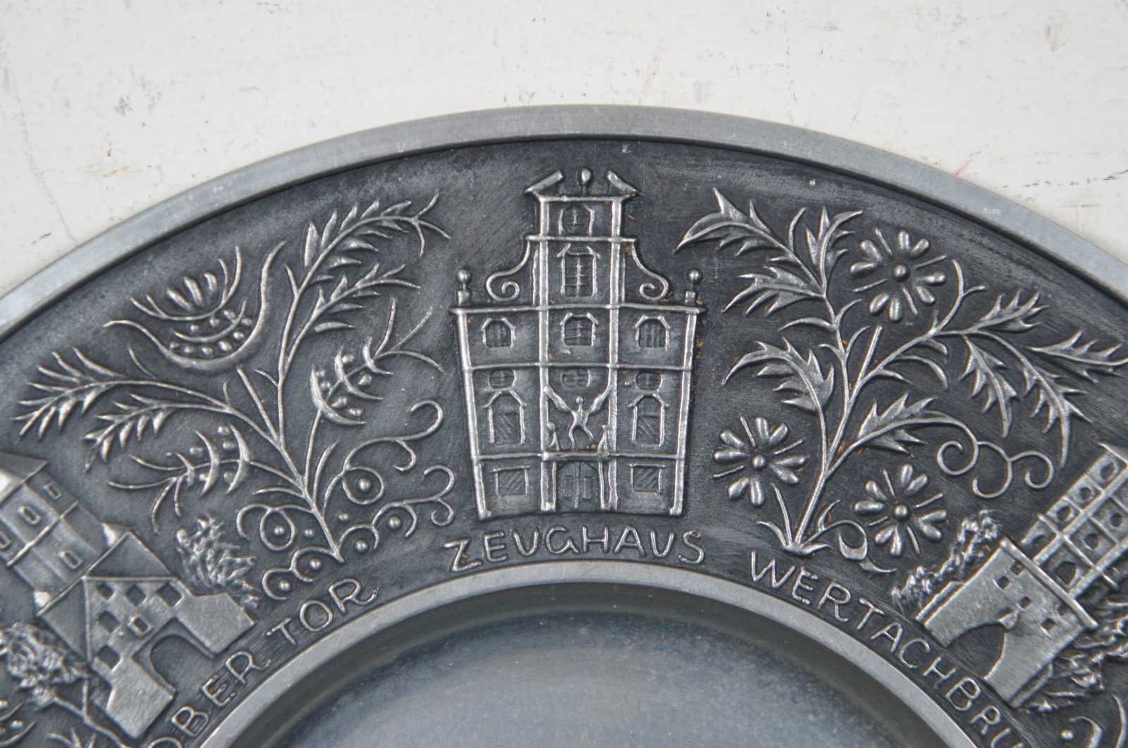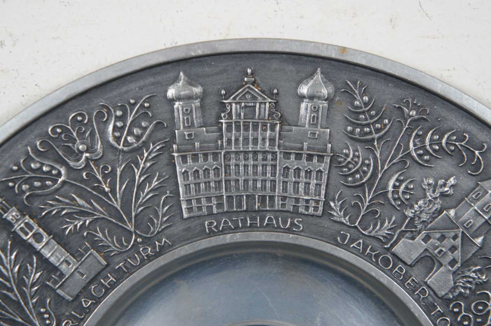 Vintage German souvenir pewter plate for the city of Augsburg made by Anton Schreiner Nabburg.