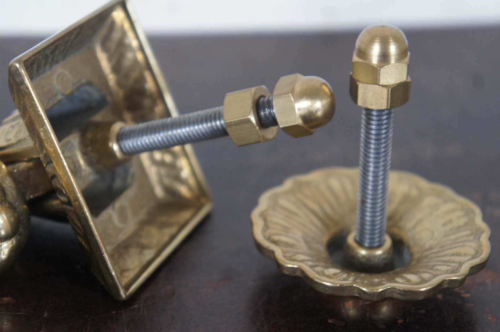 Vintage solid brass figural Victorian style door knocker in the shape of a hand holding a ball with detailed sleeve and scalloped edge striker.