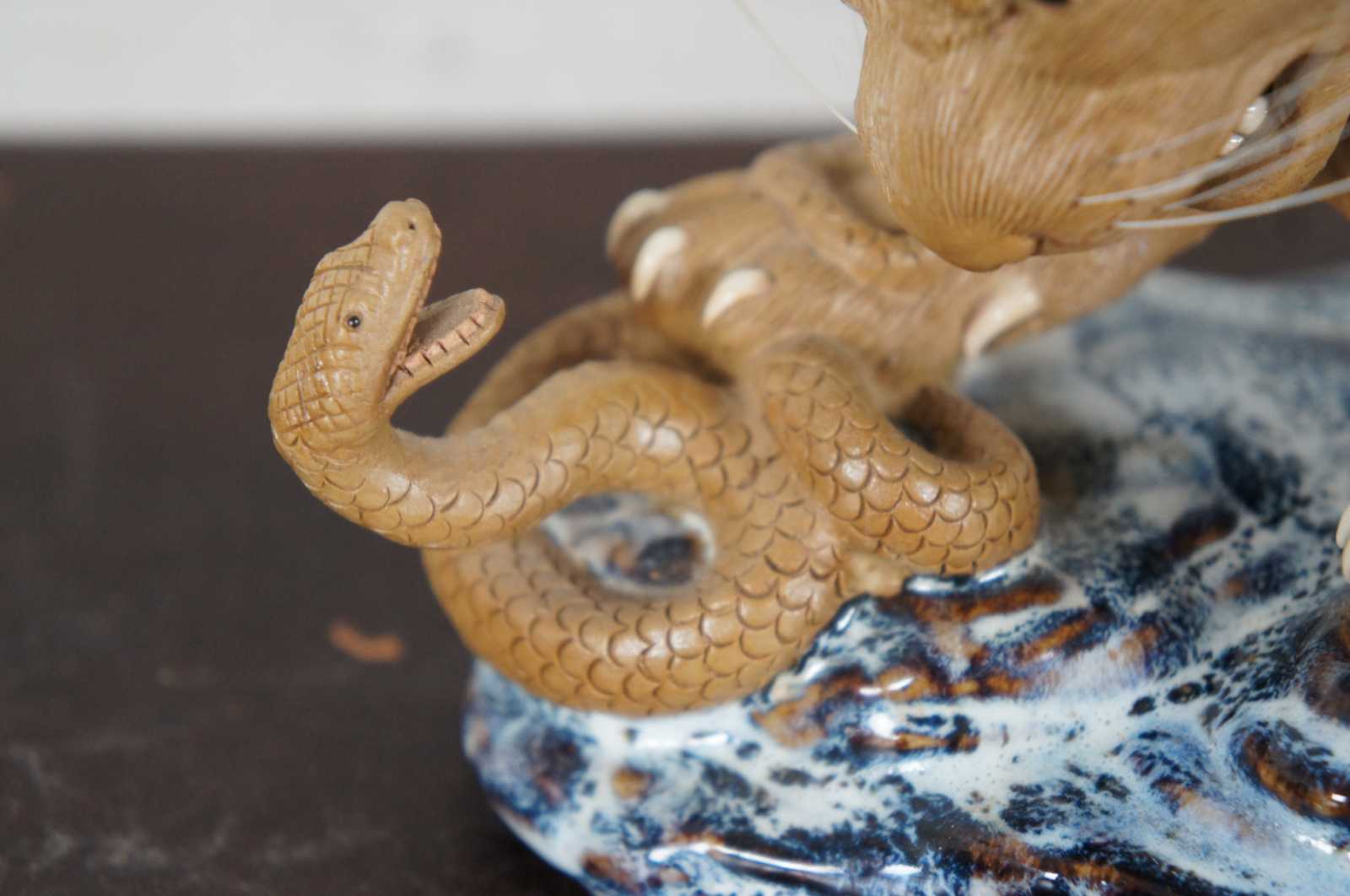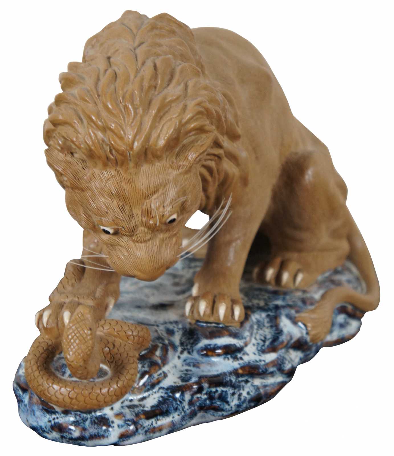 Vintage Chinese porcelain figurine of a lion fighting a snake styled after a bronze sculpture by Antoine-Louis Barye. “Antoine-Louis Barye was a Romantic French sculptor most famous for his work as an animalier, a sculptor of animals. “