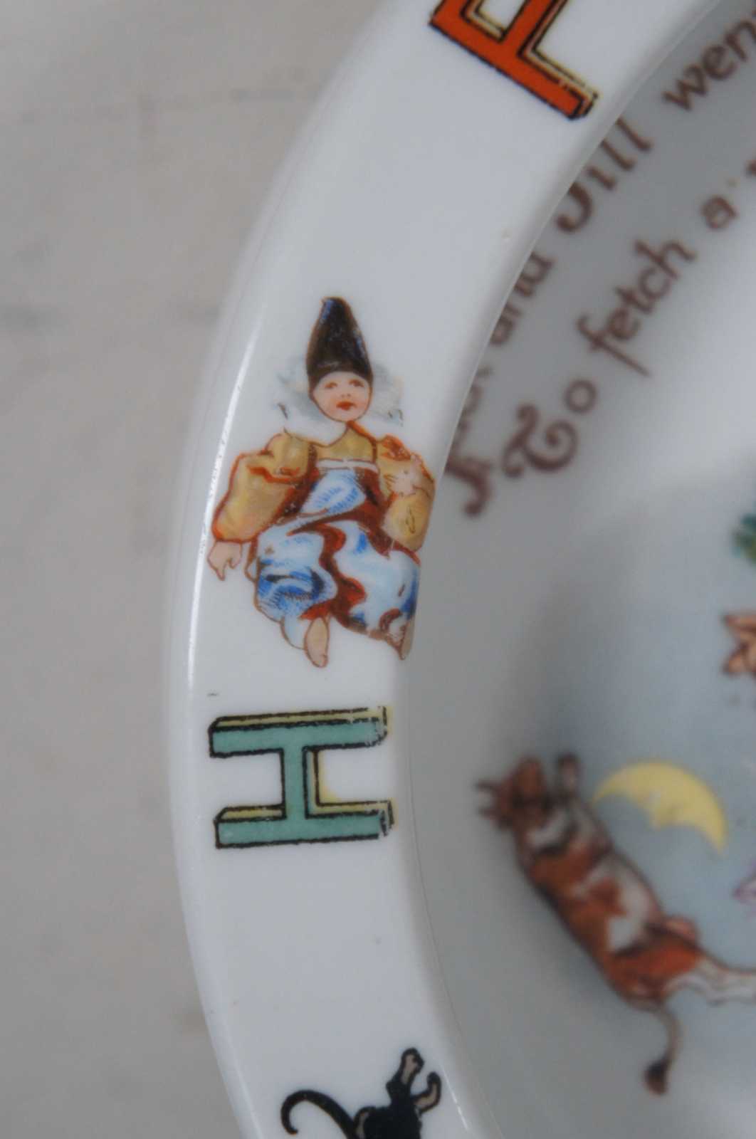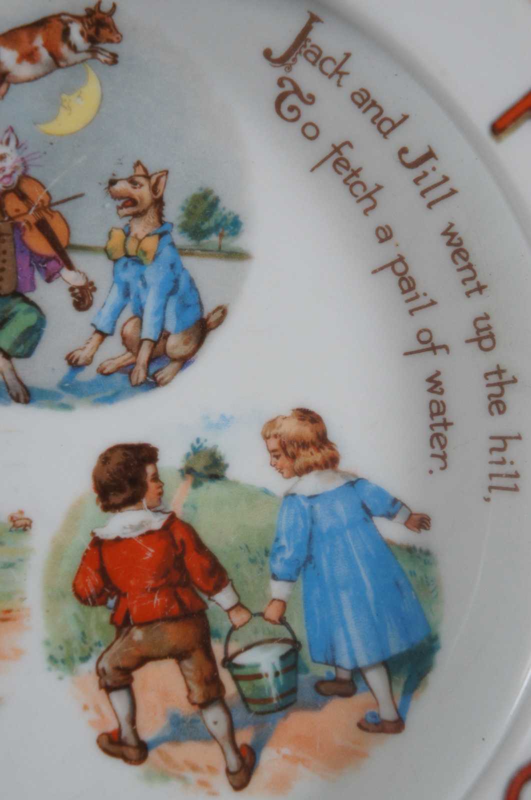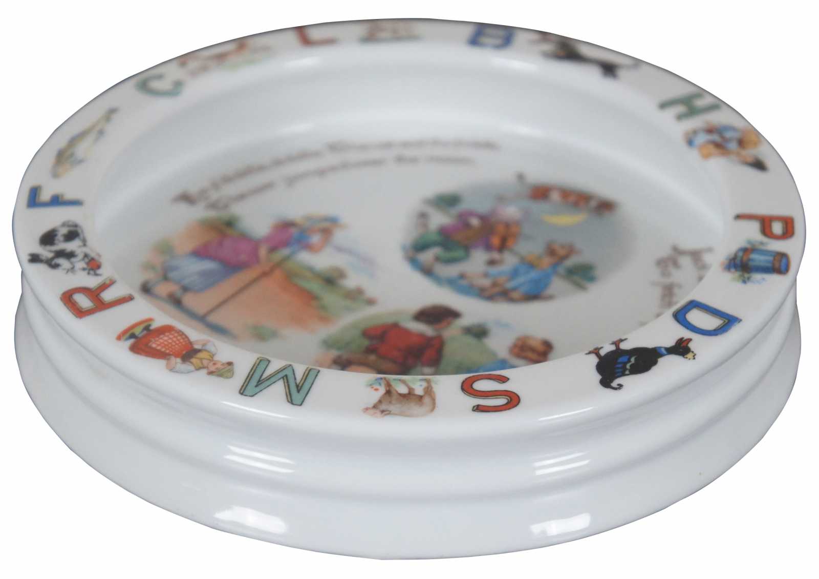Vintage German porcelain dish bordered with an incomplete alphabet and an interior filled with partial scenes from Mary Had a Little Lamb, Jack and Jill and Hey Diddle Diddle.