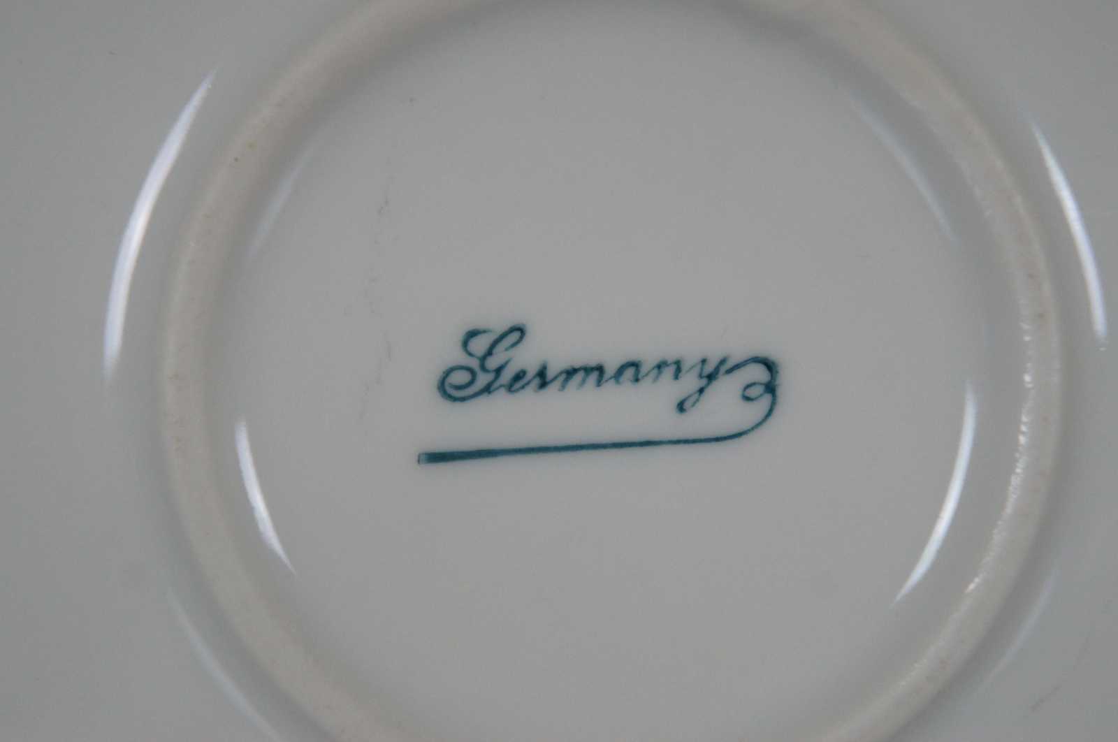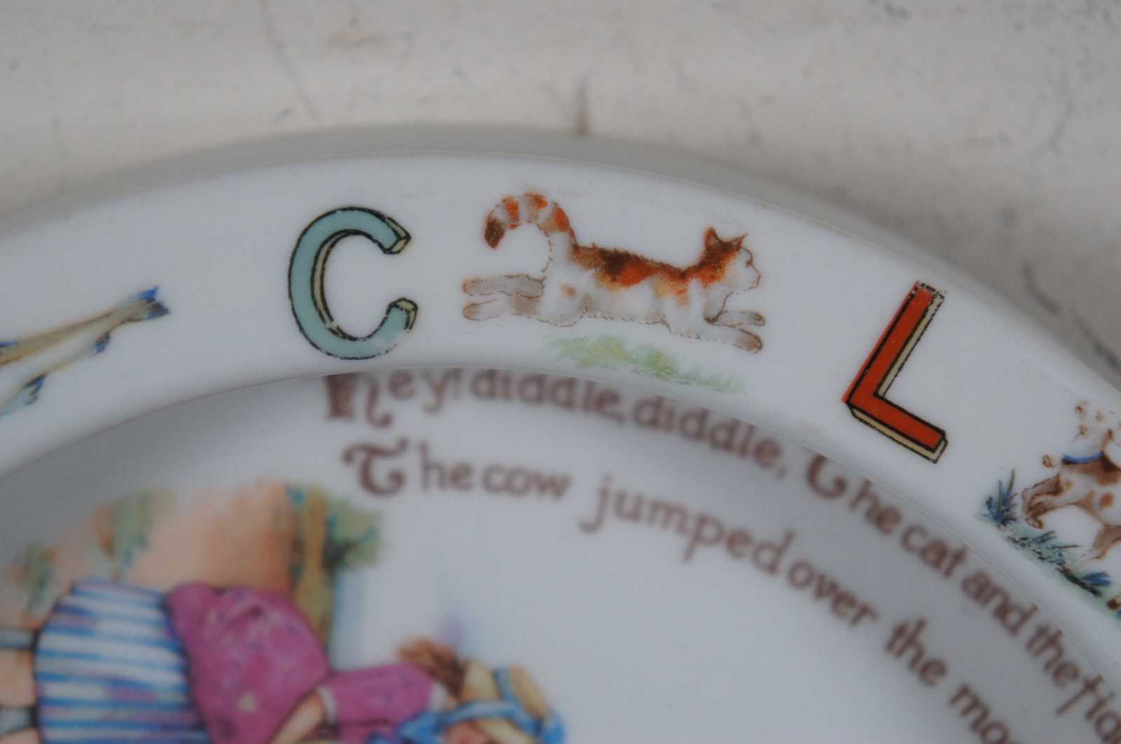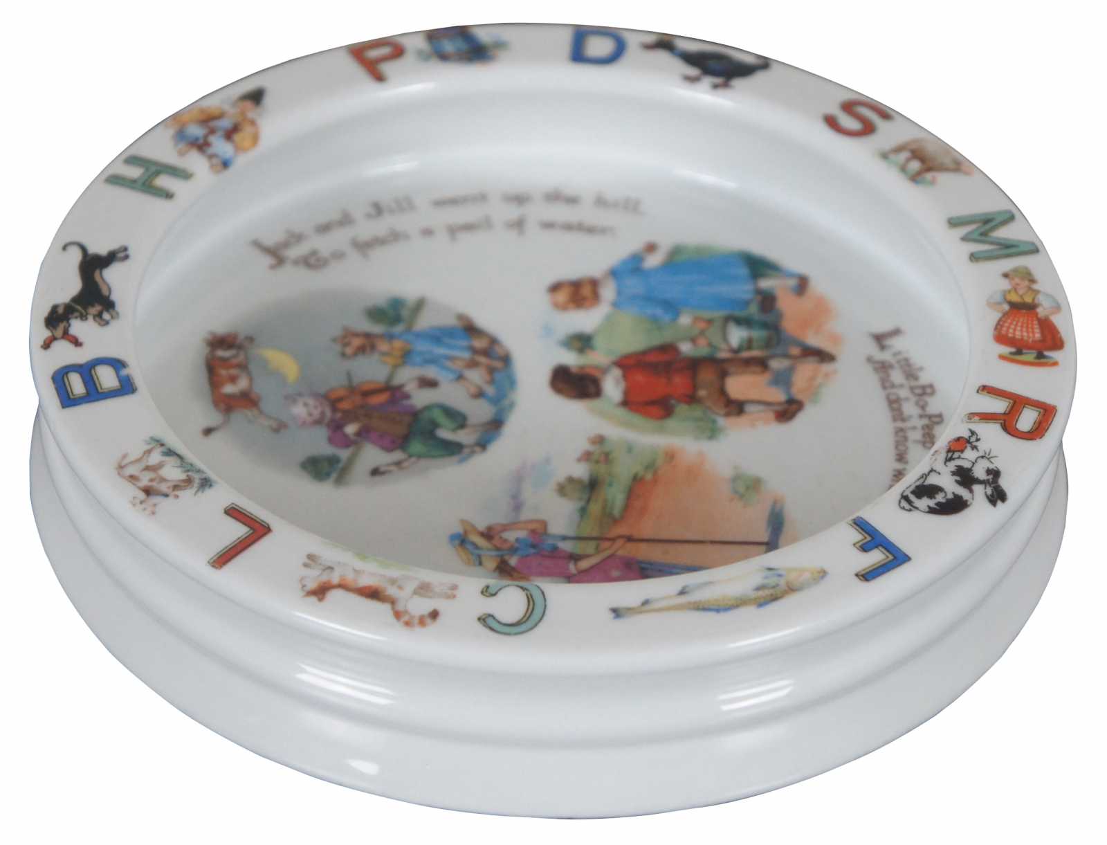Vintage German porcelain dish bordered with an incomplete alphabet and an interior filled with partial scenes from Mary Had a Little Lamb, Jack and Jill and Hey Diddle Diddle.