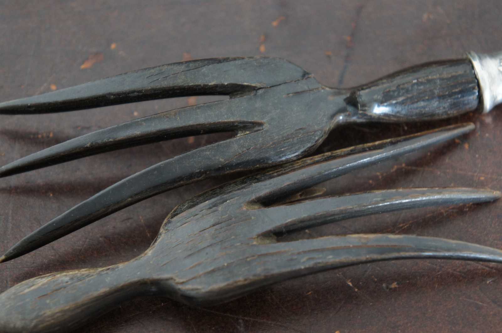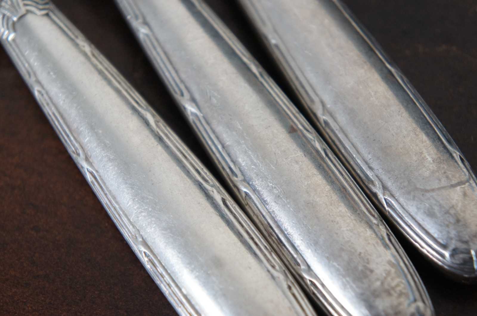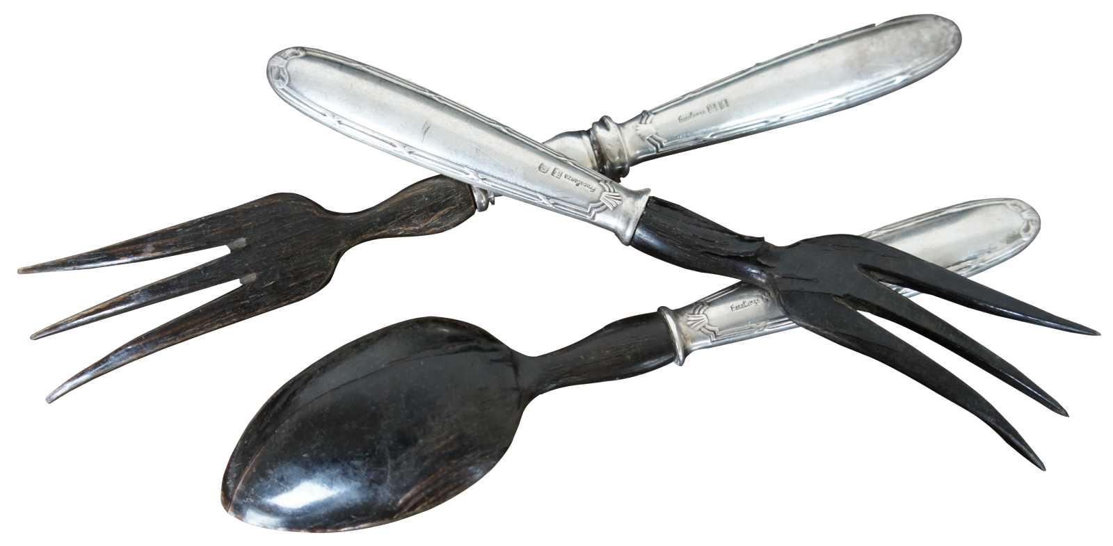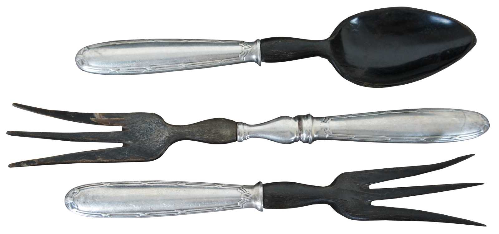 Vintage three piece salad tosser set by Fracalanza with wood tops and silver plate handles. In 1884, Angelo Fracalanza began his industrial enterprise in Sao Paulo starting with the manufacture of silver plate items. Later, the firm began to produce house ware items, reaching a high level of craftsmanship in the production of flatware, tea and coffee services in Alpaca metal