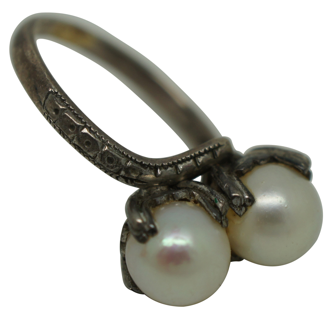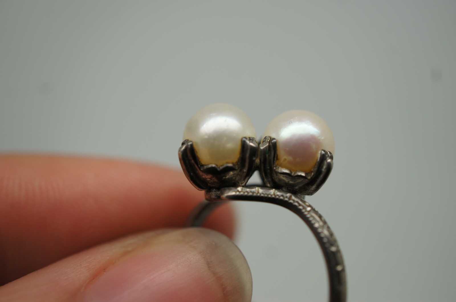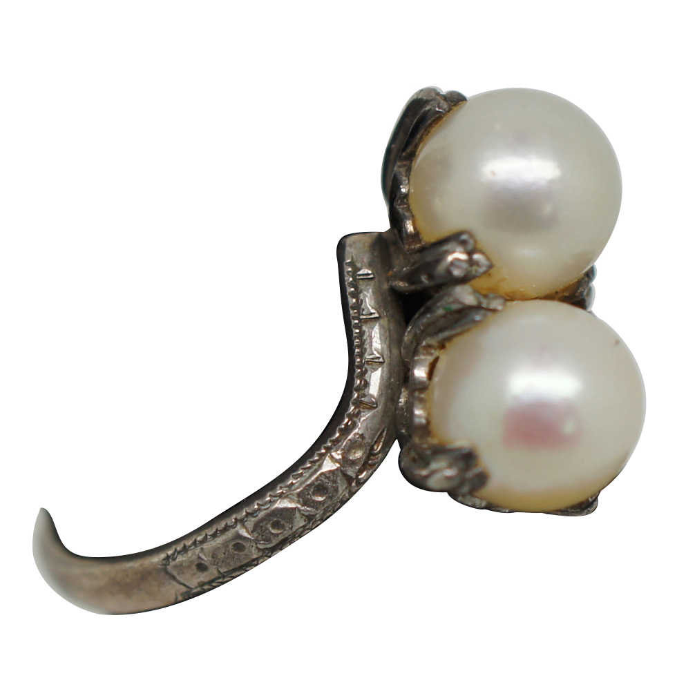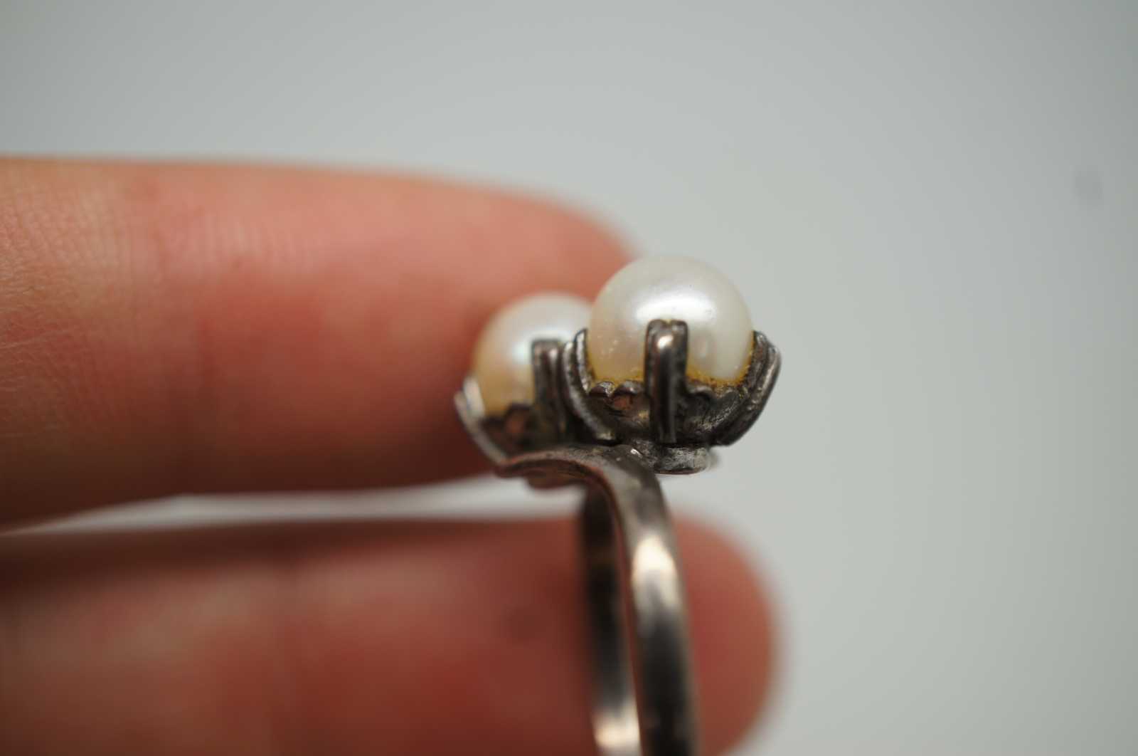 Mid century art deco style sterling silver 925 ring set with a pair of cultured pearls.