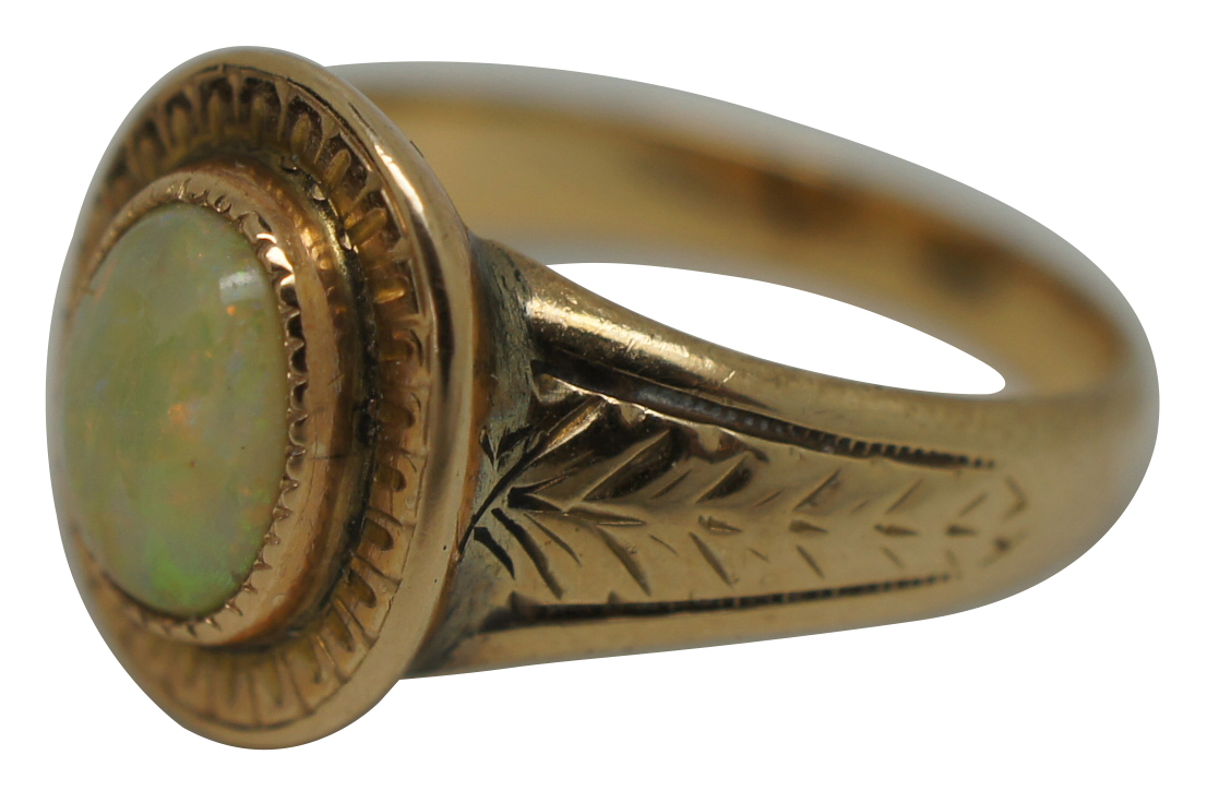 Antique 10k gold ring with Victorian styling, set with a cabochon opal and ornate detail.