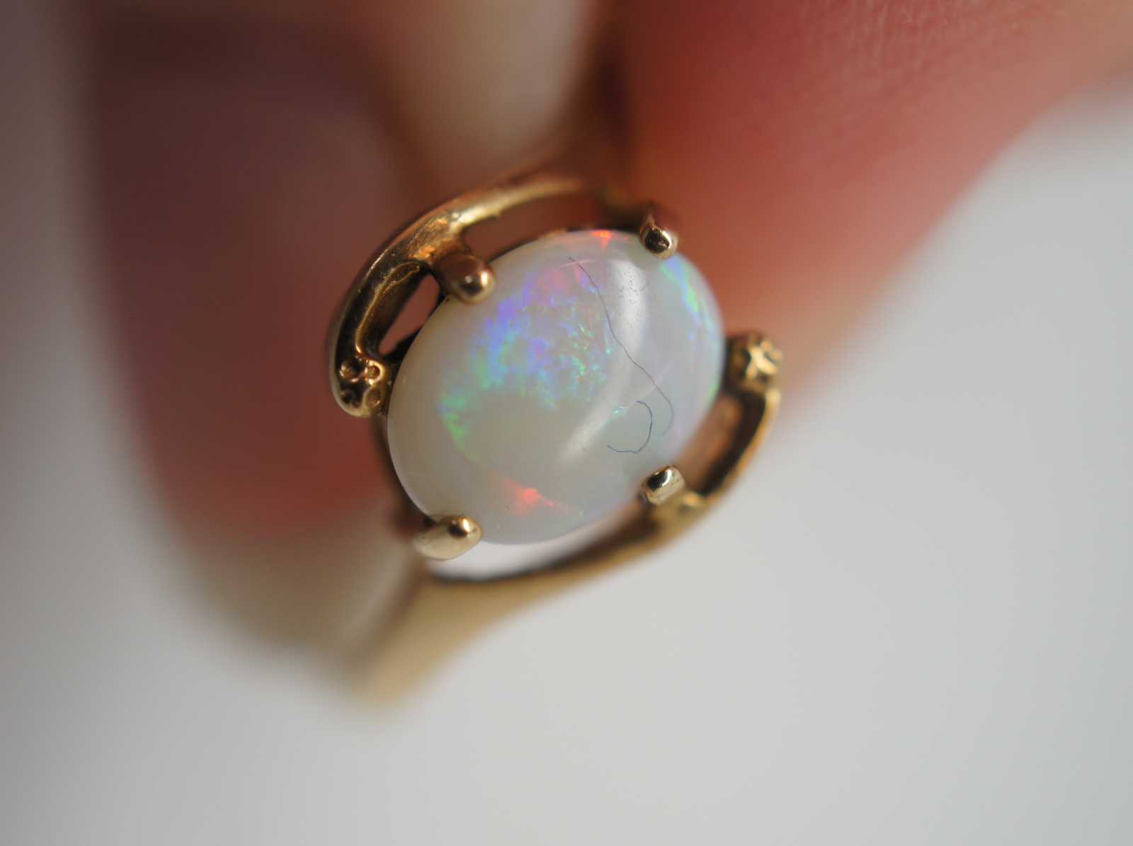 Vintage 10K gold filled ring with an oval solitaire fiery white opal.