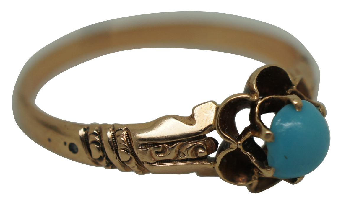 Antique Victorian 10K gold buttercup / floral shaped ring set with a cabochon turquoise stone, crafted by the Allsopp Brothers.