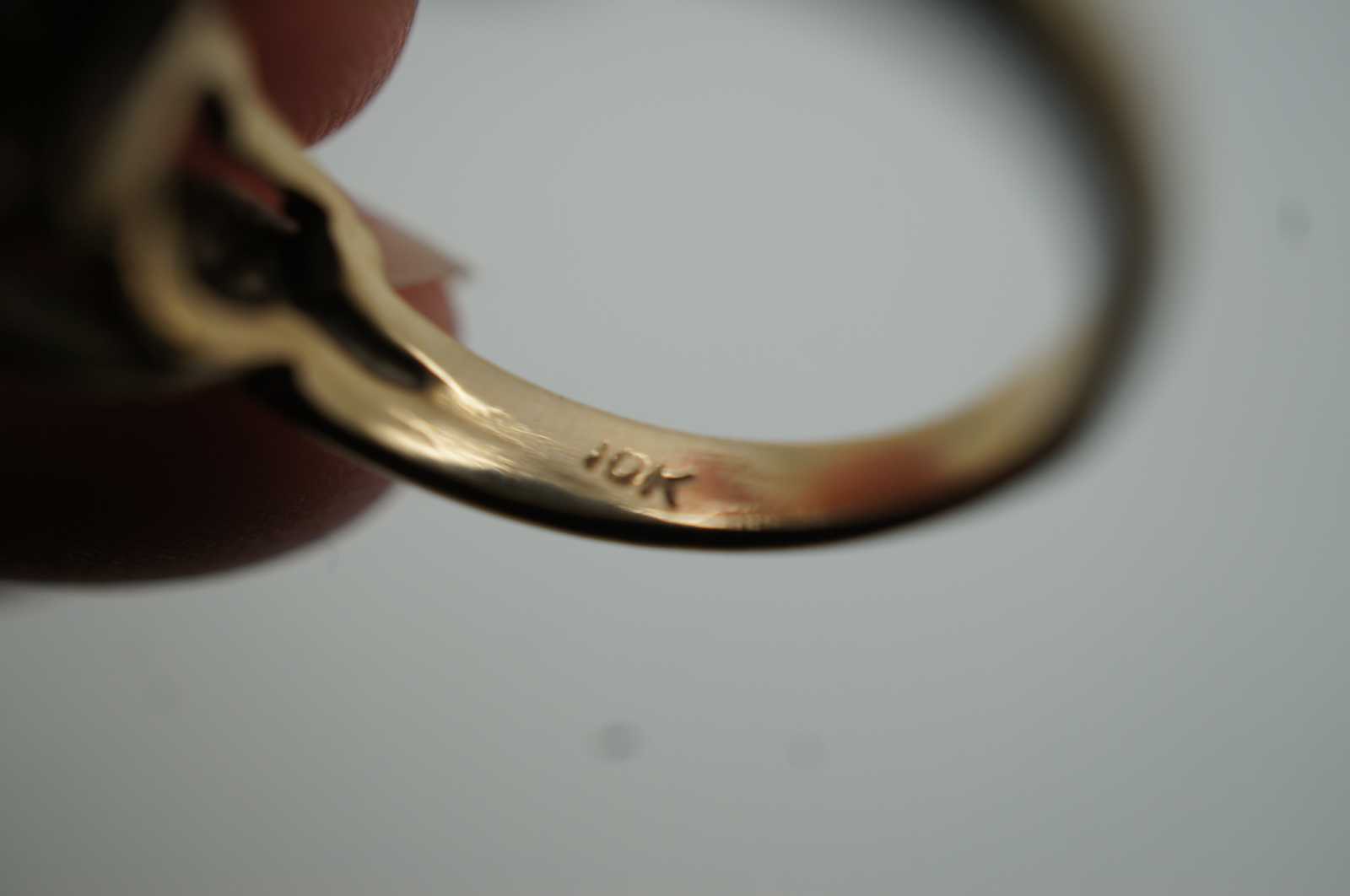 Antique 10k yellow gold ring with art nouveau and reticulated styling on the band, set with an oval cut blue topaz.