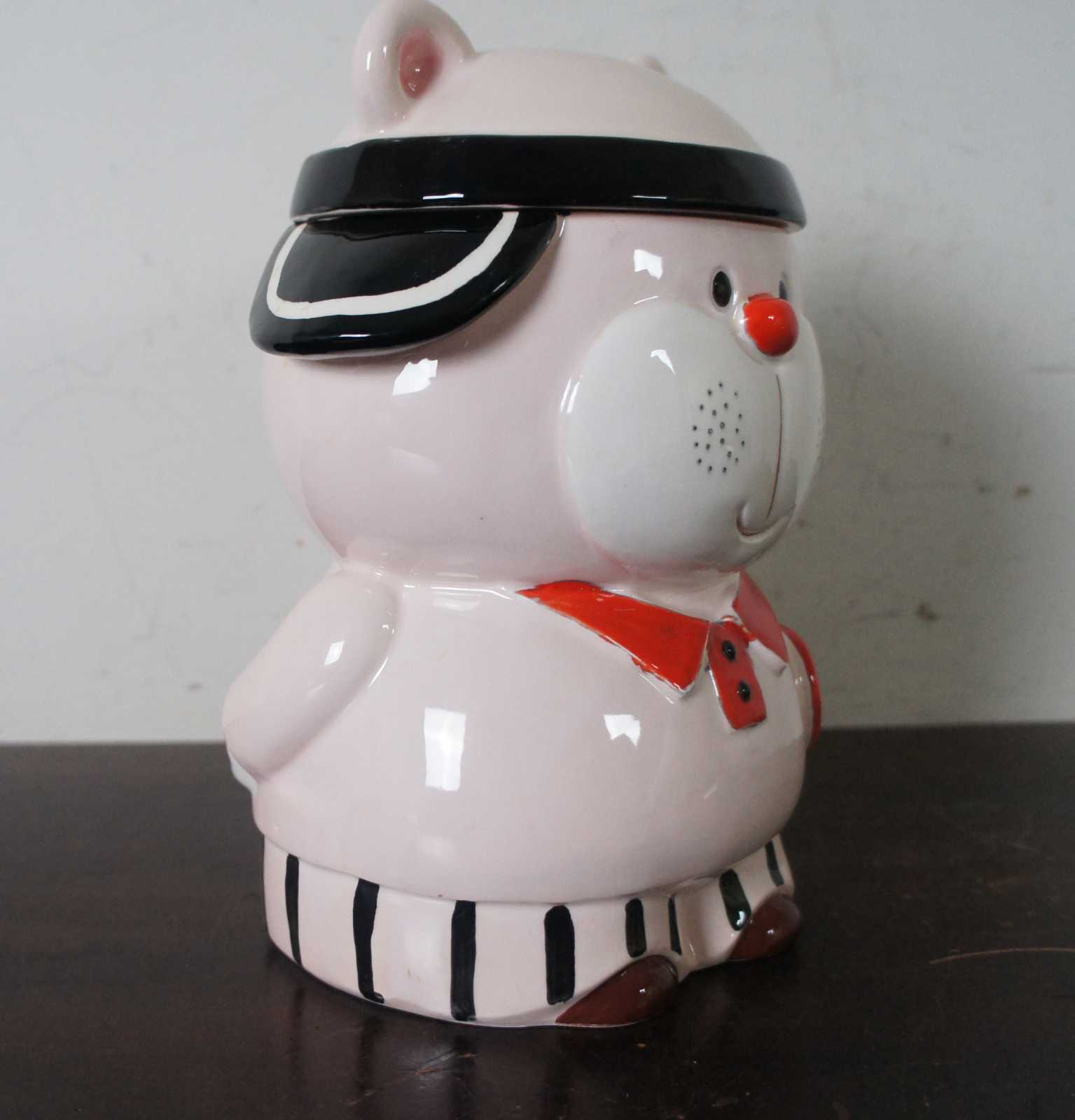 Vintage made in Japan porcelain cookie jar in the shape of a pink bear dressed up to play tennis.