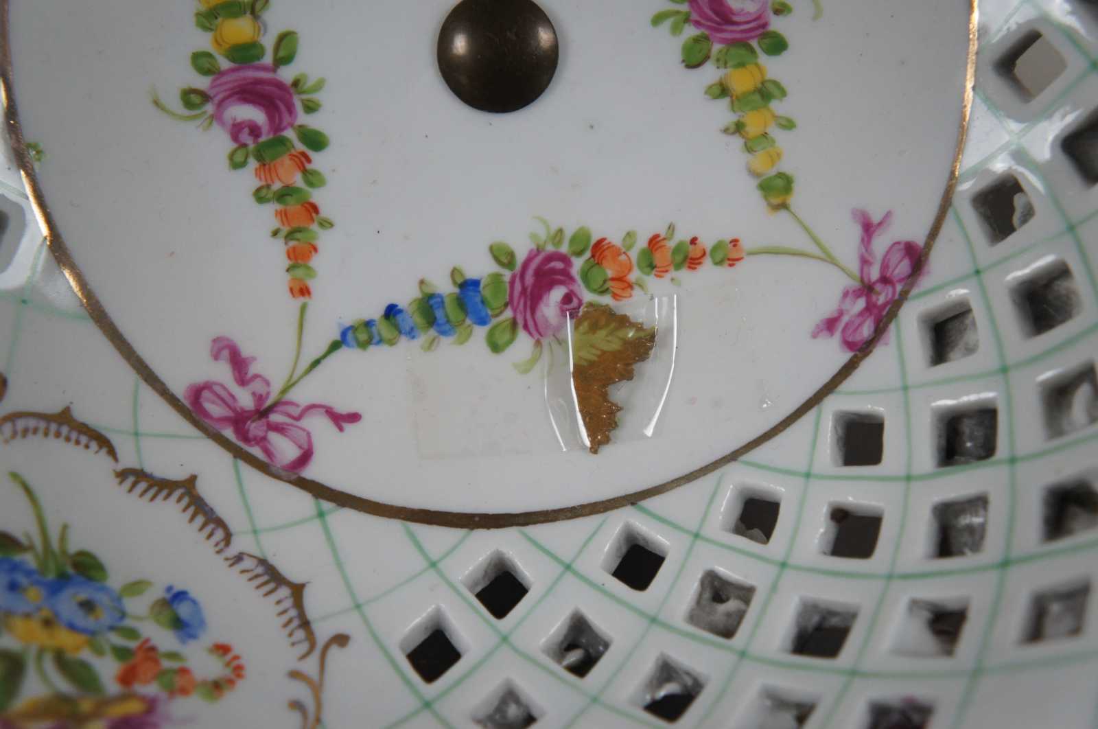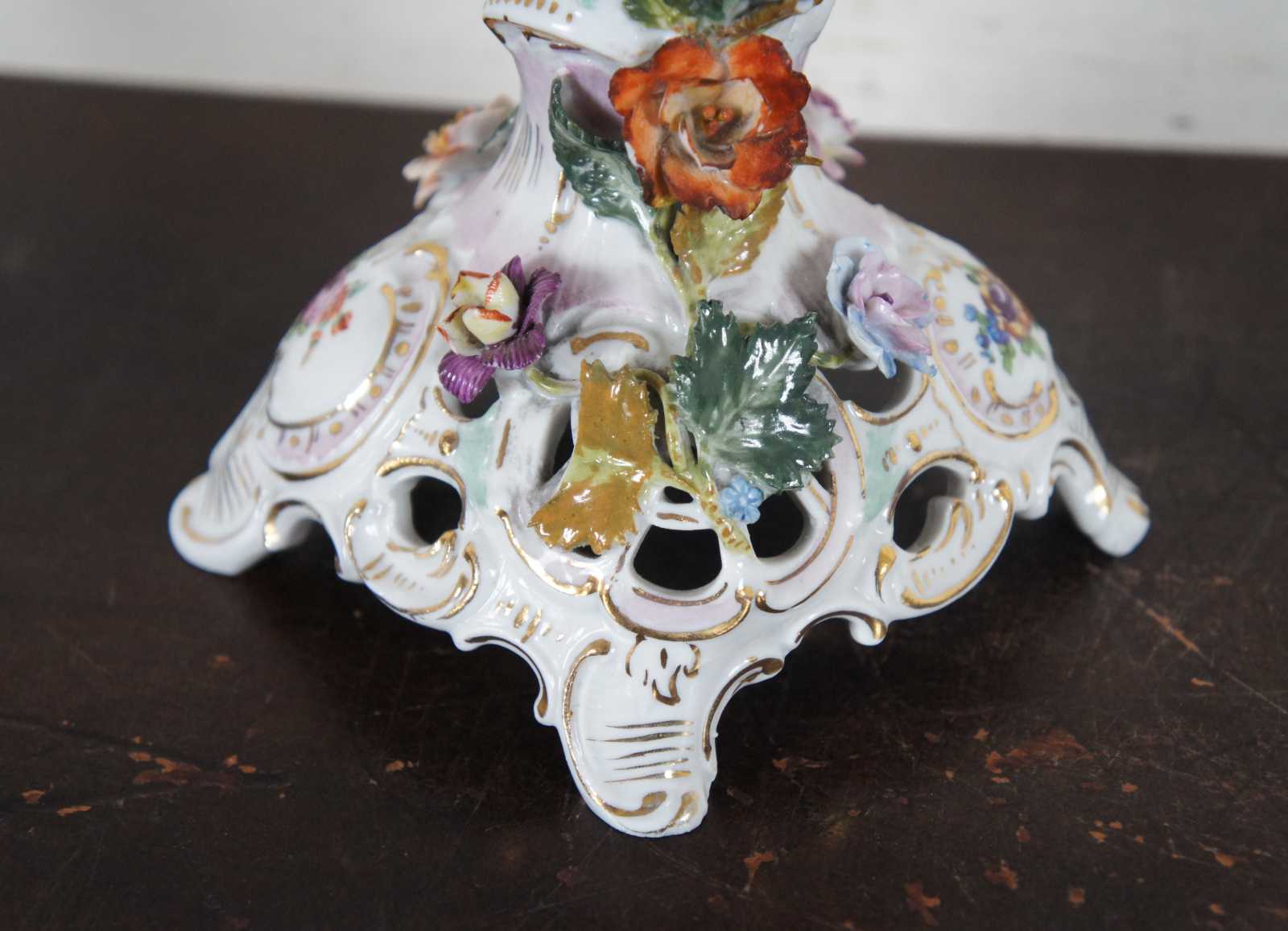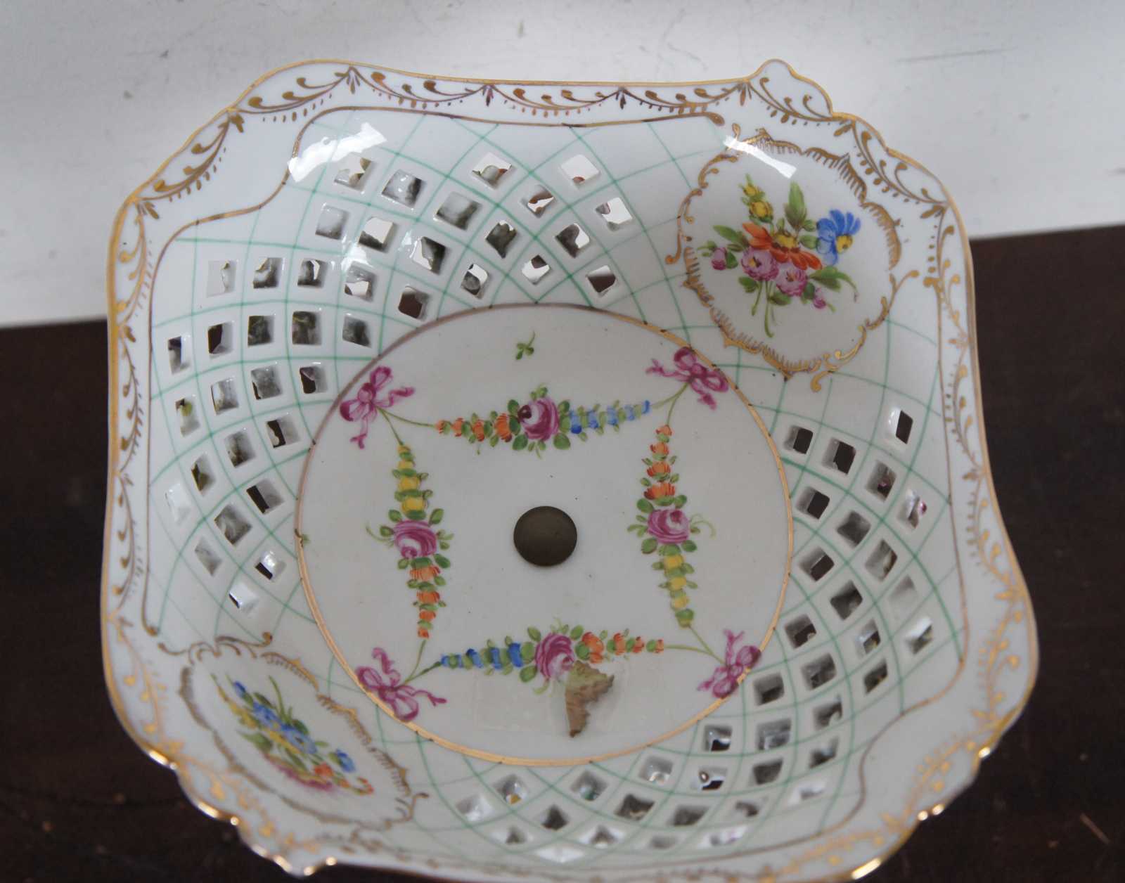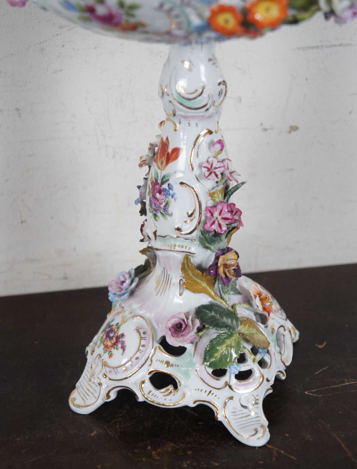 Antique early 20th century Dresden Porcelain tall pierced footed compote with hand painted lattice design with flowers and gilding, accented with delicate three dimensional blossoms throughout. Attributed to Carl Thieme. “The Sächsische Porzellan-Manufaktur Dresden GmbH (Saxon Porcelain Manufactory in Dresden Ltd), generally known in English as Dresden Porcelain, is a German company for the production of decorative and luxury porcelain. Founded in 1872, it is located in Potschappel, a suburb of the town of Freital in the Sächsische Schweiz-Osterzgebirge district about 8 km (5 mi) southwest of Dresden, the capital of Saxony. Dresden Porcelain introduced its blue "SP Dresden" trademark in 1902.”