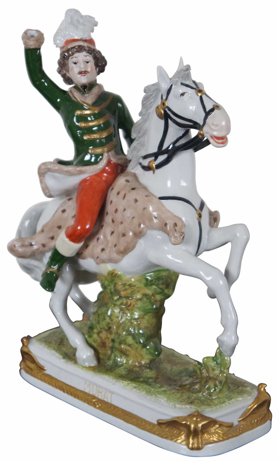 Antique Kister porcelain figurine of Joachim Murat riding a white horse. “A.W. Fr. Kister Porcelain Manufactory of Scheibe-Alsbach, Thuringia, Germany, used this mark from 1900 to 1972. ("A.W. Fr." stands for "August Wilhelm Fridolin.") The company was in business from 1838 until 1991.” “Joachim Murat (25 March 1767 – 13 October 1815) was a French military commander and statesman who served during the French Revolutionary Wars and the Napoleonic Wars. Under the French Empire he received the military titles of Marshal of the Empire and Admiral of France, and was also the 1st Prince Murat,[1] Grand Duke of Berg from 1806 to 1808,[2] and, as Joachim-Napoleon, King of Naples from 1808 to 1815.[5] He was the brother-in-law of emperor Napoleon I, who characterized him as exceptionally brave in the face of the enemy, a weakling when he was on his own, a braggart dressed in gold and feathers, continually escaping as by a miracle and admired by the cossacks for his bravery.”