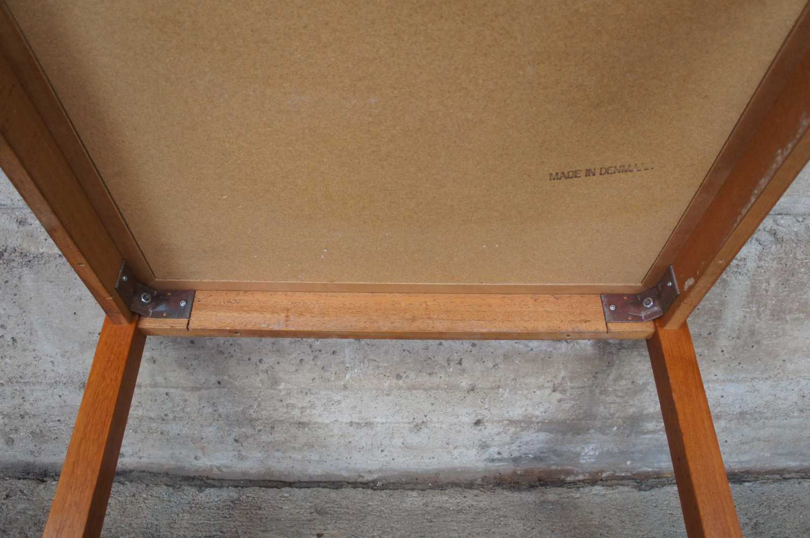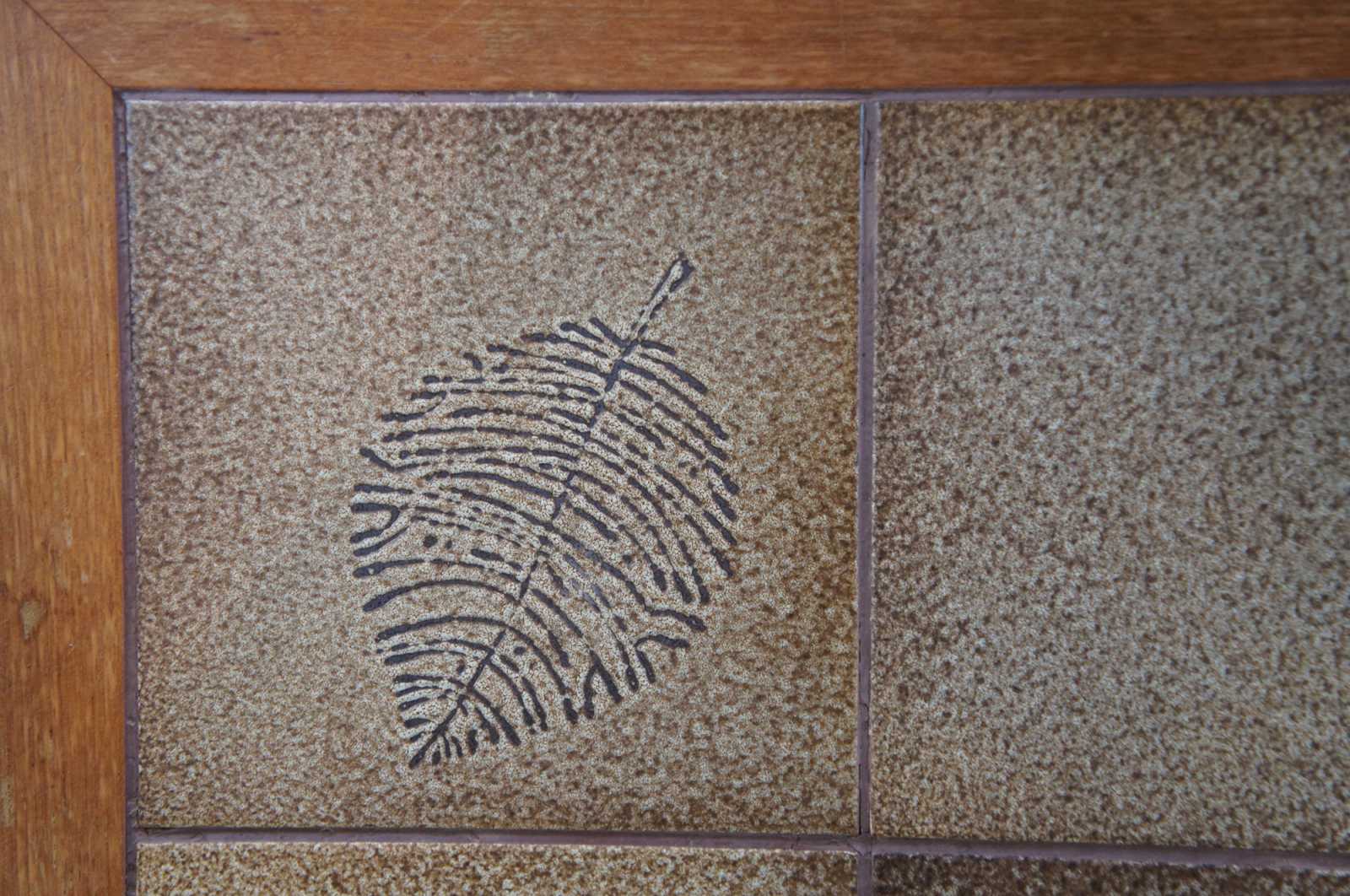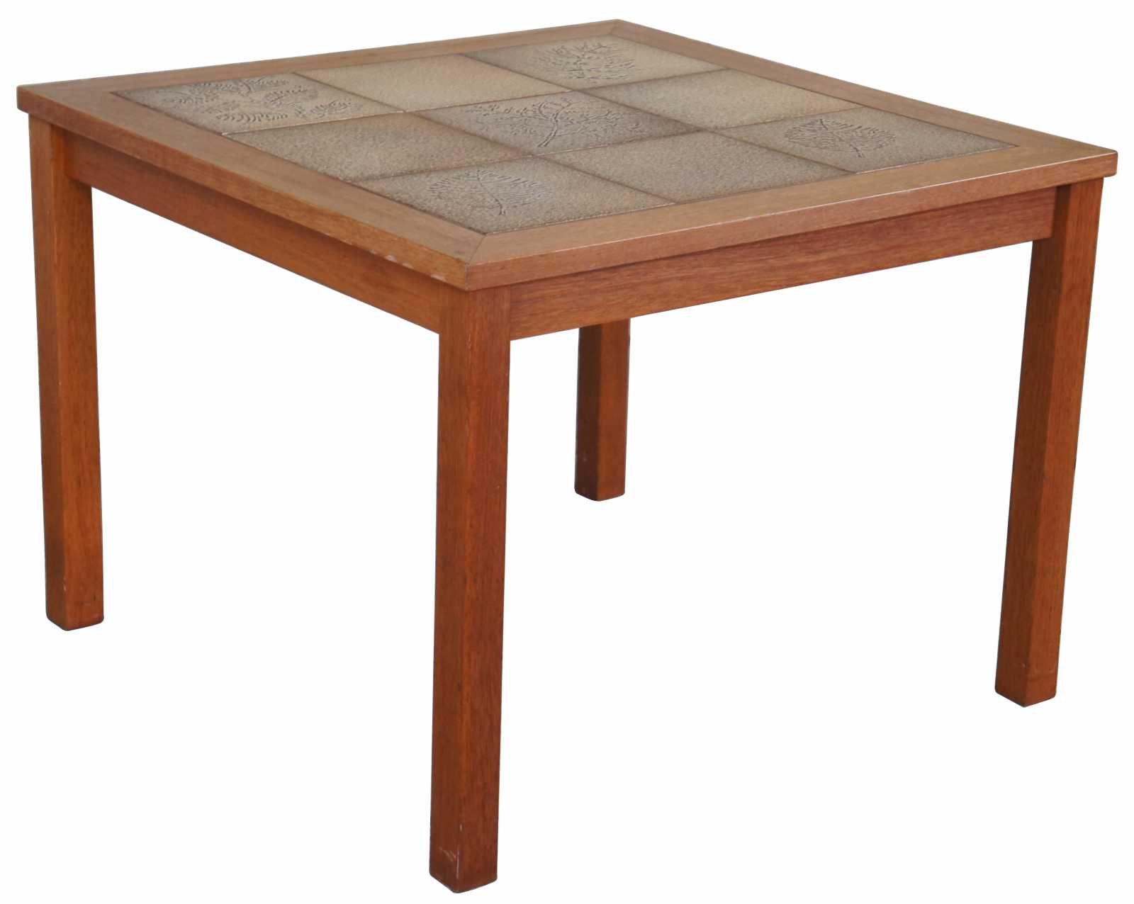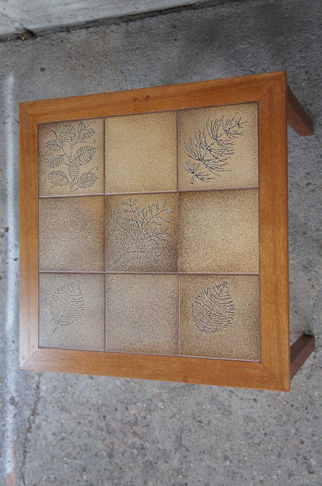 Danish modern square teak side accent table. Made of teak wood featuring a floral / leaf motif tiled top.