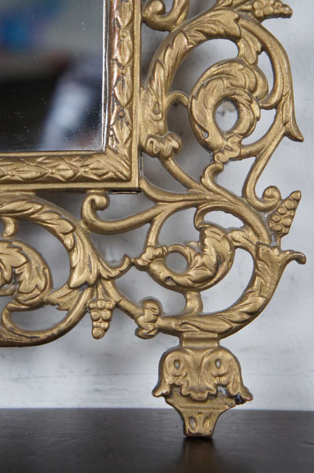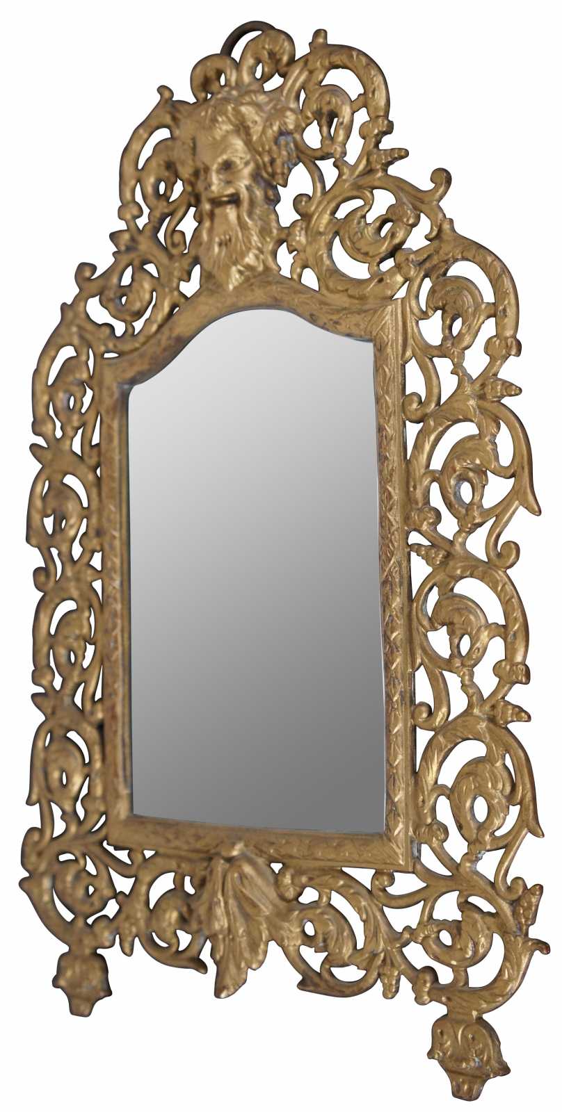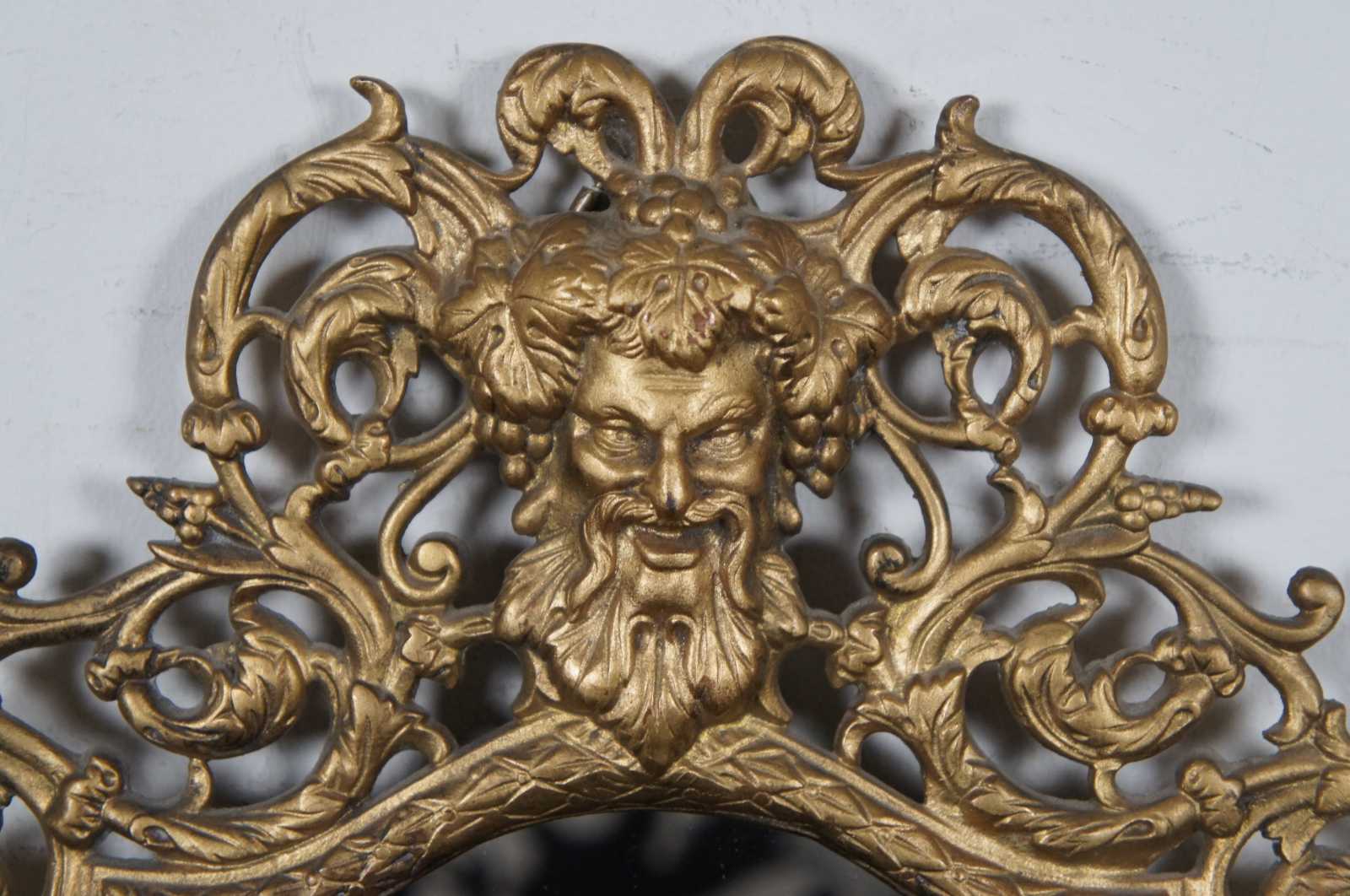Antique gilded cast iron wall hanging mirror with an ornate frame of swirling leaves around the face of Bacchus or Dionysus.