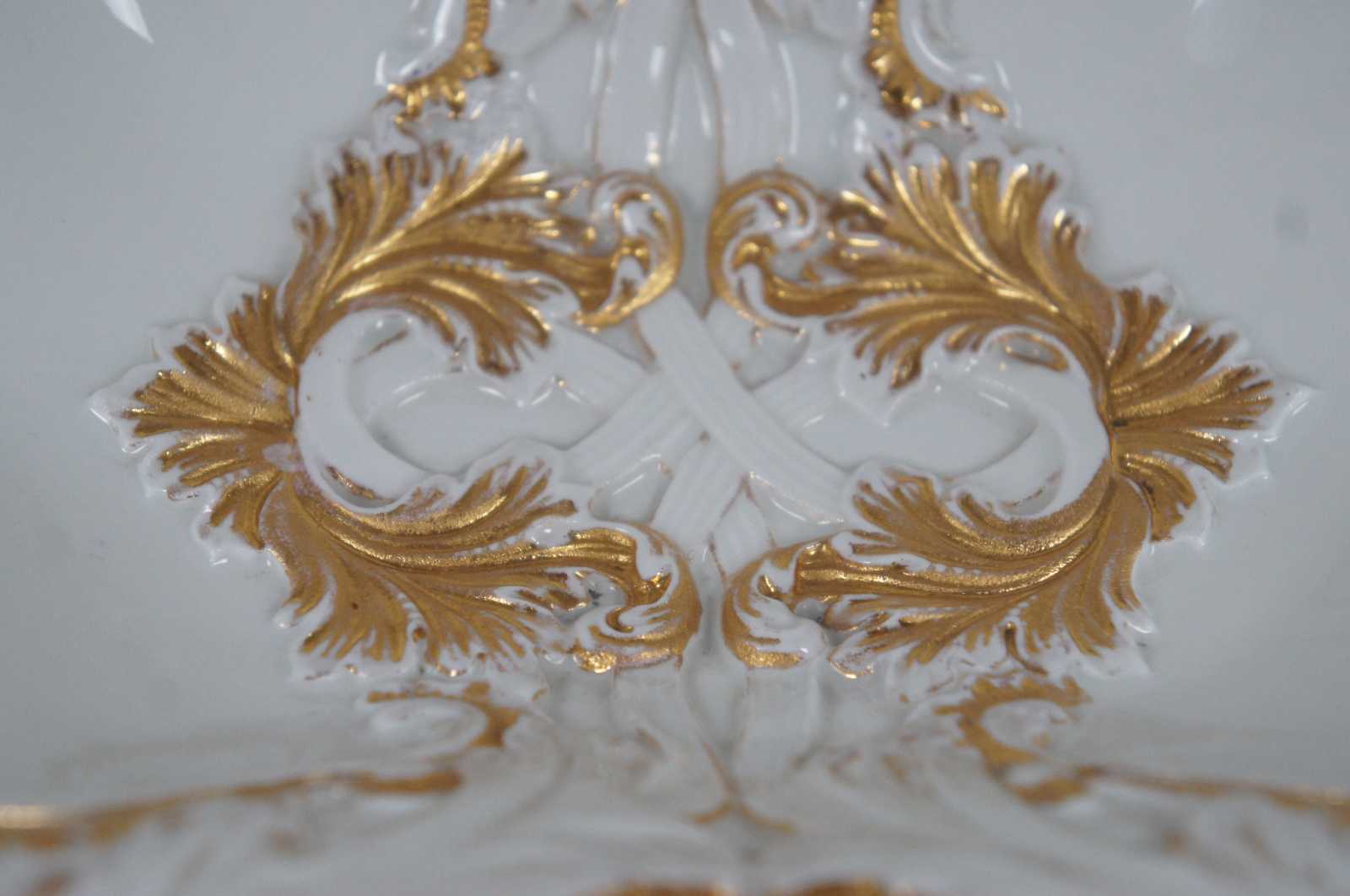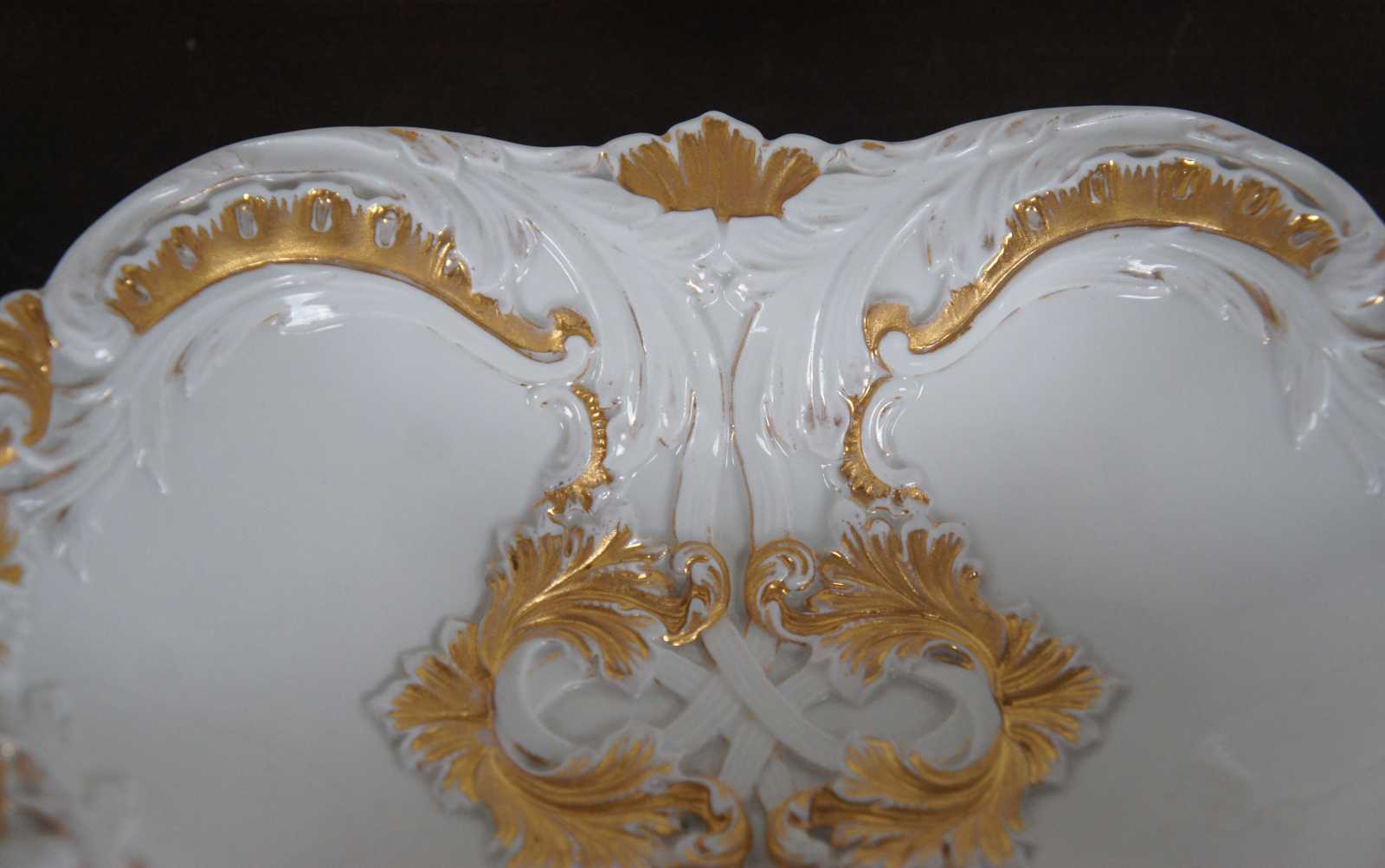 Antique Meissen porcelain scalloped oval dish, crossed sword mark circa 1825-1924, with a low relief pattern of basket weave and gilded leaves.