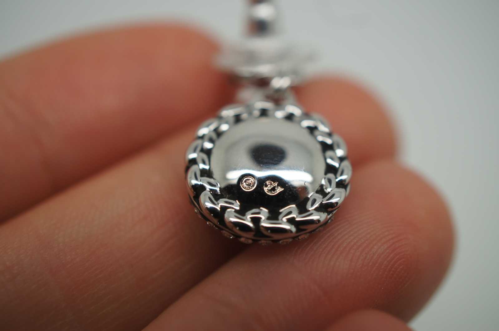 Swarovski crystal rhodium plated post back pierced earrings featuring a large pearl surrounded by a braided metal ring and a line of white crystals. 5032776 , 1181651 .