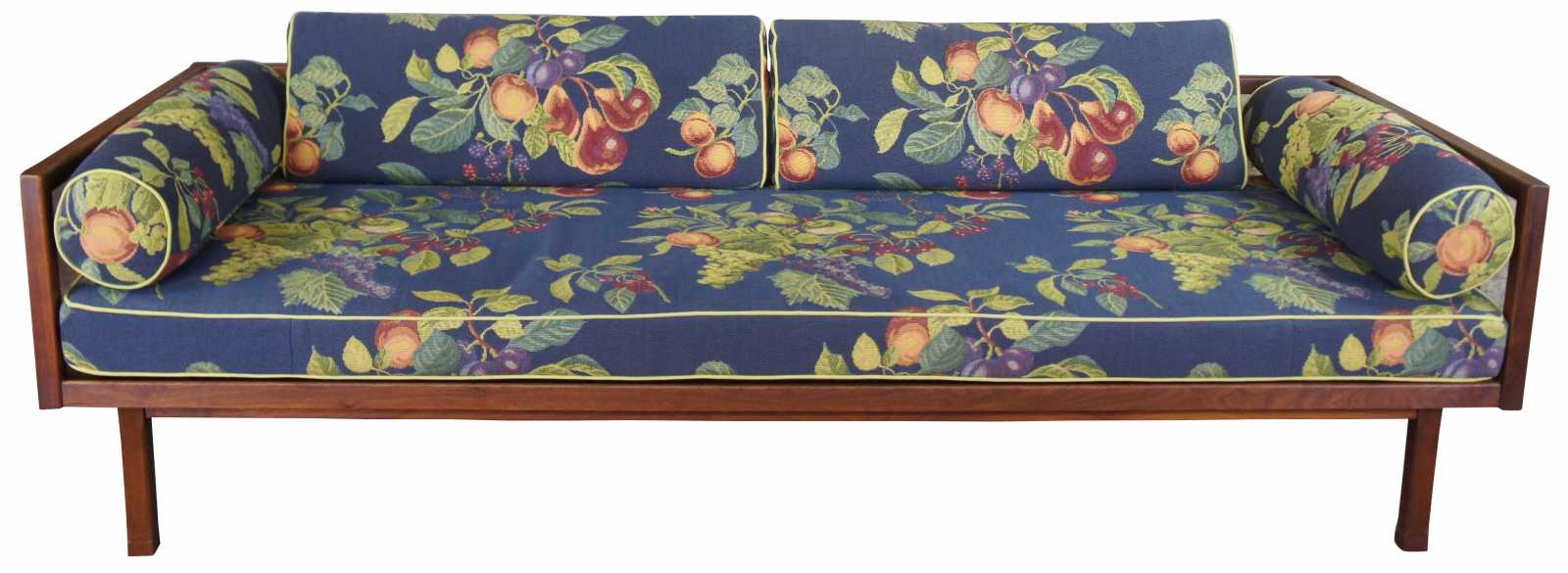 Vintage mid century lounge sofa or couch designed by John Stuart for Rubee Furniture Company of Chicago. Made of Rosewood featuring Danish styling and a blue floral still life of fruit styled upholstery.