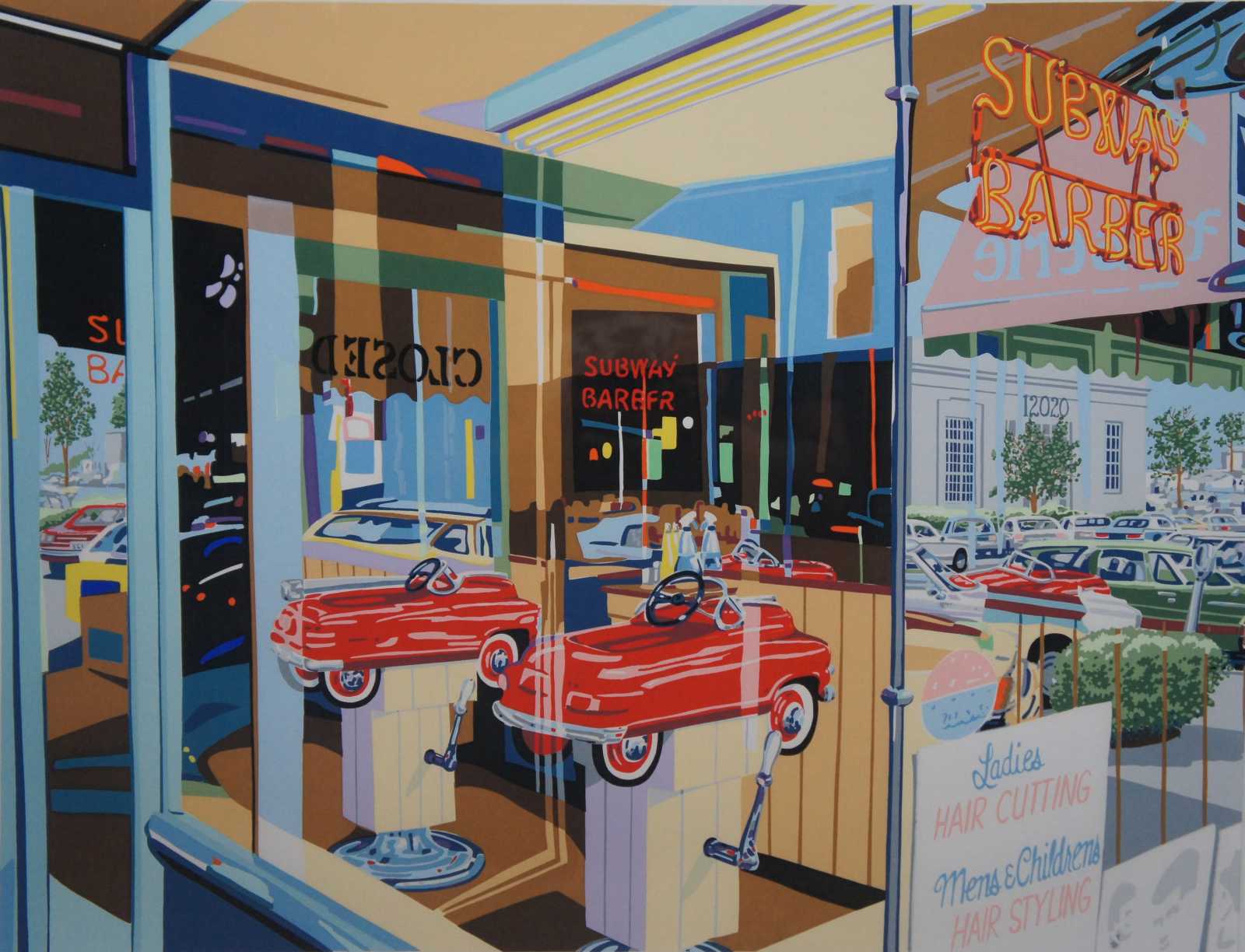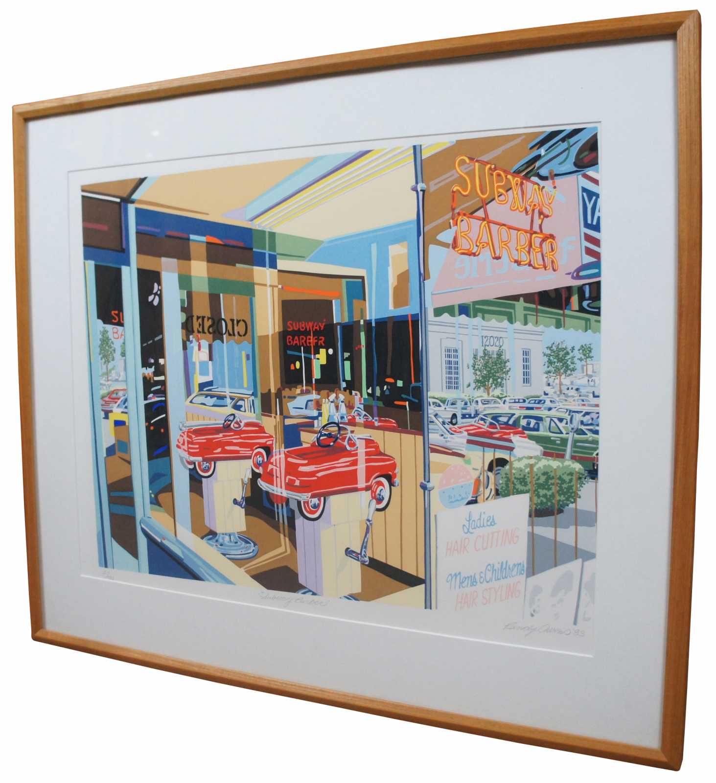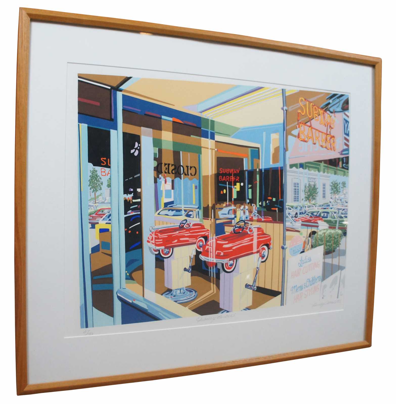 Vintage serigraph print of a small town 1950s style barbershop window with a peddle car titled “Subway Barber” by Randy Owens, 1983, pencil signed and numbered 47/99.