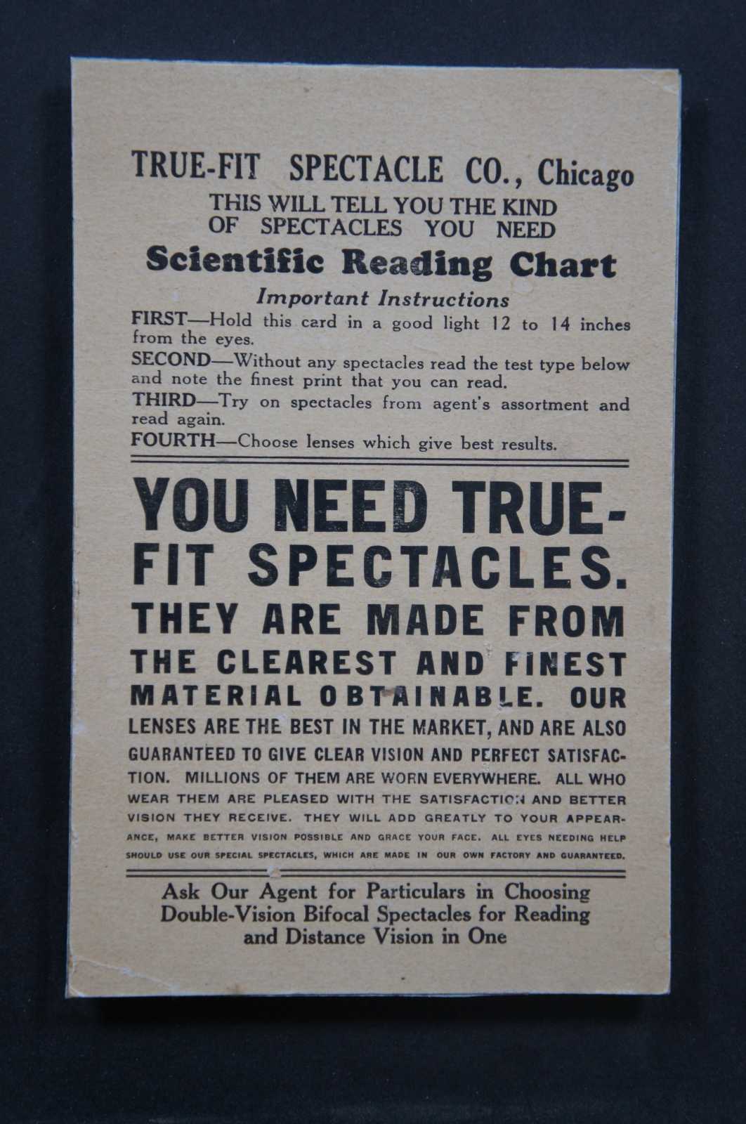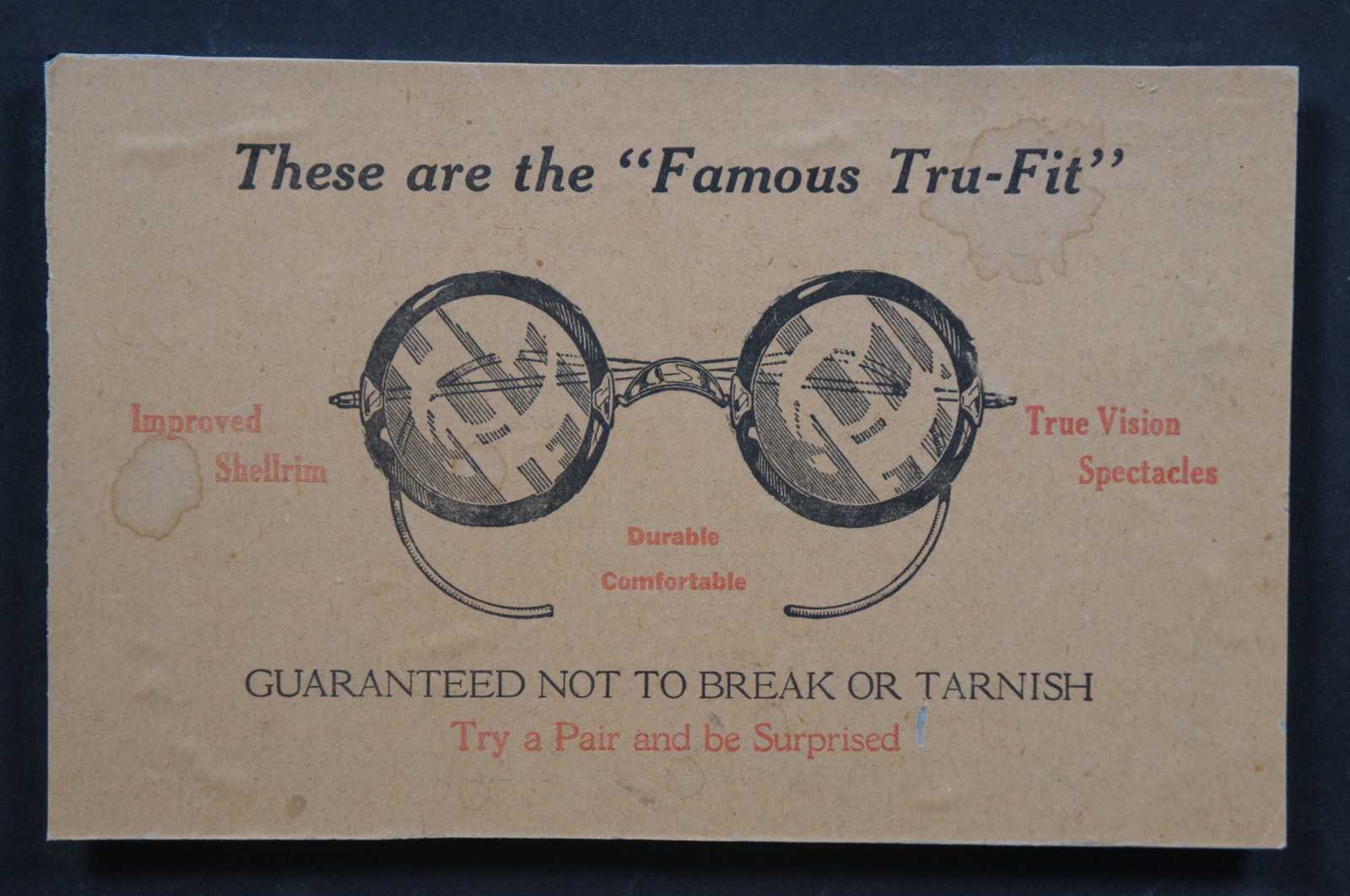 Antique assorted print advertisements and optical company ephemera for True-Fit Spectacles, mounted on cardboard.