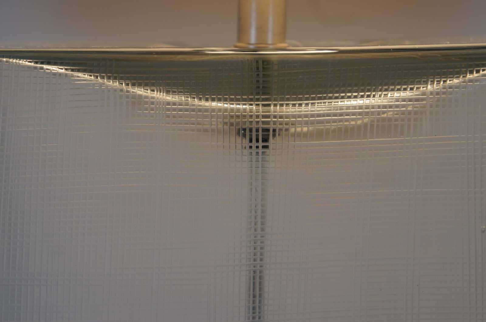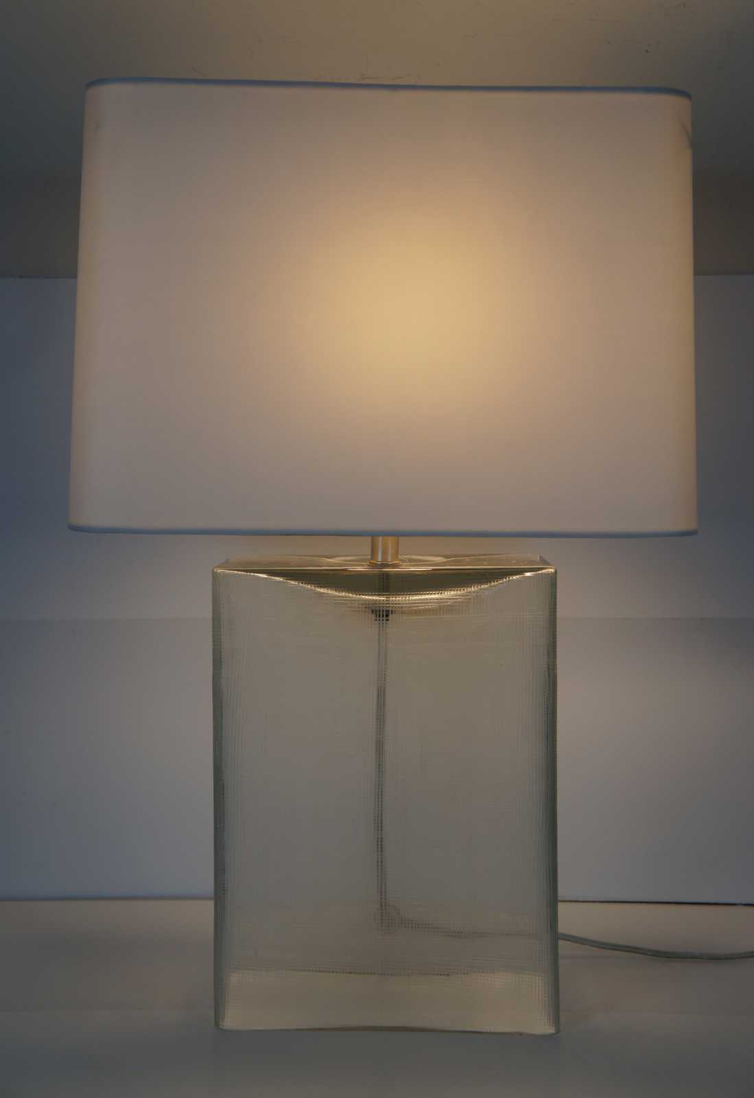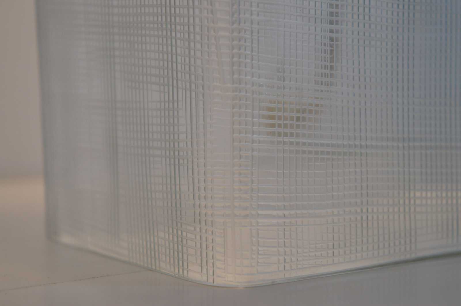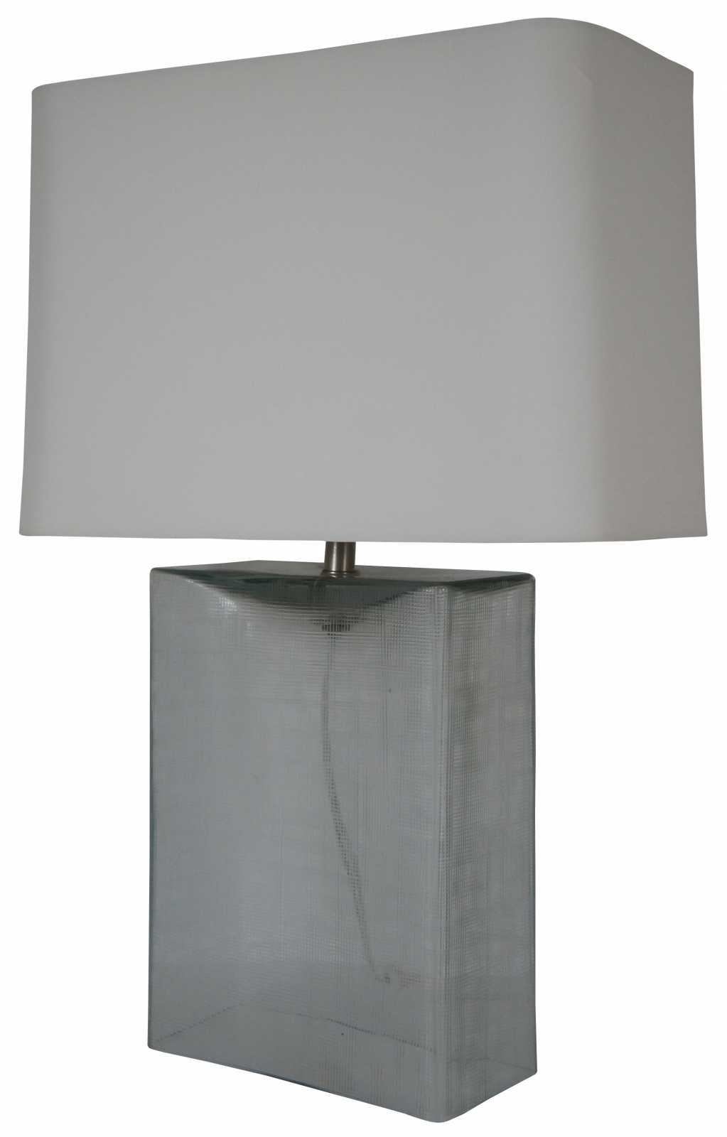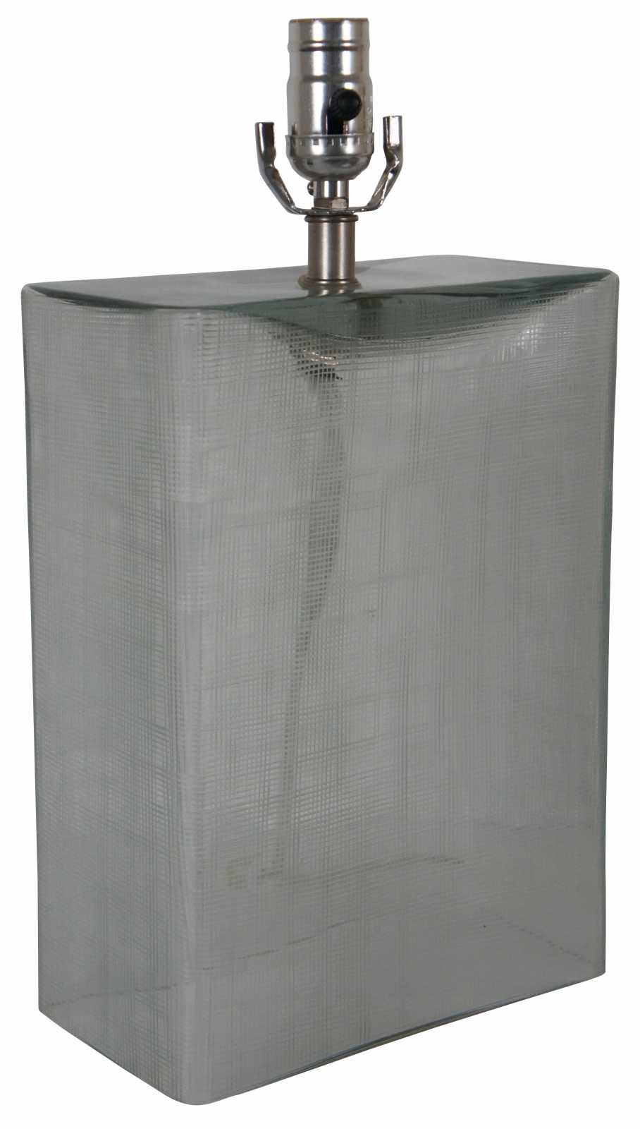 Tanner Kenzie hollow rectangular glass table lamp etched with a criss cross, basket weave pattern and white shade.