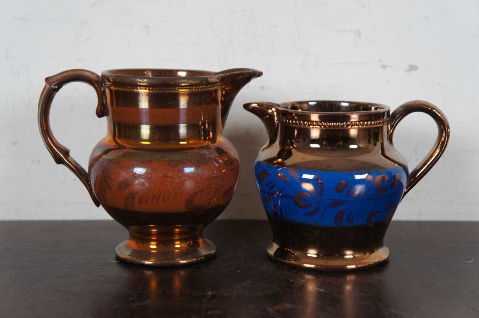 Fourteen assorted pieces of antique 19th and early 20th century copper lustreware pieces. Lot includes: 4 small mugs/demitasse cups, 1 goblet, 1 handle-less cup, 1 large pitcher, 4 medium pitchers, 2 small pitchers/creamers, and 1 sugar bowl.